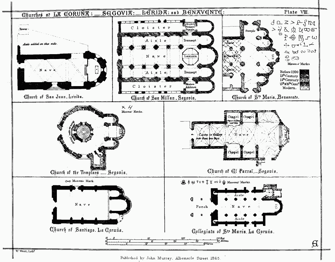 What I have here written will no doubt be supplemented and corrected by others hereafter; and much additional light will, I hope, be thrown upon the history of Spanish buildings and their architects. It will be found that I have referred to many Spanish authorities for the historical facts on which the dates of the buildings I have visited can alone be decided. Of these authorities none is more useful to the architect, none is more creditable to its authors, than the ‘Notices of the Architects and Architecture of Spain, by D. Eugenio Llaguno y Amirola, edited with additions by D. Juan Agustin Cean-Bermudez,’ in four volumes, compiled about the beginning of this century, but not published until A.D. 1829.[1]