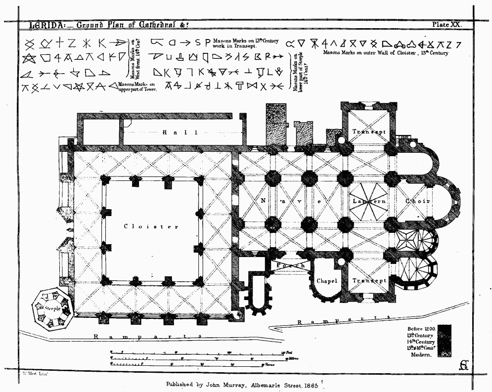 Cementarios is one of the earliest terms used in documents referring to English buildings, and no doubt would be properly translated by the word “mason;” but in the case of the Urgel contract, it seems there were to be several “Lambardos,” and, as “Cementarios” were only to be employed if absolutely necessary, there must have been some distinction between them, which was more probably of grade or degree than of profession. Possibly the “Lambardos” may have been members of a guild, “Cementarios” common masons.