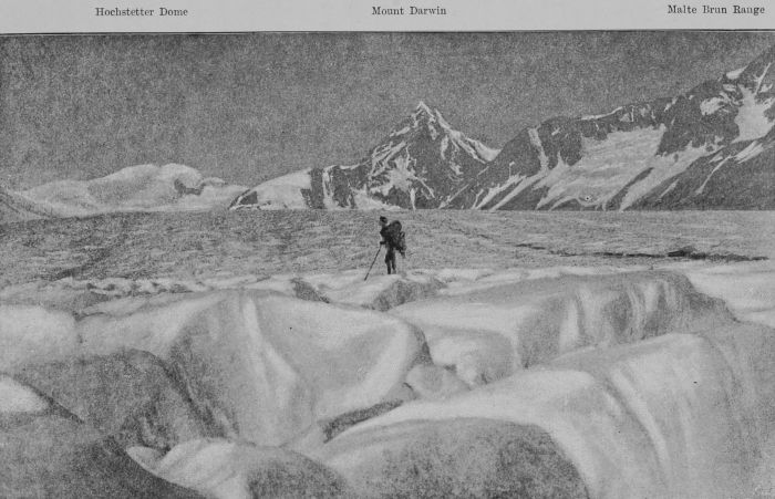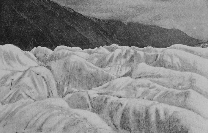 His excursions on the glaciers appear to have been confined to a short trip up the Tasman, probably to some six miles or [134]so from the terminal face, and a short exploration of the lower portions of the Mueller and Hooker Glaciers.