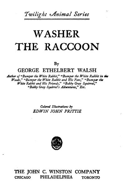 Washer was the youngest of a family of three Raccoons, born in the woods close to the shores of Beaver Pond, and not half a mile from Rocky Falls where the water, as you know, turns into silvery spray that sparkles in the sun-shine like diamonds and rubies. And, indeed, the animals and birds of the North Woods much prefer this glittering spray and foam that rise in a steady cloud from the bottom of the falls to all the jewels and gems ever dug out of the earth! For, though each drop sparkles but a moment, and then vanishes from sight, there are a million others to follow it, and when you bathe in them they wash and scour away the dirt, and make you clean and fresh in body and soul.