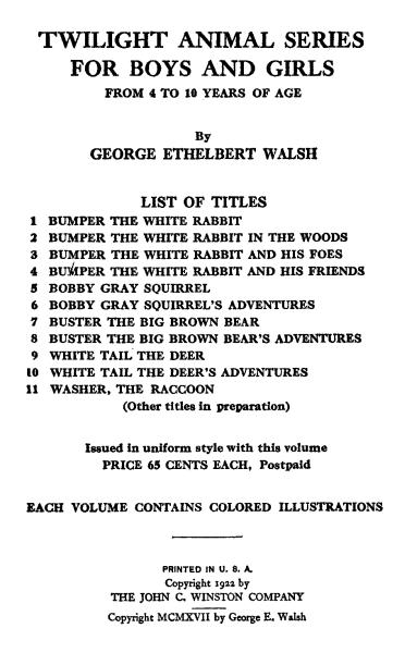 Another thing we should remember. By leaving them in the books, hundreds and thousands of other boys and girls can enjoy them, too, sharing with us the pleasures of the imagination, which after all is one of the greatest things in the world. In gathering them together in a real menagerie, we would be selfish both to Bumper, Bobby, Buster, White Tail and their friends as well as to thousands of other little readers who could not share them with us. So these books of Twilight Animal Stories are dedicated to all little boys and girls who love wild animals. All others are forbidden to read them! They wouldn’t understand them if they did.