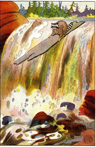 He saw the top of the falls ahead. Toward that he was being hurried, and the further he drifted the rougher grew the waters. His board pitched and tossed, making it difficult for the baby Raccoon to cling to it.