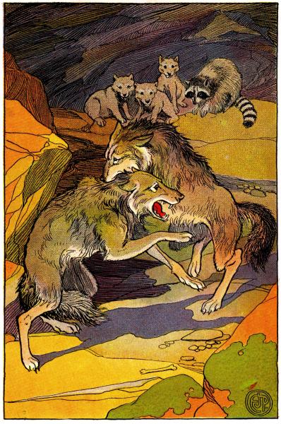 Washer was very lonely without his mother or brothers, and very homesick; but the little wolves were so playful they gave him little time to think of his worry. Whenever he curled up in a corner to mope and sigh, one of the cubs was sure to creep up behind and roll all over him. Sometimes they got so mixed up that it was difficult for Mother Wolf to tell her own children from the raccoon.