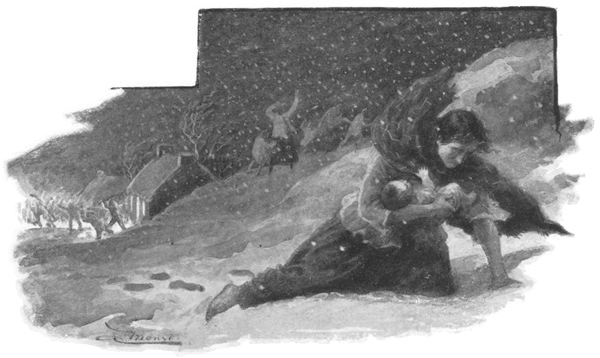 By degrees, as he presses on, the path becomes rougher, the trees deepen the darkness overhead, and hardly a former footstep has left its trace in the undrifted snow. The solitude might almost208 be primeval, so absolute is the silence in these untrodden recesses. The solitary snapping, once, of a rime-laden branch has only testified amid the stillness to the intensity of the frost. At last, however, the path widens somewhat, there is a little clearing and a forsaken lodge, and beyond, here and there in the open, gleam the scattered lights of the village. A sequestered spot it is, bowered in summer by the whispering woods, and in winter buried in the forest solitudes by the swathing snow.