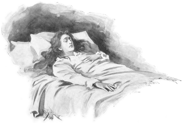Alone, for the last time, with all that is dear to him, the flower that is fading out of his life so soon! He turns to the bed. There, pale with preternatural loveliness, her dark hair spread like a cloud upon the pillow, lies the sunny sweetheart, the shy bride of a year ago. A203 faint moan, the glistening of a tear between the closed eyelids, betrays the grief that is haunting that strange shadowland between this world and the next—grief for that which was not to be! He can look no more! Sinking into a chair by the fire, he buries his face in his hands. It is the hour of his despair.