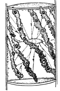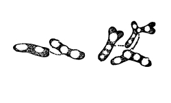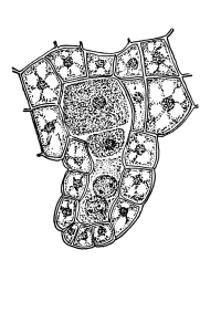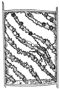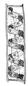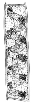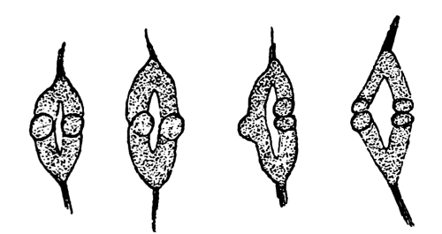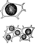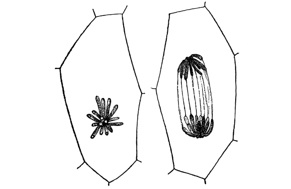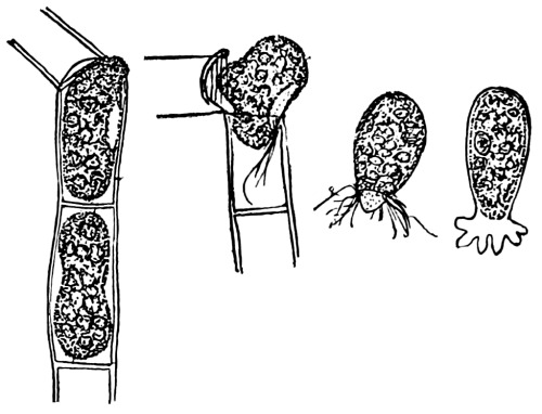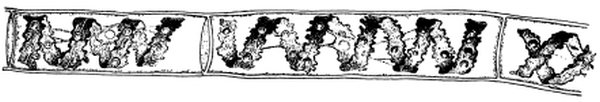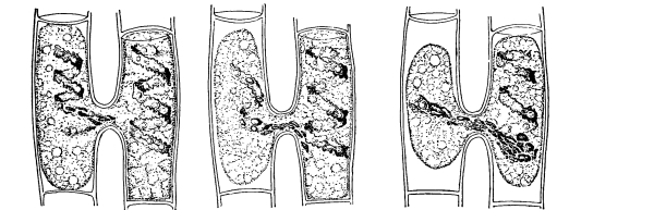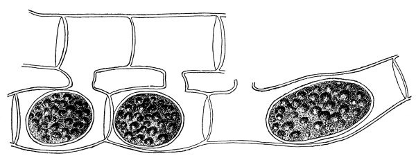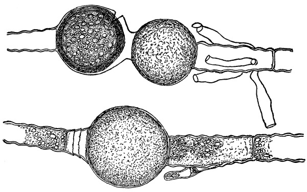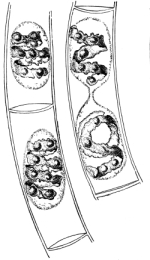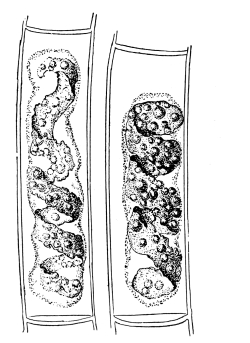 [2] If spirogyra is forming fruit some of the threads will be lying parallel in pairs, and connected with short tubes. In some of the cells there will be found rounded or oval bodies known as zygospores. These may be seen in fig. 86, and will be described in another part of the book.