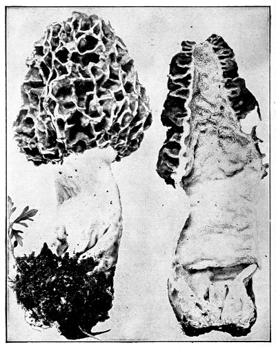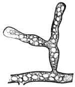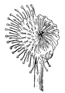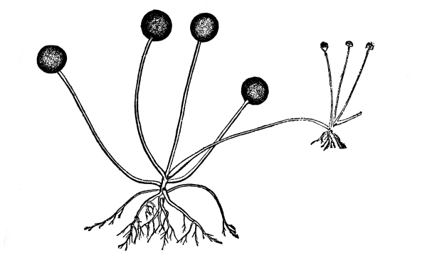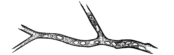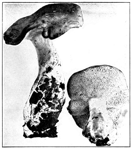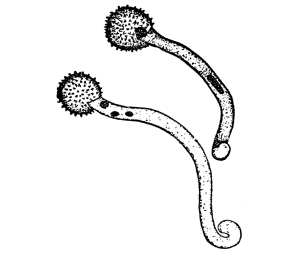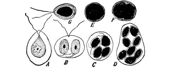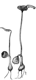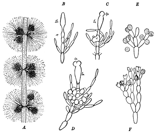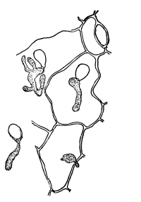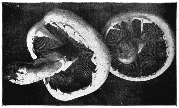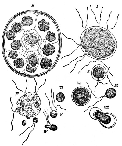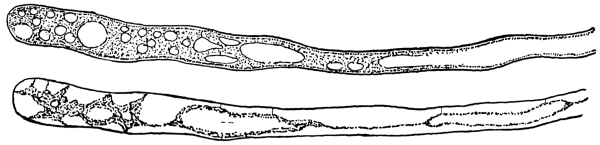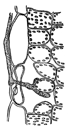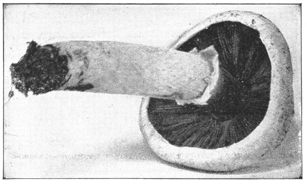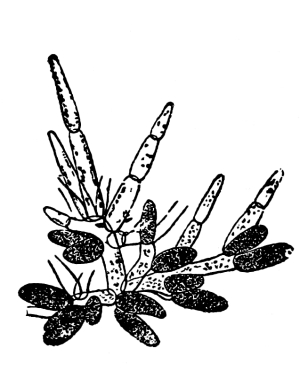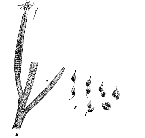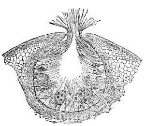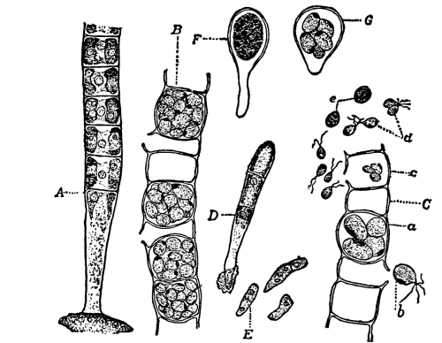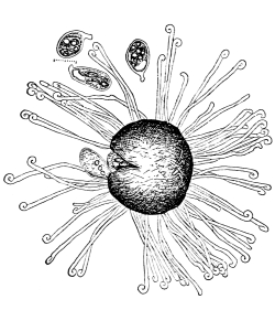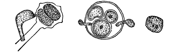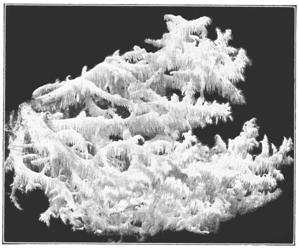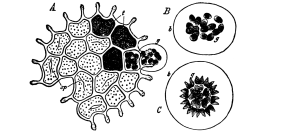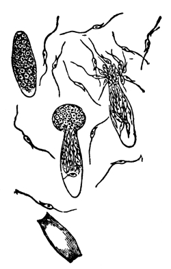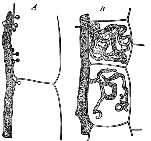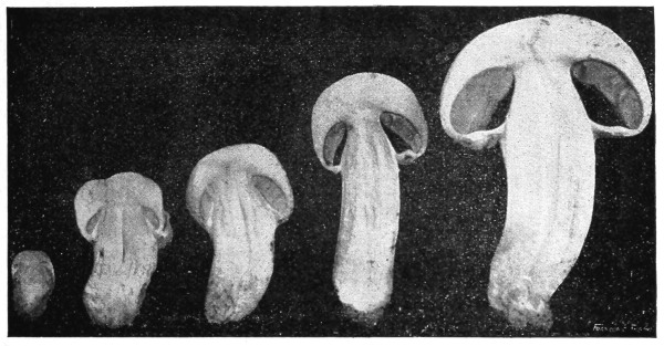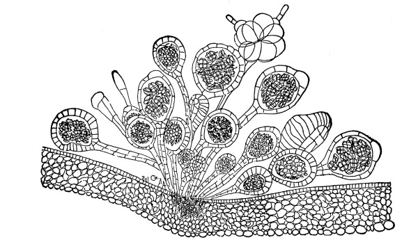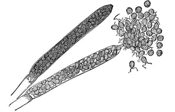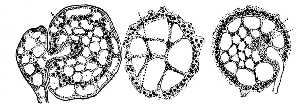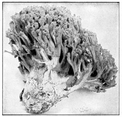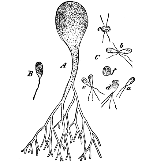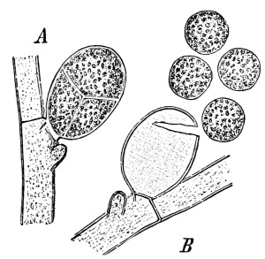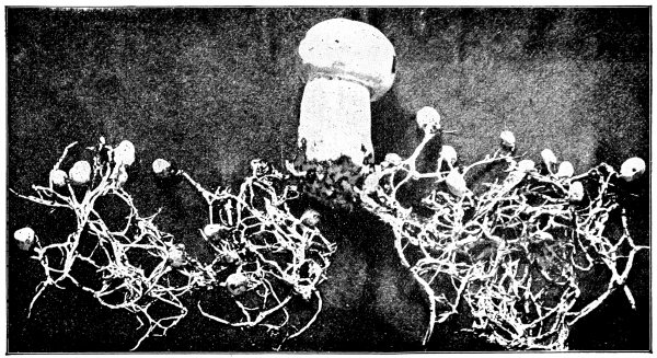 [19] Class Myxomycetes, or Mycetozoa.—To this class belong the “slime molds,” low organisms consisting of masses of naked protoplasm which flows among decaying leaves and in decaying wood, coming to the surface to fruit. The fruit in many cases resembles miniature puff-balls, and these plants were formerly classed with the puff-balls. The spores germinate by forming swarm spores which unite to form a small plasmodium, which in turn grows to form a large plasmodium or protoplasmic mass. It is doubtful if they are any more plant than animal organisms. Examples: Trichia, Arcyria, Stemonitis, Physarum, Ceratiomyxa, etc., on rotten wood; Plasmodiophora brassicæ is a parasite causing club foot of cabbage, radishes, etc. It lives within the roots, causing large knots and swellings on the same.