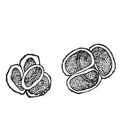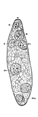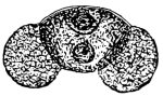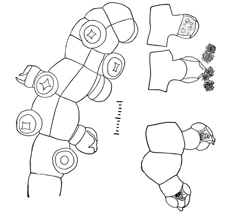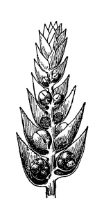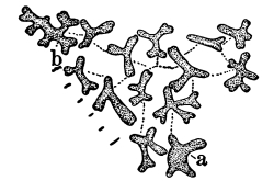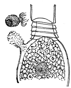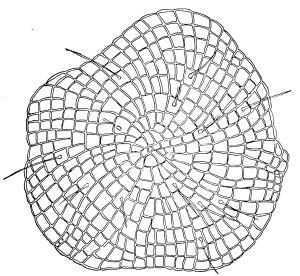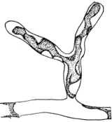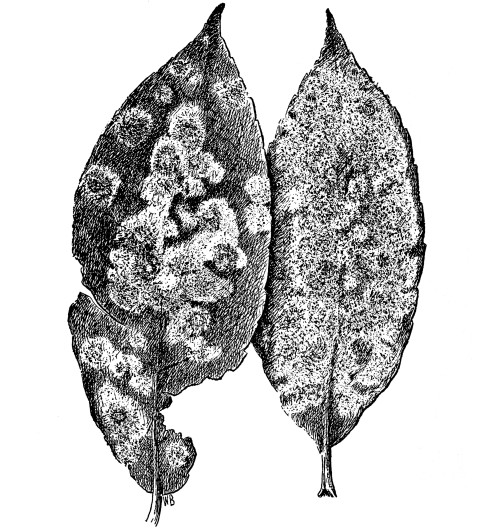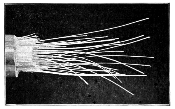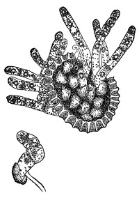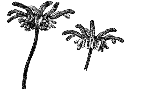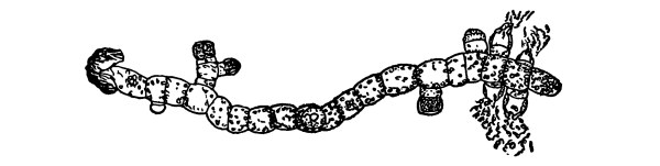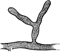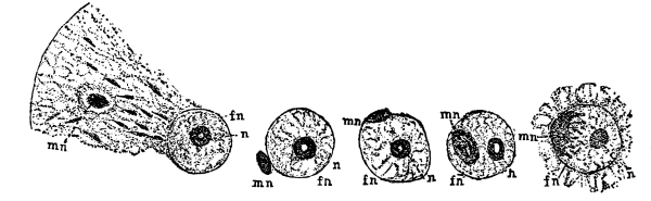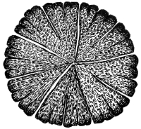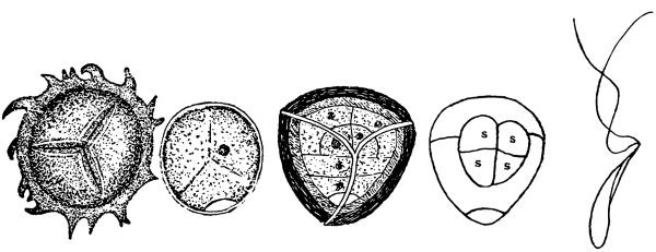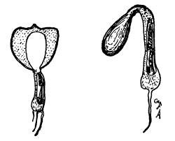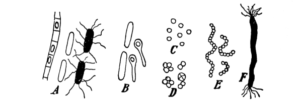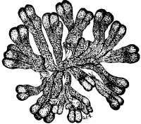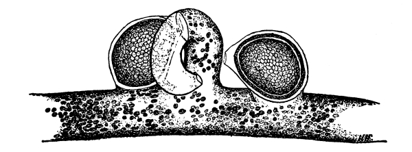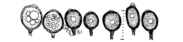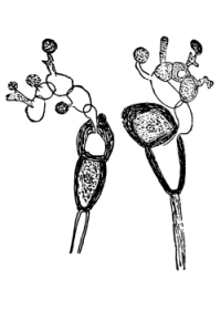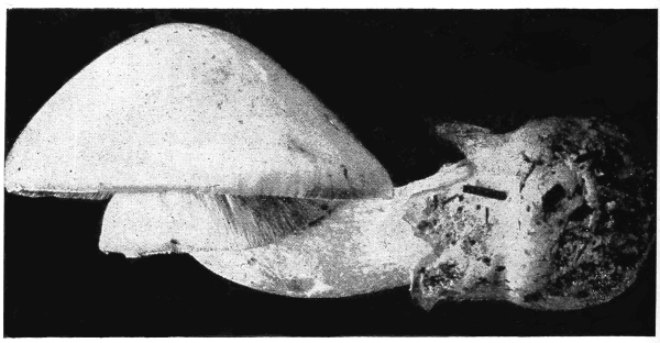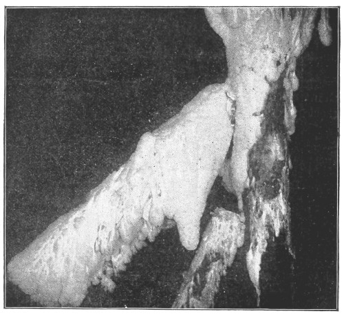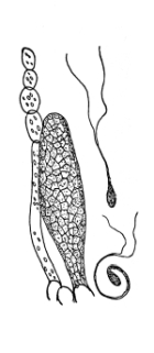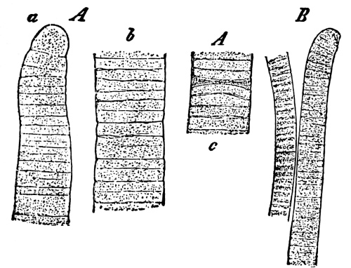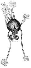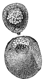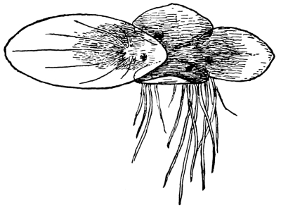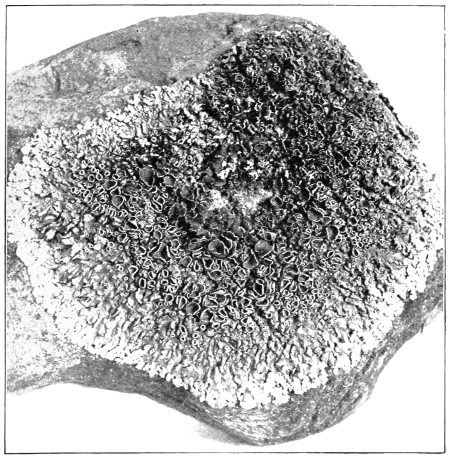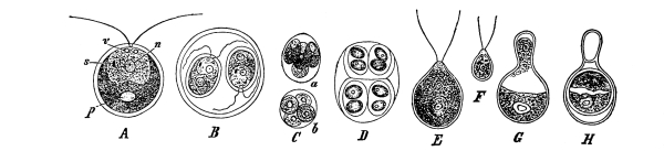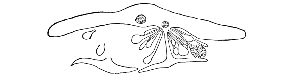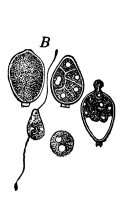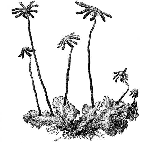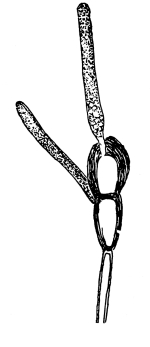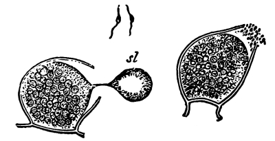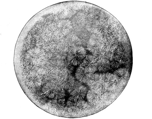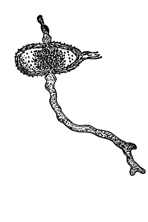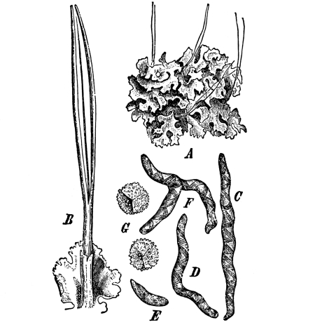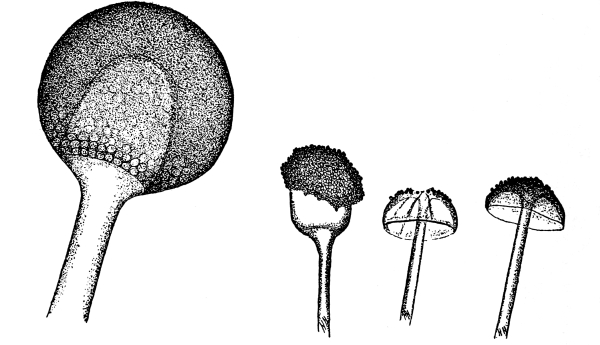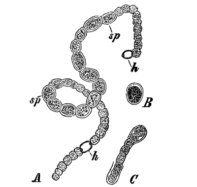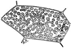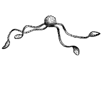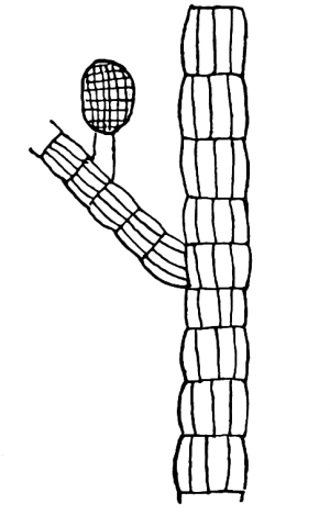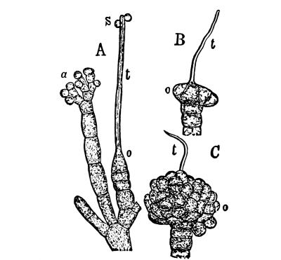 [19] Class Myxomycetes, or Mycetozoa.—To this class belong the “slime molds,” low organisms consisting of masses of naked protoplasm which flows among decaying leaves and in decaying wood, coming to the surface to fruit. The fruit in many cases resembles miniature puff-balls, and these plants were formerly classed with the puff-balls. The spores germinate by forming swarm spores which unite to form a small plasmodium, which in turn grows to form a large plasmodium or protoplasmic mass. It is doubtful if they are any more plant than animal organisms. Examples: Trichia, Arcyria, Stemonitis, Physarum, Ceratiomyxa, etc., on rotten wood; Plasmodiophora brassicæ is a parasite causing club foot of cabbage, radishes, etc. It lives within the roots, causing large knots and swellings on the same.