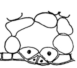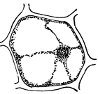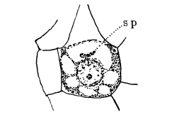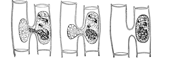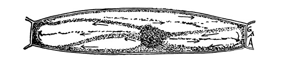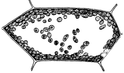 [4] We should note that the coloring matter of the beet resides in the cell-sap. It is in these colored cells that we can best see the movement take place, since the red color serves to differentiate well the moving mass from the cell wall. The protoplasmic membrane at several points usually clings tenaciously so that at several places the membrane is arched strongly away from the cell wall as shown in fig. 24. While water is removed from the cell-sap, we note that the coloring matter does not escape through the protoplasmic membrane.