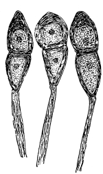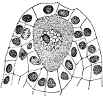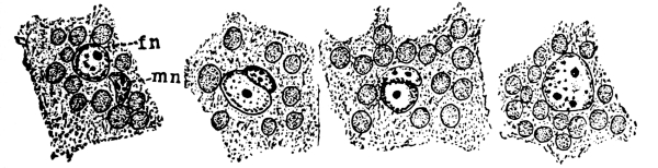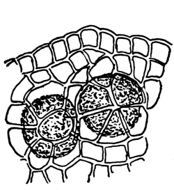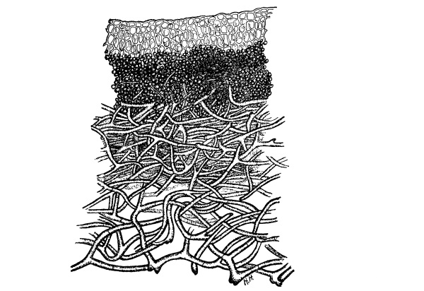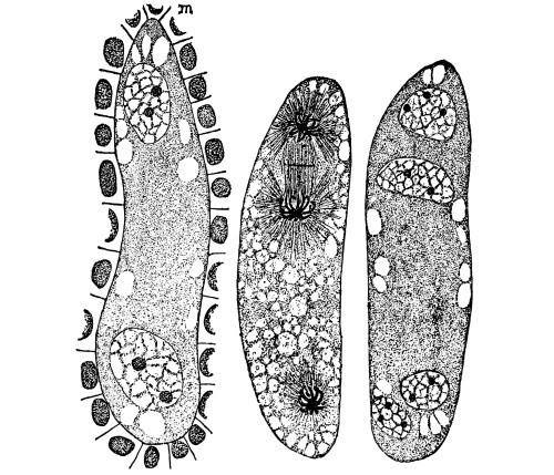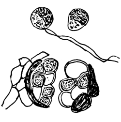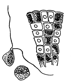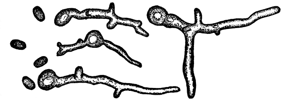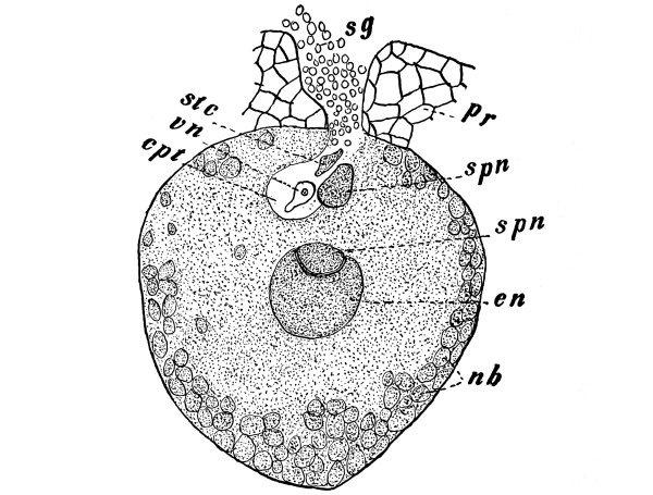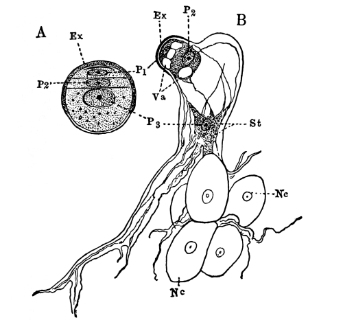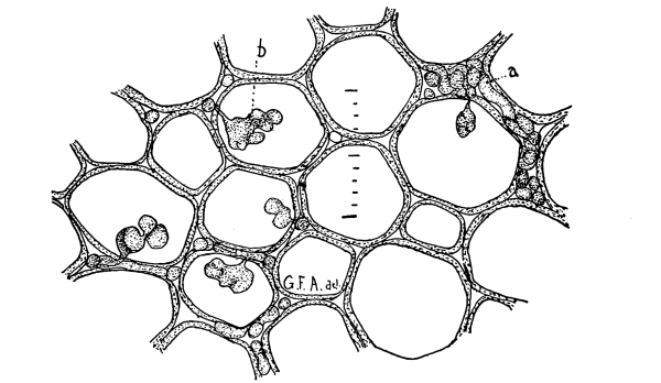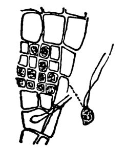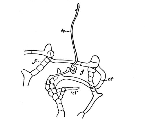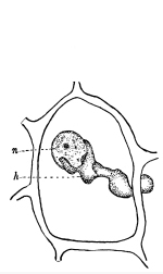 [14] Evidence points to the belief that certain cells of the host form substances which attract, chemitropically, the fungus threads, and that in these cells the fungus threads are more abundant than in others. Furthermore in the vicinity of the nucleus of the host seems to be the place where these activities are more marked.