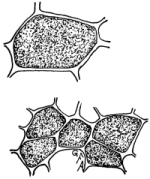 [7] This ring and the bundles separate the stem into two regions, an outer one composed of large cells with thin walls, known as the cortical cells, or collectively the cortex. The inner portion, corresponding to what is called the pith, is made up of the same kind of cells and is called the medulla, or pith. When the cells of the cortex, as well as of the pith, remain thin walled the tissue is called parenchyma. Parenchyma belongs to the group of tissues called fundamental.
