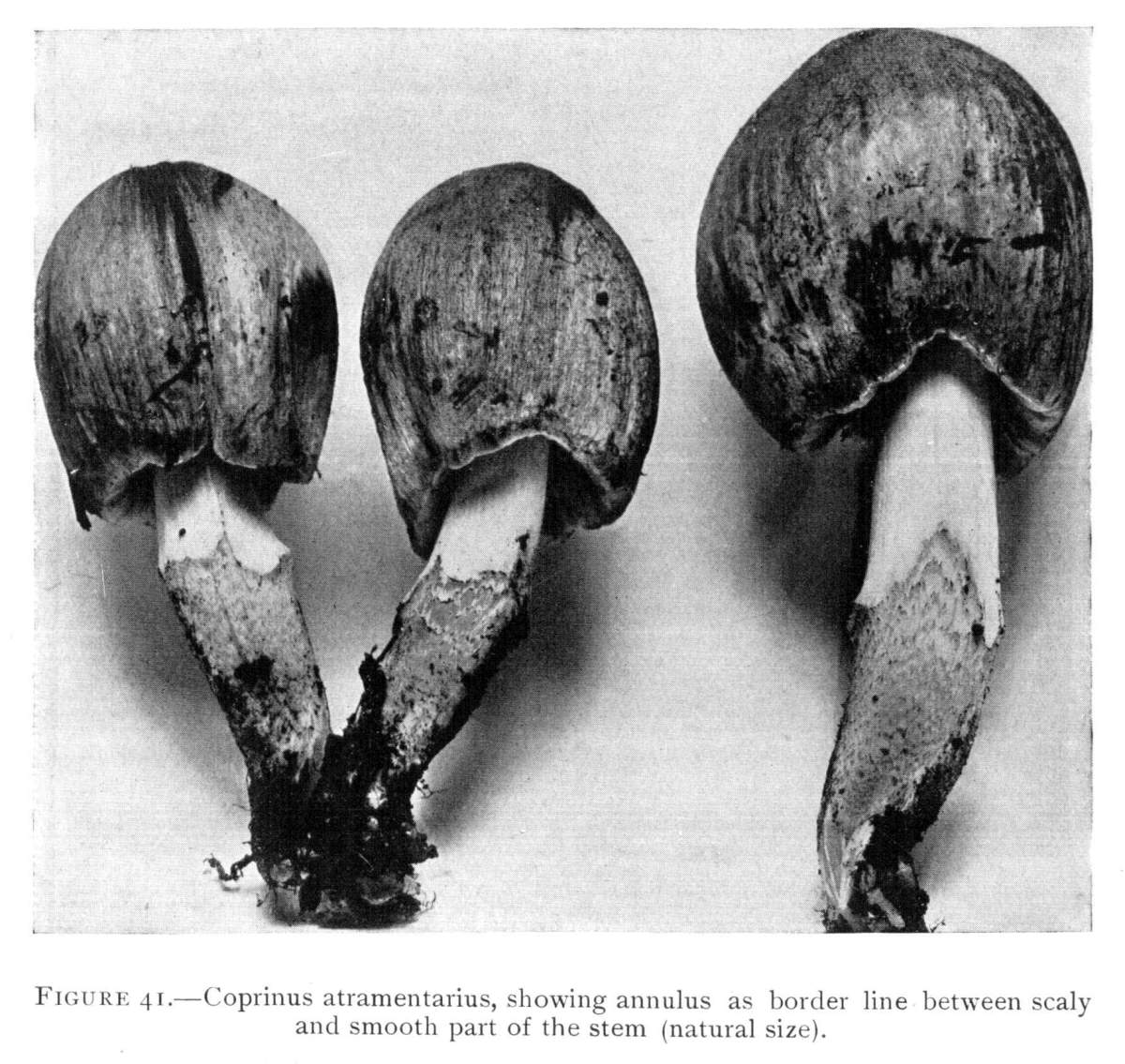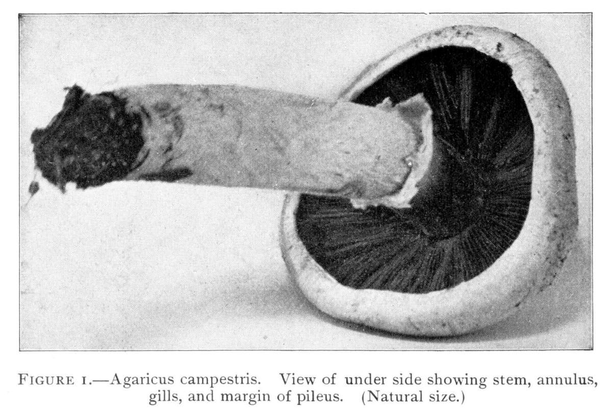 Figure. 1.—Agaricus campestris. View of under side showing stem, annulus, gills, and margin of pileus. (Natural size.)