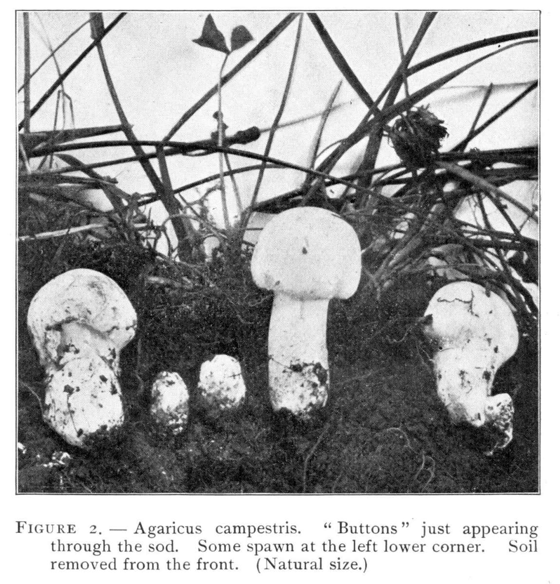 Figure 2.—Agaricus campestris. "Buttons" just appearing through the sod. Some spawn at the left lower corner. Soil removed from the front. (Natural size.)