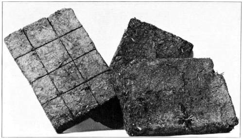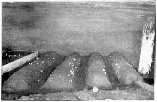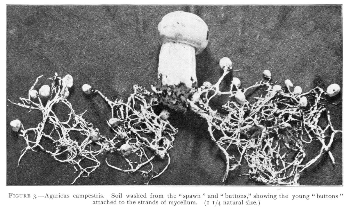Mushroom Spawn is in the Form of Strands of Mycelium.—Now in the mushrooms the threads of mycelium are usually interlaced into definite strands or cords, especially when the mycelium is well developed. In some species these strands become very long, and are dark brown in color. Each thread of mycelium grows, or increases in length, at the end. Each one of the threads grows independently, though all are intertwined in the strand. In this way the strand of mycelium increases in length. It even branches as it extends itself through the soil.
