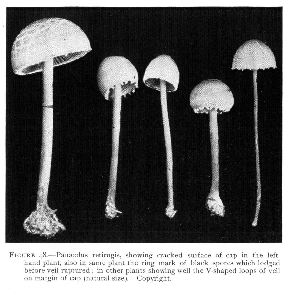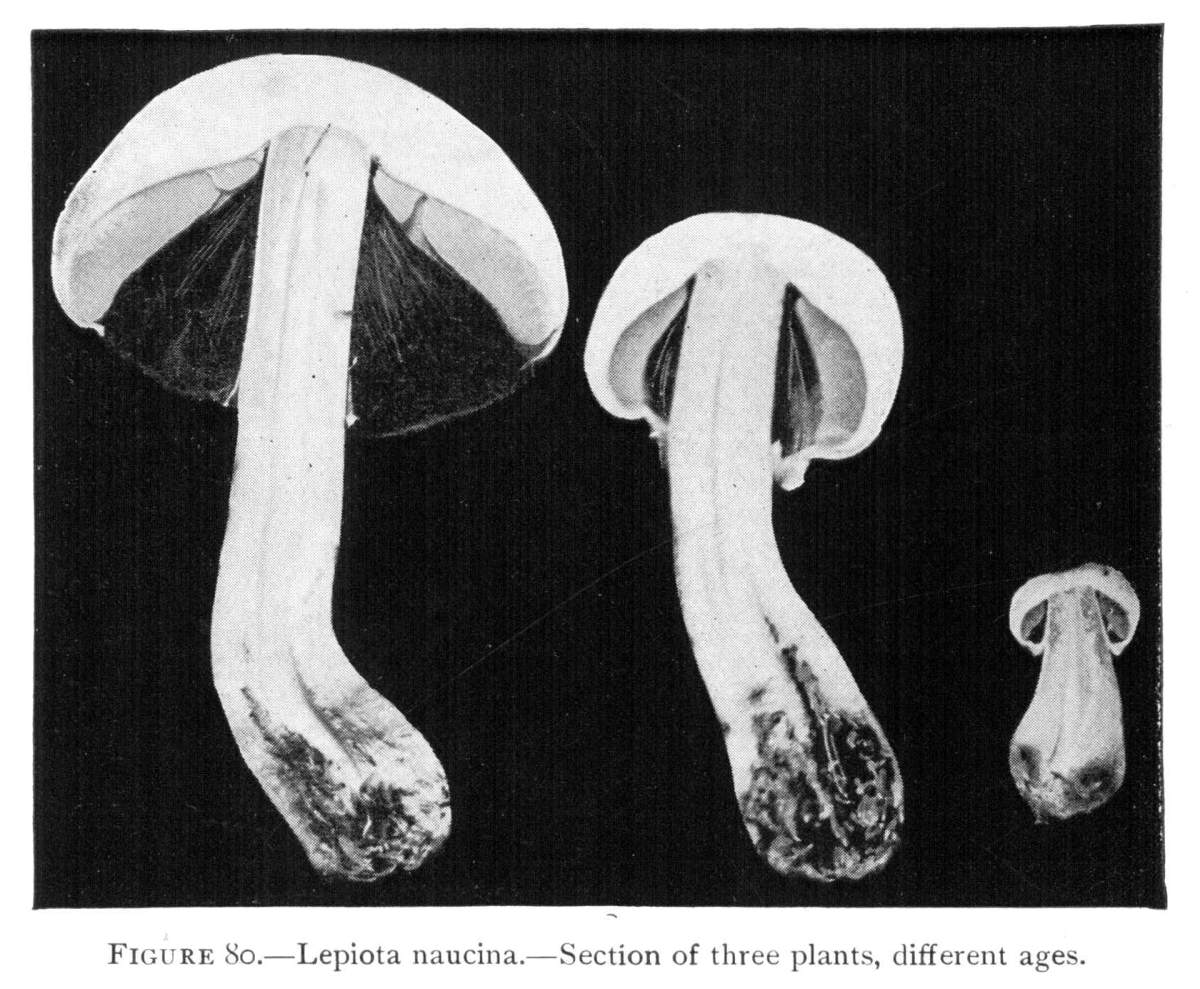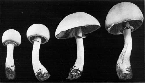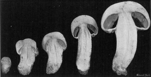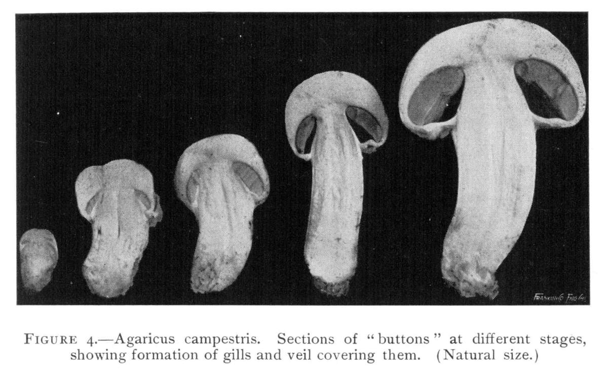 From the Button Stage to the Mushroom.—If we split several of the buttons of different sizes down through the middle, we shall be able to see the position of the gills covered by the veil during their formation. These stages are illustrated in Fig. 4.