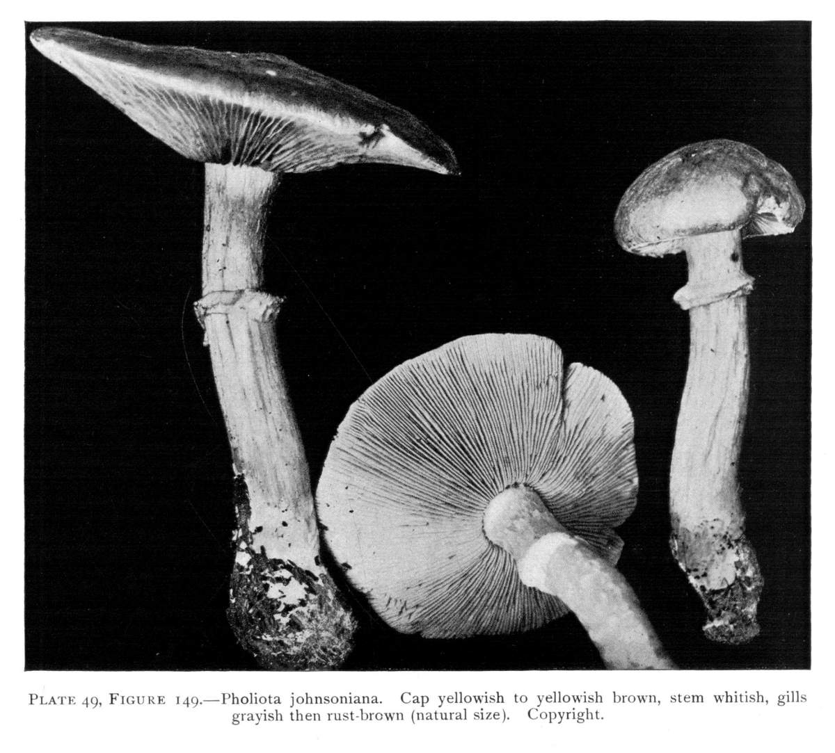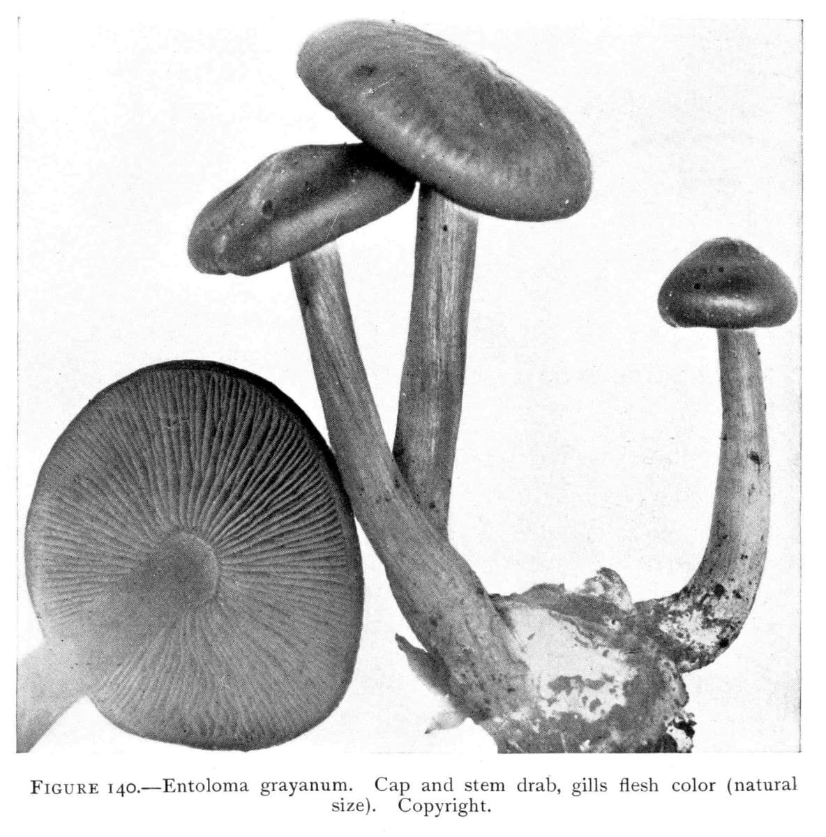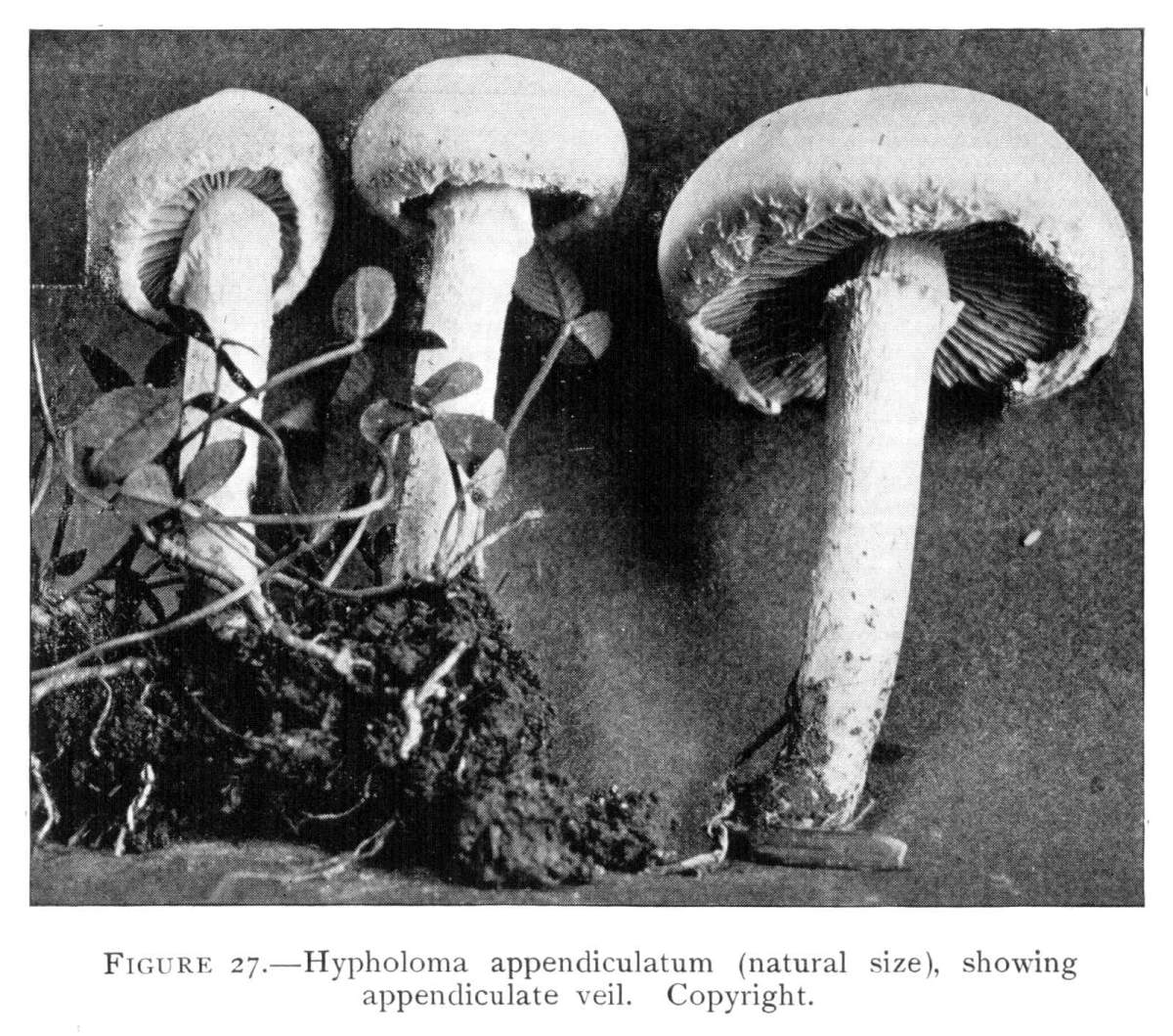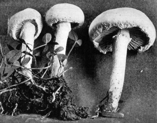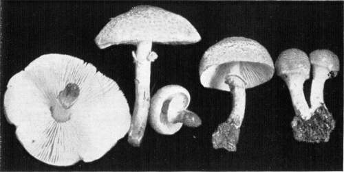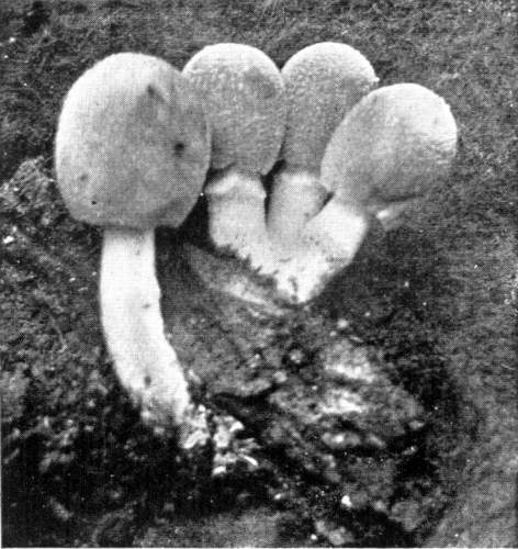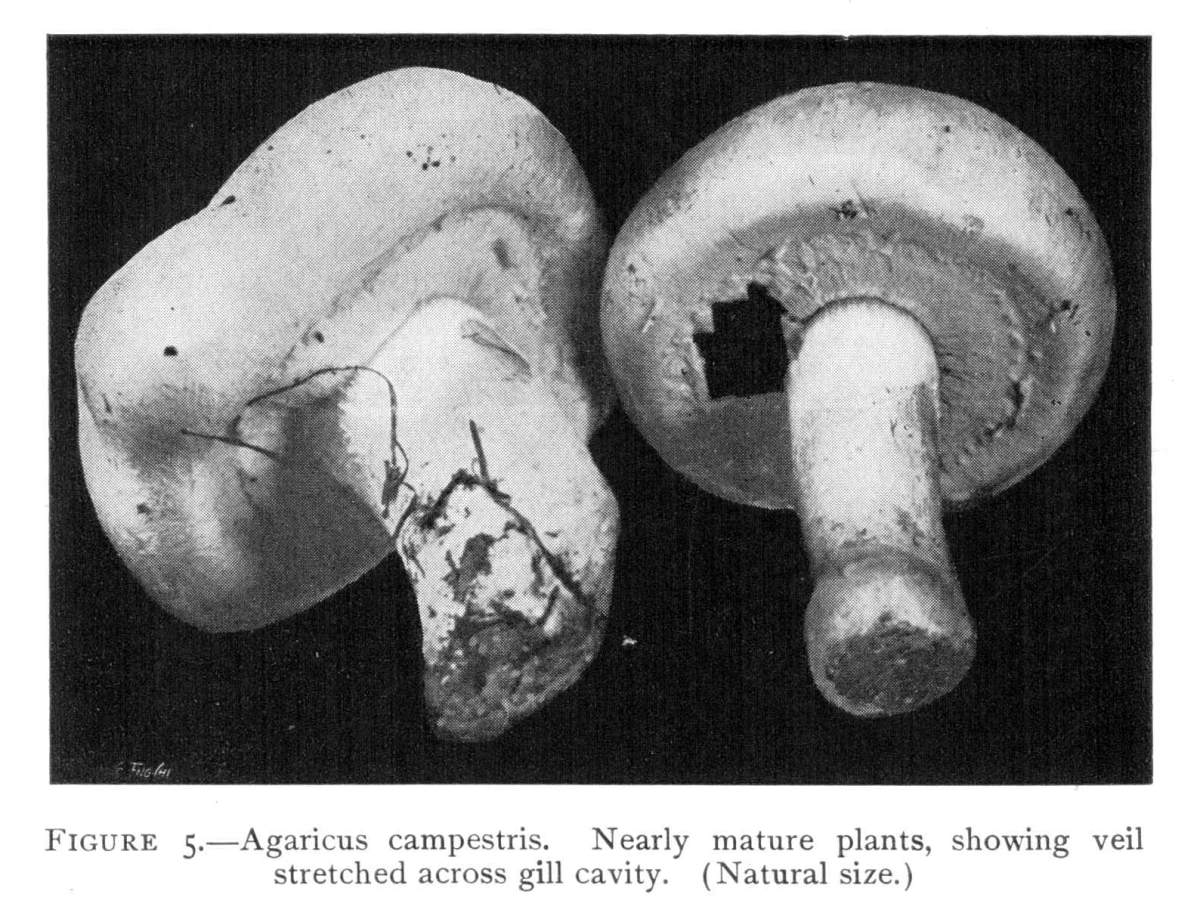 Figure 5.—Agaricus campestris. Nearly mature plants, showing veil stretched across gill cavity. (Natural size.)