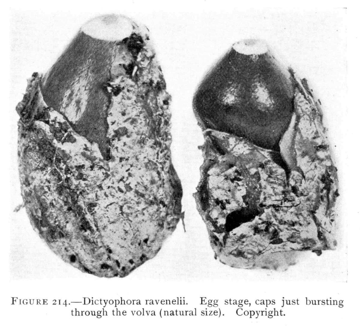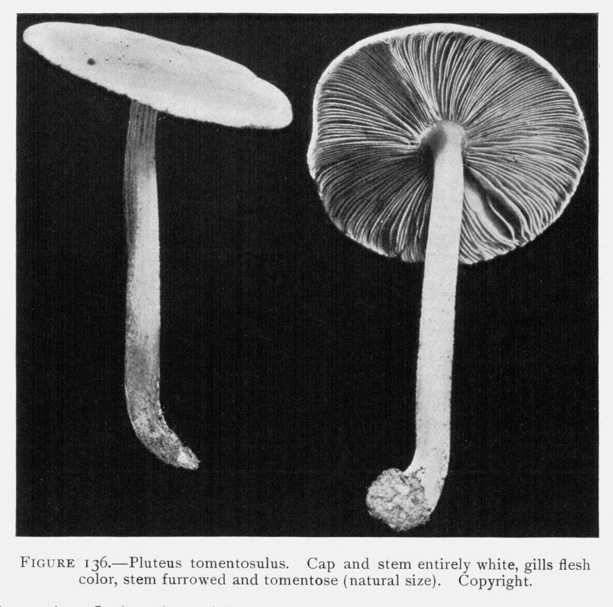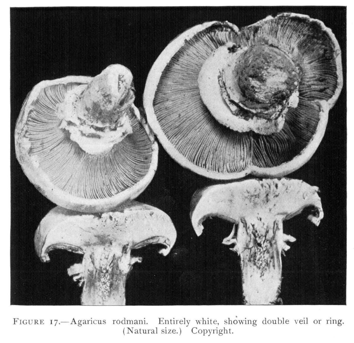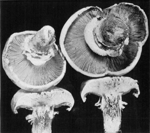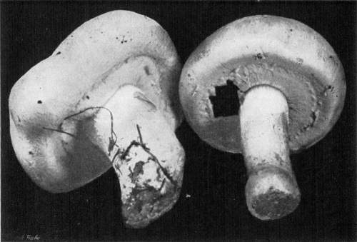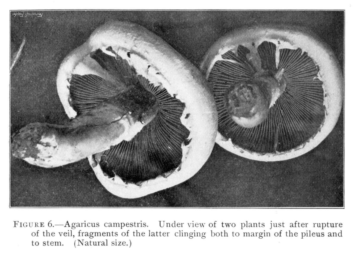 Figure 6.—Agaricus campestris. Under view of two plants just after rupture of the veil, fragments of the latter clinging both to margin of the pileus and to stem. (Natural size.)