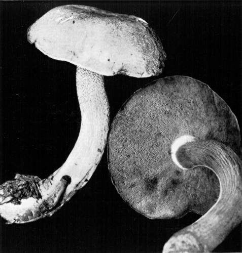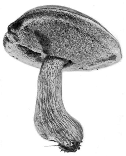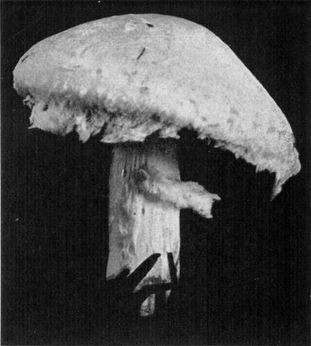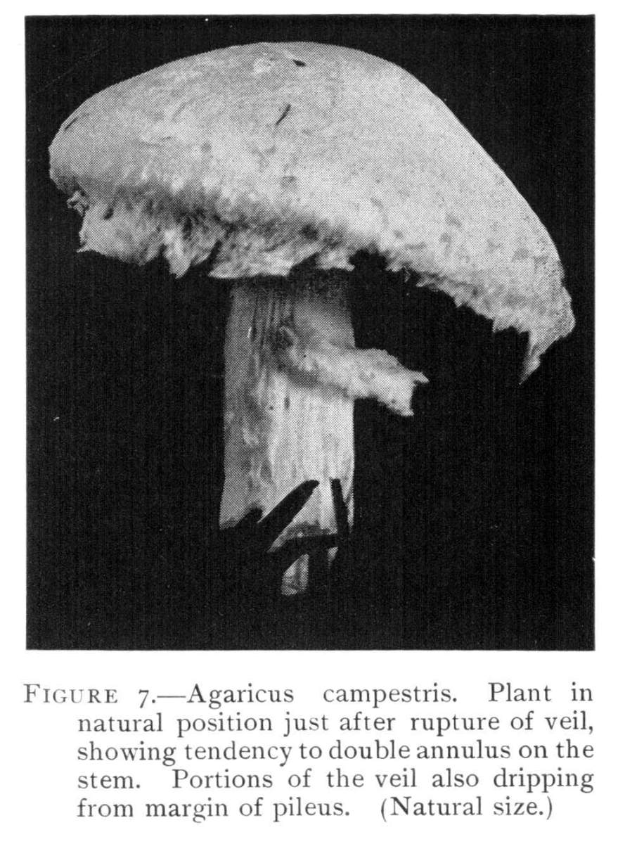Figure 7.—Agaricus campestris. Plant in natural position just after rupture of veil, showing tendency to double annulus on the stem. Portions of the veil also dripping from margin of pileus. (Natural size.)