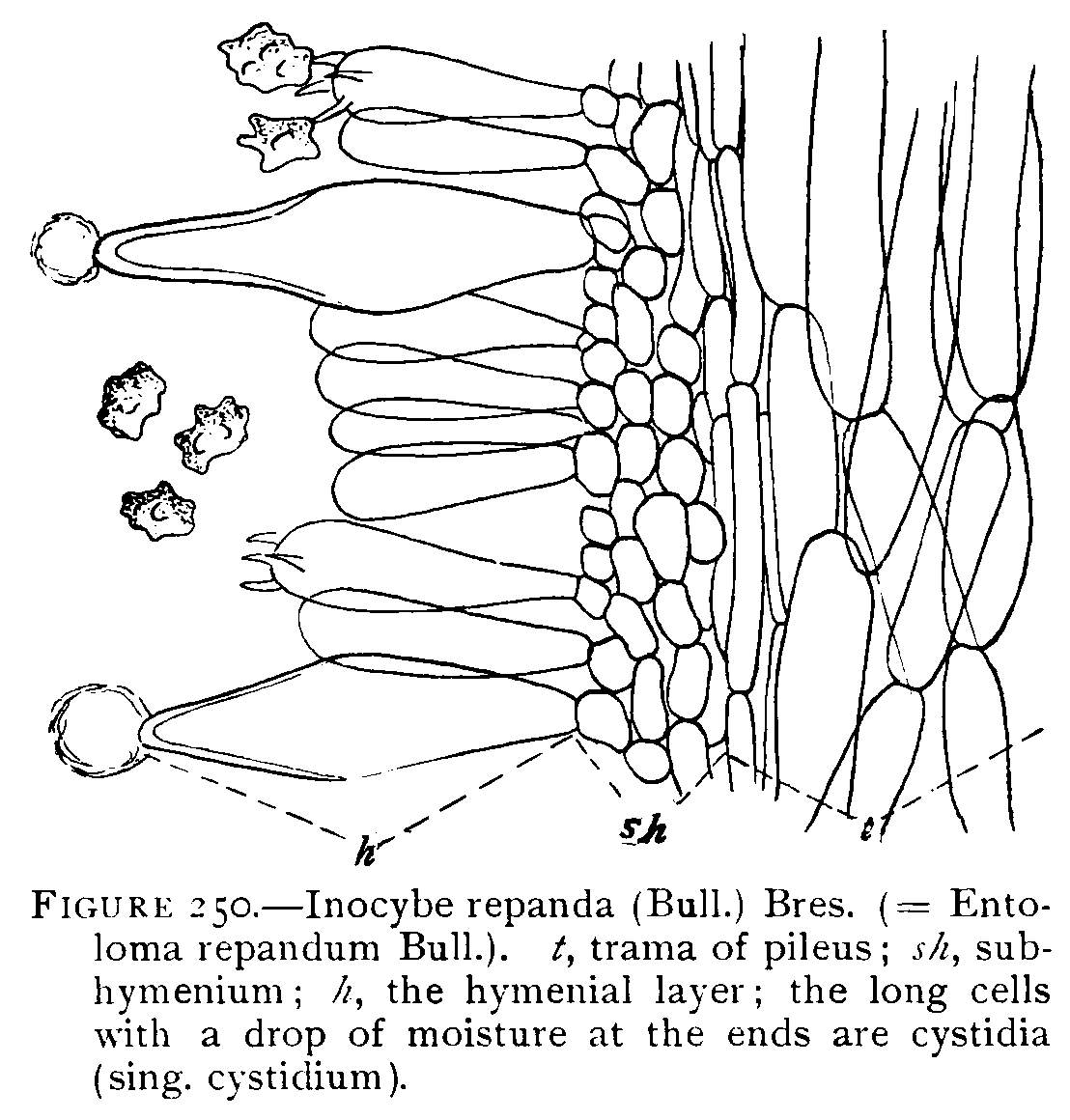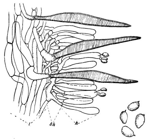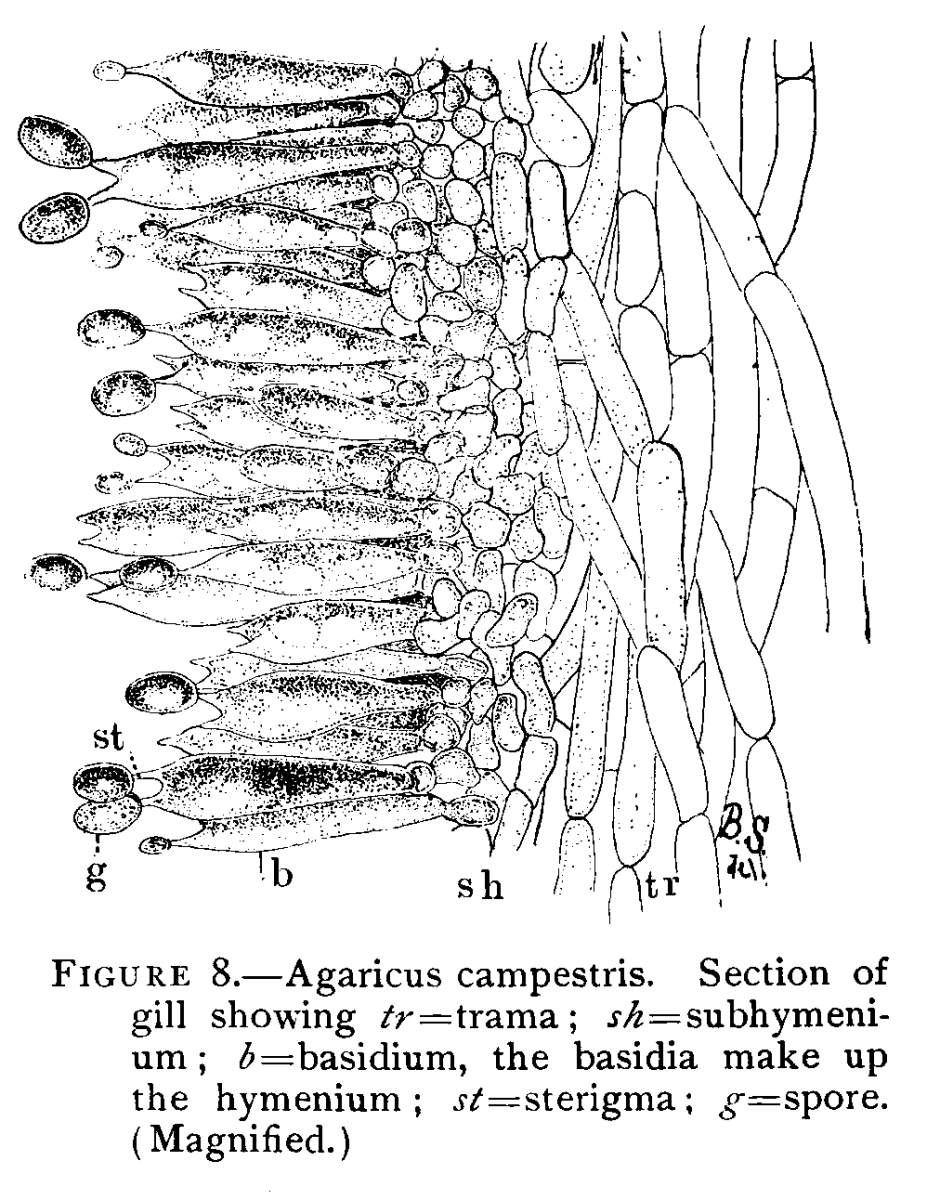 Structure of a Gill.—In Fig. 8 is shown a portion of a section across one of the gills, and it is easy to see in what manner the spores are borne. The gill is made up, as the illustration[Pg 9] shows, of mycelium threads. The center of the gill is called the trama. The trama in the case of this plant is made up of threads with rather long cells. Toward the outside of the trama the cells branch into short cells, which make a thin layer. This forms the sub-hymenium. The sub-hymenium in turn gives rise to long club-shaped cells which stand parallel to each other at right angles to the surface of the gill. The entire surface of the gill is covered with these club-shaped cells called basidia (sing. basidium). Each of these club-shaped cells bears either two or four spinous processes called sterígmata (sing. sterígma), and these in turn each bear a spore. All these points are well shown in Fig. 8. The basidia together make up the hymenium.