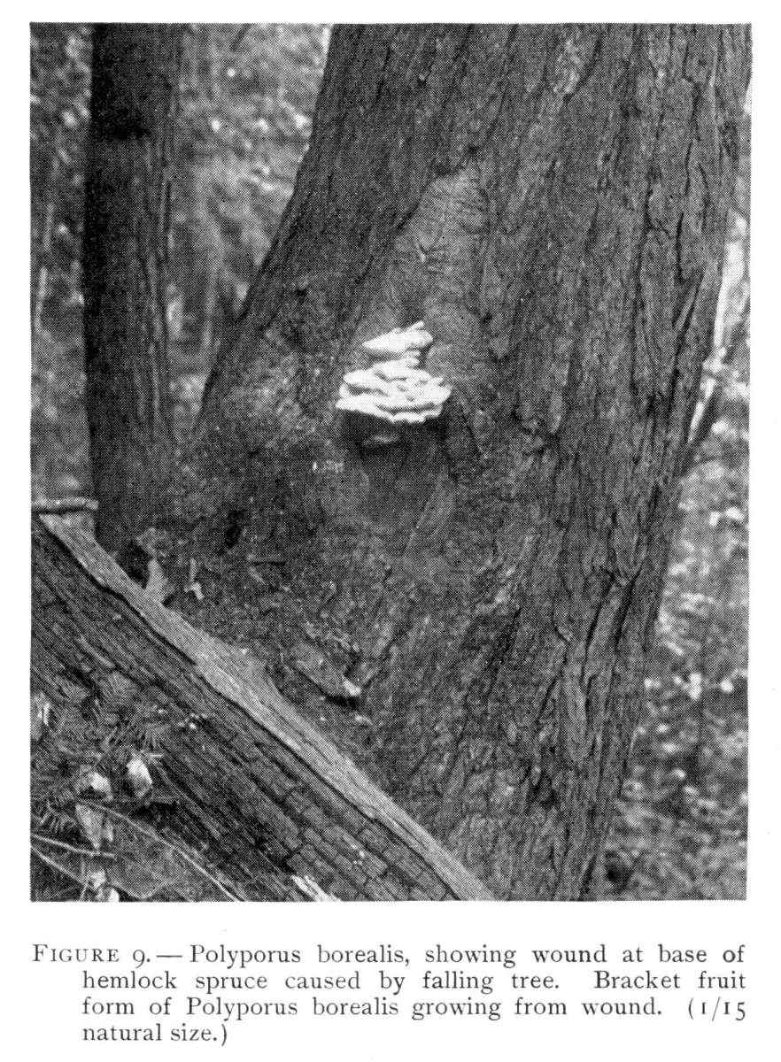 Figure 9.—Polyporus borealis, showing wound at base of hemlock spruce caused by falling tree. Bracket fruit form of Polyporus borealis growing from wound. (1/15 natural size.)
