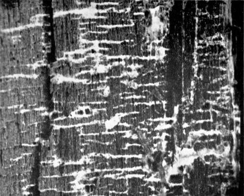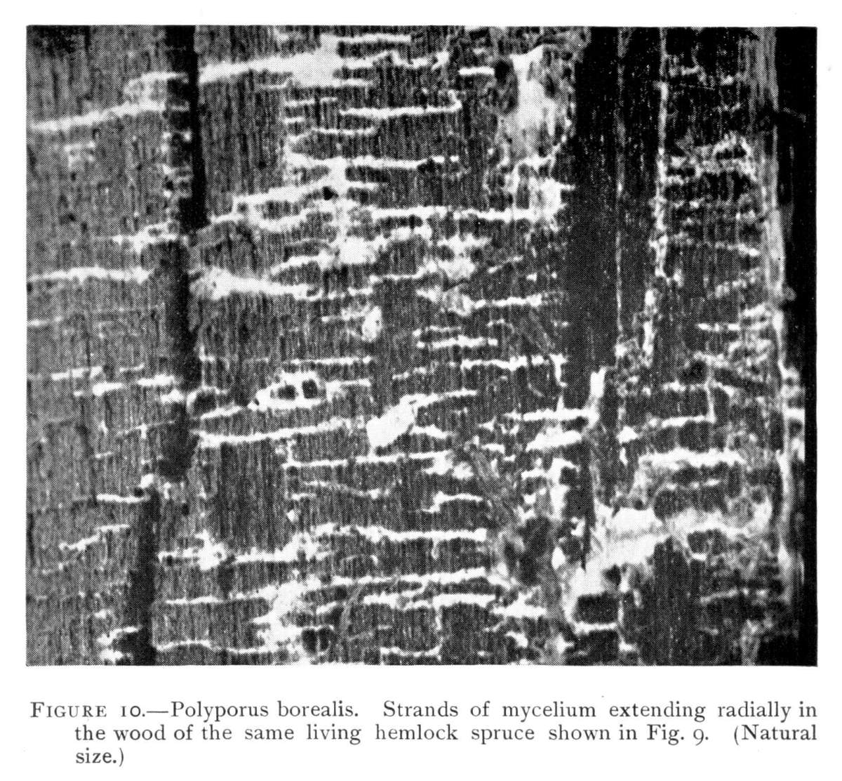 Figure 10.—Polyporus borealis. Strands of mycelium extending radially in the wood of the same living hemlock spruce shown in Fig. 9. (Natural size.)