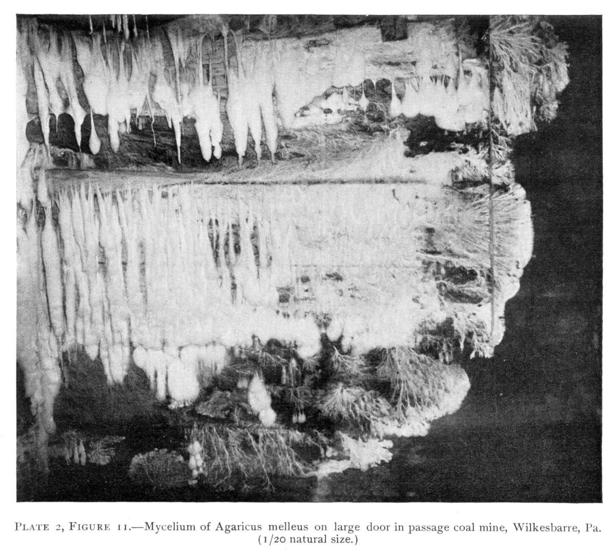 Plate 2, Figure 11.—Mycelium of Agaricus melleus on large door in passage coal mine, Wilkesbarre, Pa. (1/20 natural size.)