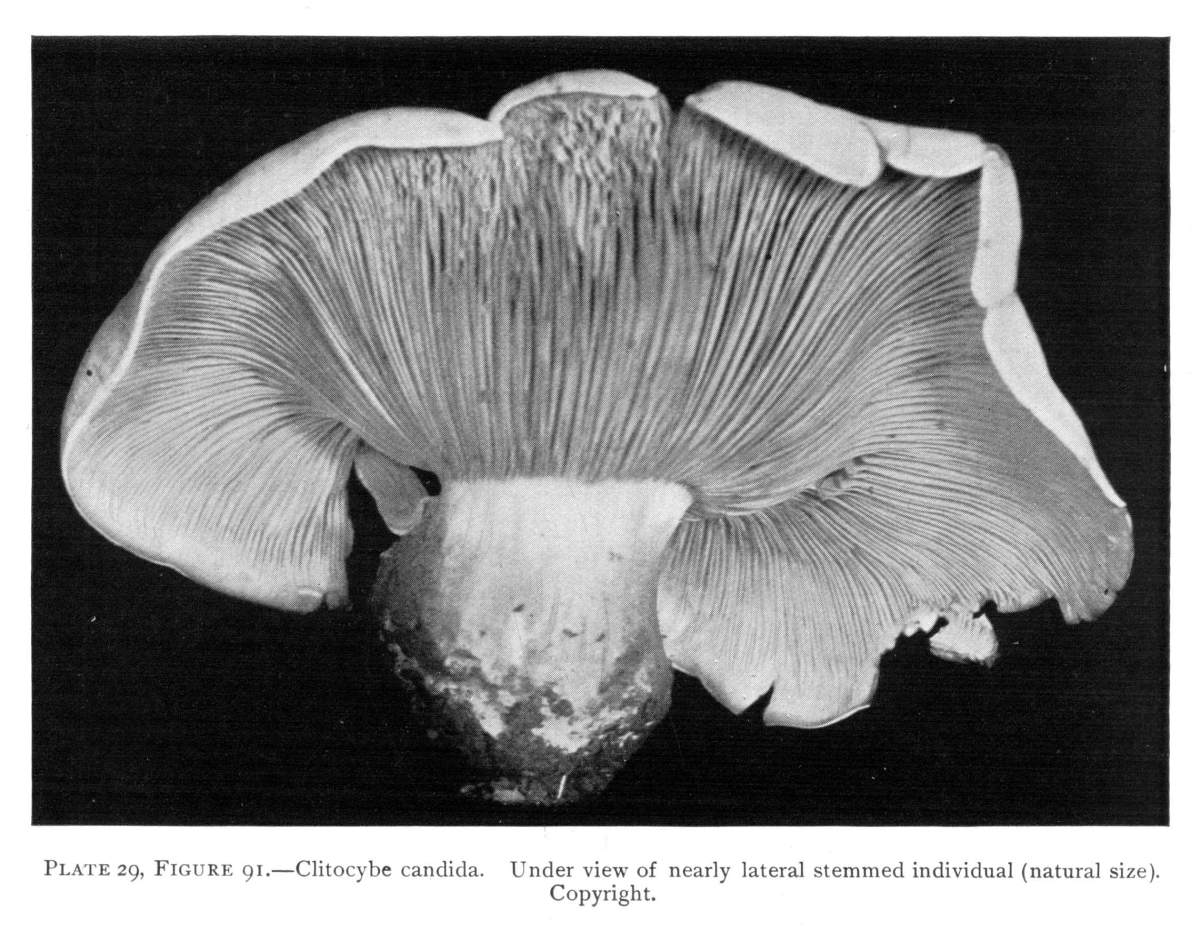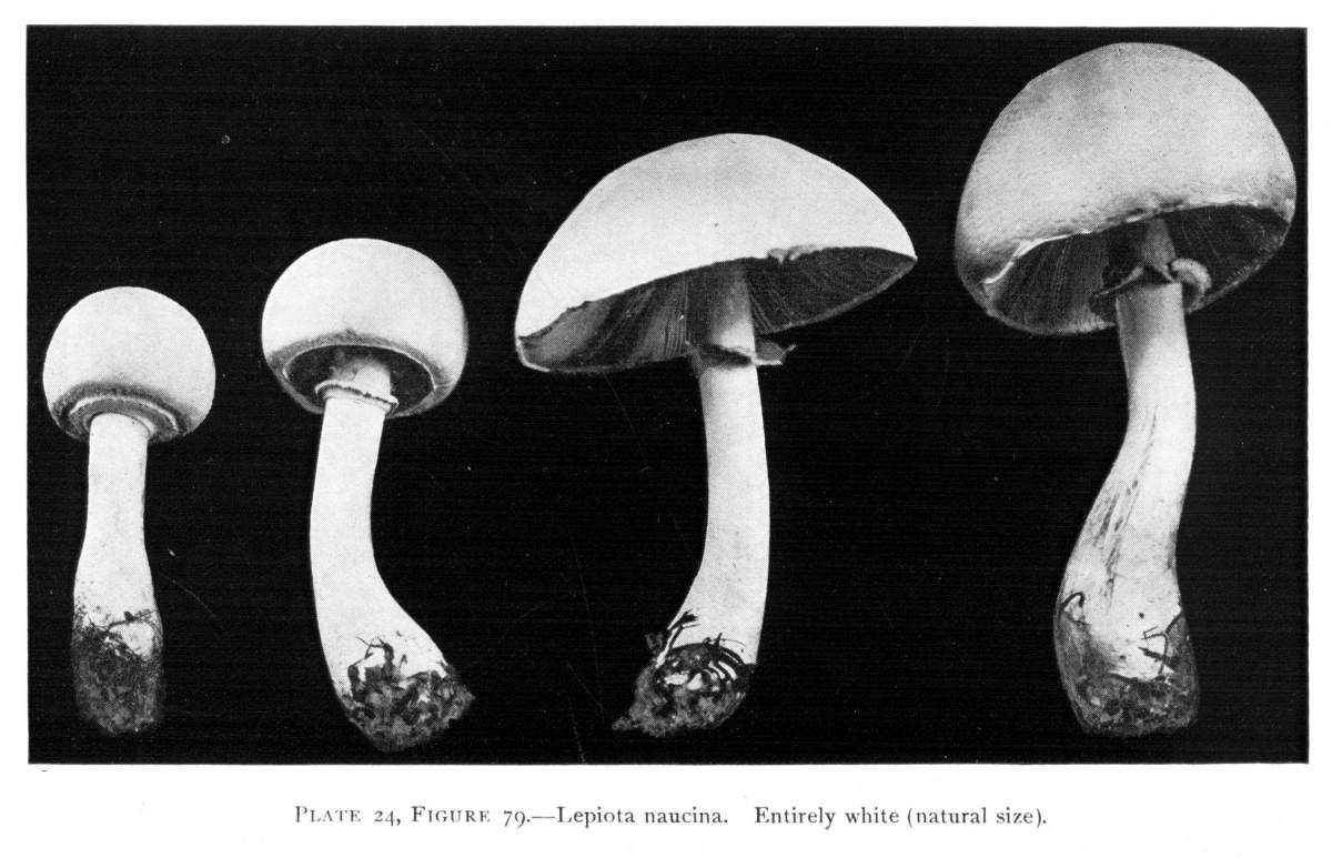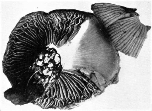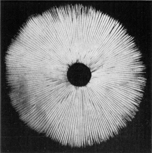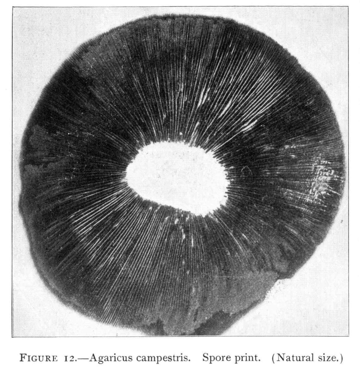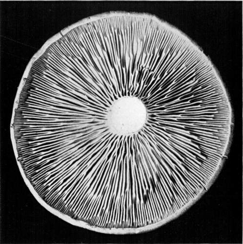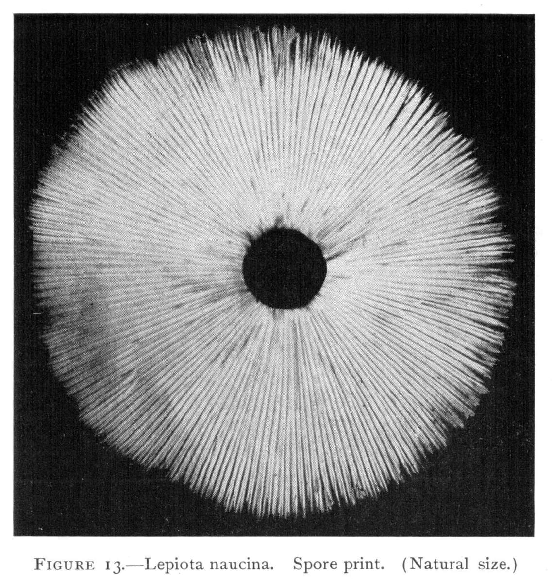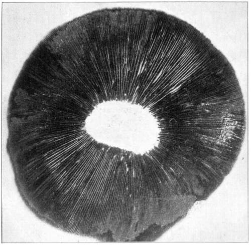 Where there is such uniformity in the position of a member or part of a plant under a variety of conditions, it is an indication that there is some underlying cause, and also, what is more important, that this position serves some useful purpose in the life and well being of the plant. We may cut the stem of a mushroom, say of the Agaricus campestris, close to the cap, and place the latter, gills downward, on a piece of white paper. It should now be covered securely with a small bell jar, or other vessel, so that no currents of air can get underneath. In the course of a few hours myriads of the brown spores will have fallen from the surface of the gills, where they are borne. They will pile up in long lines along on either side of all the gills and so give us an impression, or spore print, of the arrangement of the gills on the under side of the cap as shown in Fig. 12. A white spore print from the smooth lepiota (L. naucina) is shown in Fig. 13. This horizontal position of the cap then favors the falling of the spores, so that currents of air can scatter them and aid in the distribution of the fungus.