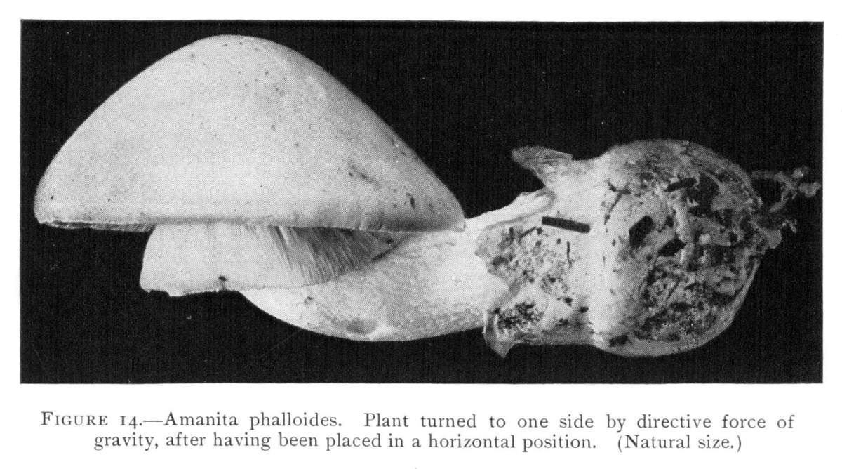 In collecting these plants they are often placed on their side in the collecting basket, or on a table when in the study. In a few hours the younger, long stemmed ones have turned upward again. The plant shown in Fig. 14 (Amanita phalloides) was placed on its side in a basket for about an hour. At the end of the hour it had not turned. It was then stood upright in a glass, and in the course of a few hours had turned nearly at right angles. The stimulus it received while lying in a horizontal position for only an hour was sufficient to produce the change in direction of growth even after the upright position had been restored. This is often the case. Some of the more sensitive of the slender species are disturbed if they lie for only ten or fifteen minutes on the side. It is necessary, therefore, when collecting, if one wishes to keep the plants in the natural position for photographing, to support them in an upright position when they are being carried home from the woods.