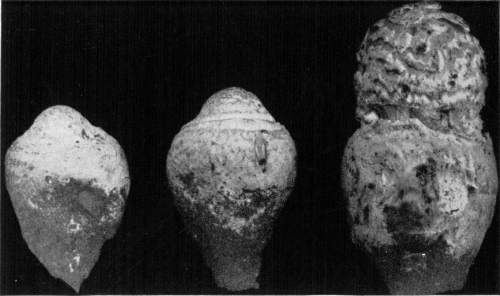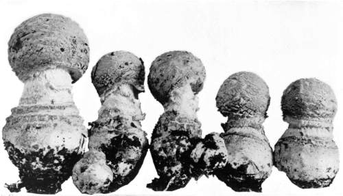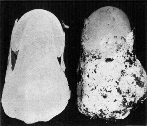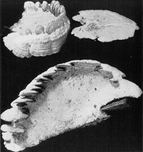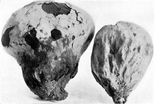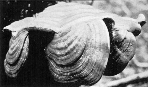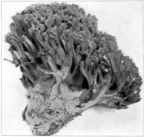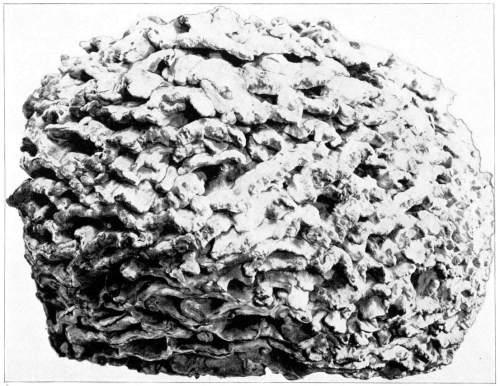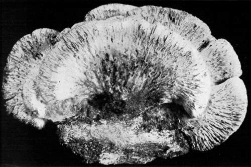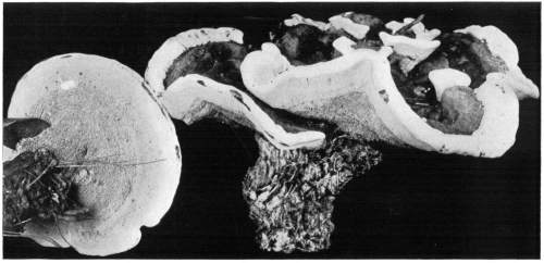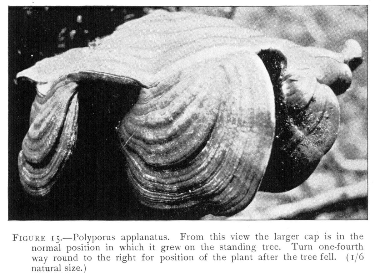 Figure 15.—Polyporus applanatus. From this view the larger cap is in the normal position in which it grew on the standing tree. Turn one fourth way round to the right for position of the plant after the tree fell. (1/6 natural size.)