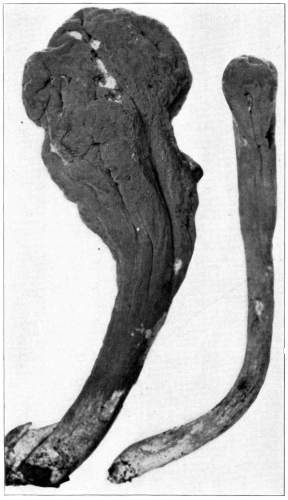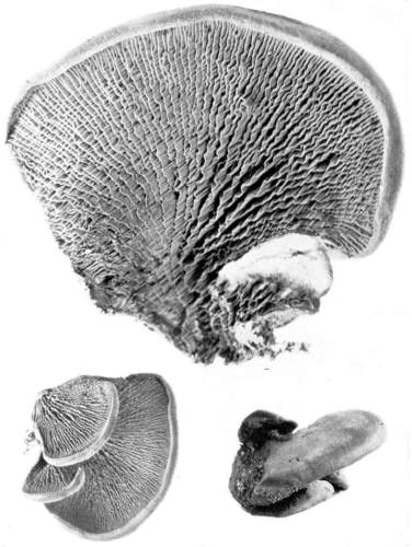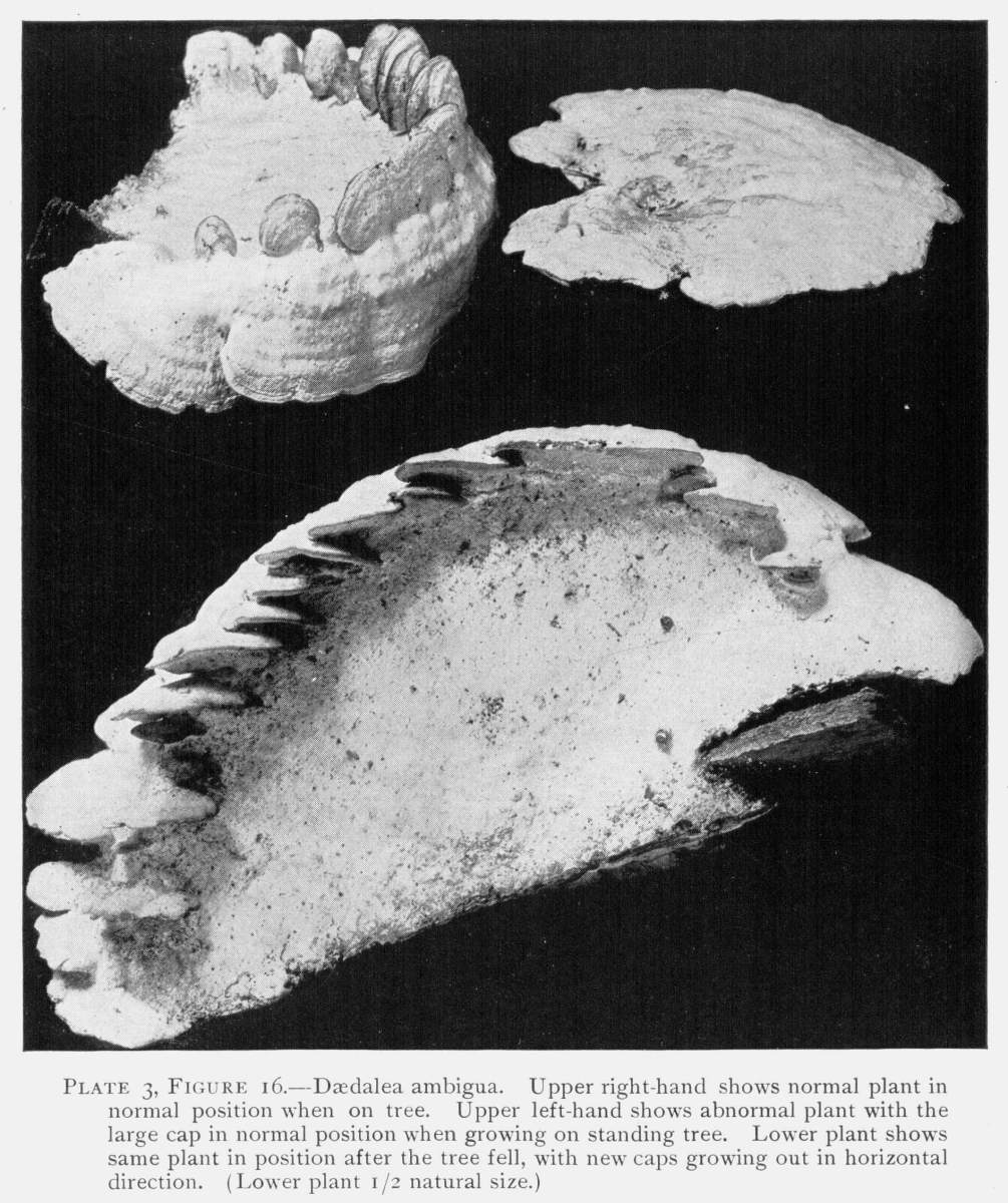 Plate 3, Figure 16.—Dædalea ambigua. Upper right-hand shows normal plant in normal position when on tree. Upper left-hand shows abnormal plant with the large cap in normal position when growing on standing tree. Lower plant shows same plant in position after the tree fell, with new caps growing out in horizontal direction. (Lower plant 1/2 natural size.)