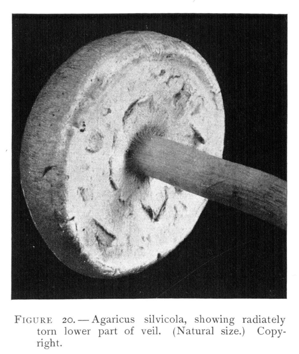 The Ring.—There is usually present in the mature plant of Agaricus campestris a thin collar (annulus) or ring around the upper end of the stem. It is not a movable ring, but is joined to the stem. It is very delicate, easily rubbed off, or may be even washed off during rains.[Pg 3]