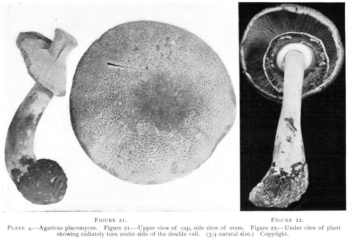 Parts of the Mushroom.—To serve as a means of comparison, the common pasture mushroom, or cultivated form (Agaricus campestris), is first described. Figure 1 illustrates well the principal parts of the plant; the cap, the radiating plates or gills on the under side, the stem, and the collar or ring around its upper end.