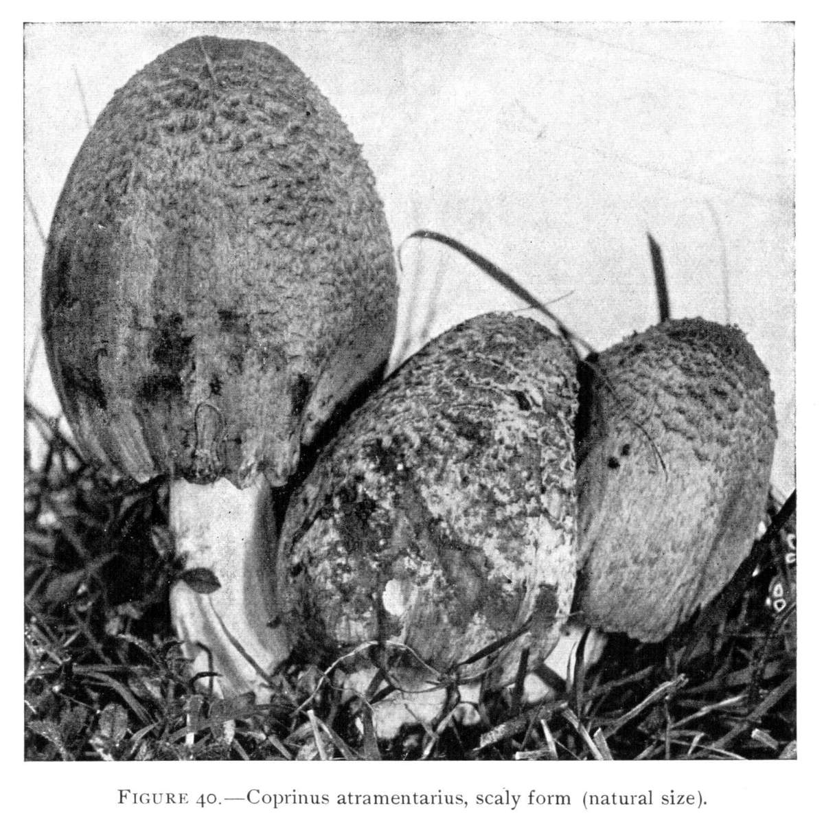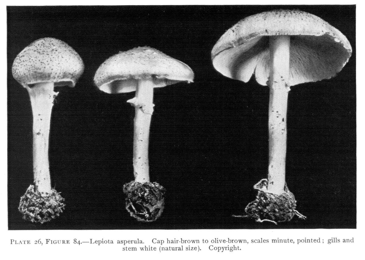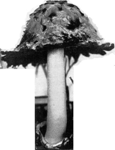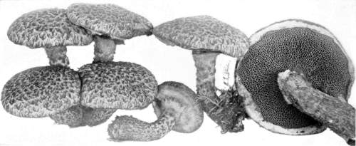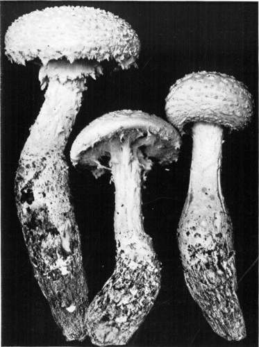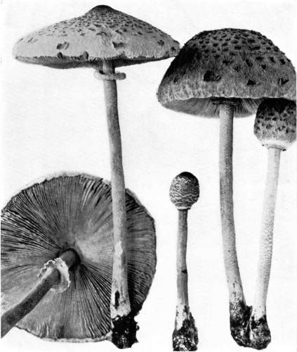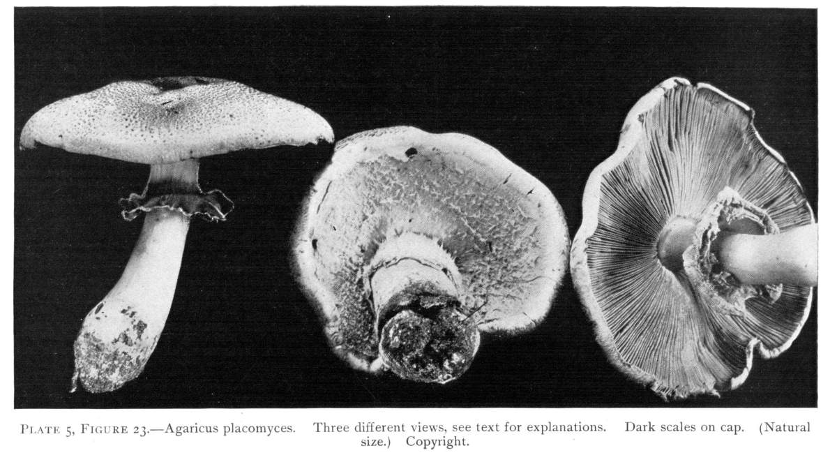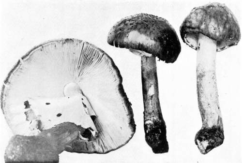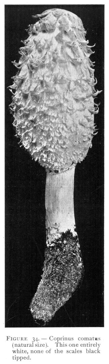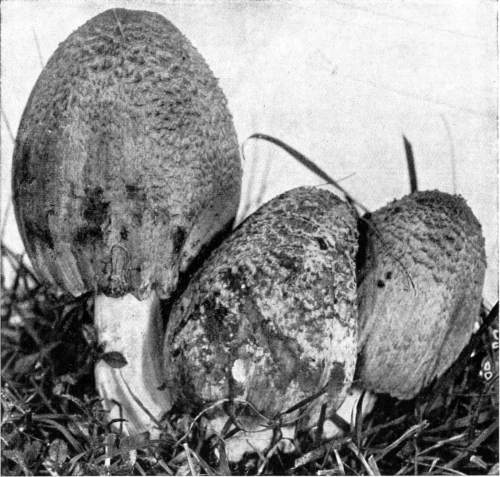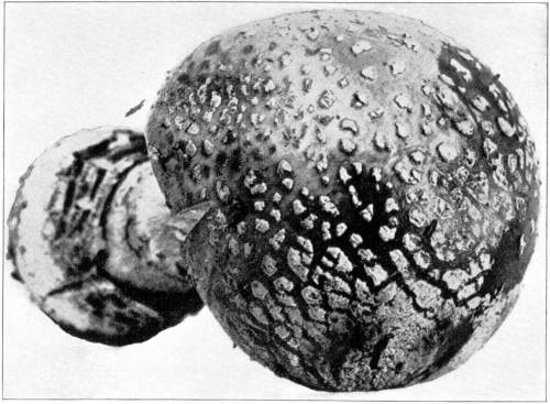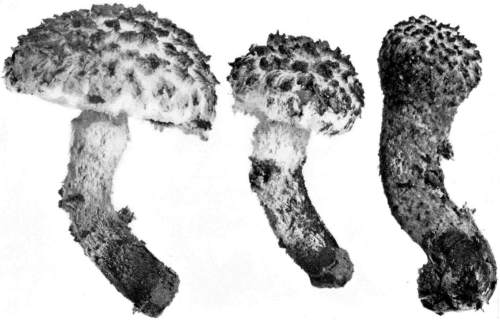 The Cap.—The cap (technically the pileus) is the expanded part of the mushroom. It is quite thick, and fleshy in consistency, more or less rounded or convex on the upper side, and usually white in color. It is from 1–2 cm. thick at the center and 5–10 cm. in diameter. The surface is generally smooth, but sometimes it is torn up more or less into triangular scales. When these scales are prominent they are often of a dark color. This gives quite a different aspect to the plant, and has led to the enumeration of several[Pg 2] varieties, or may be species, among forms accredited by some to the one species.