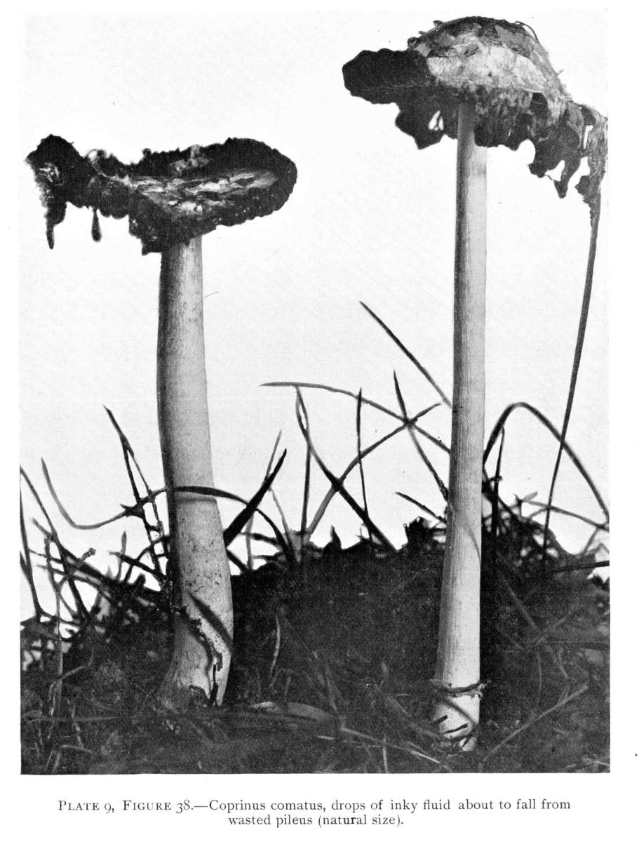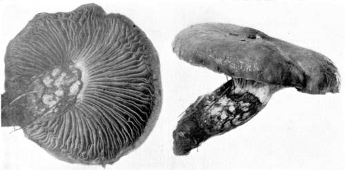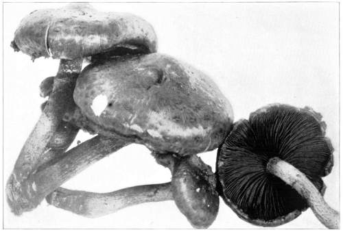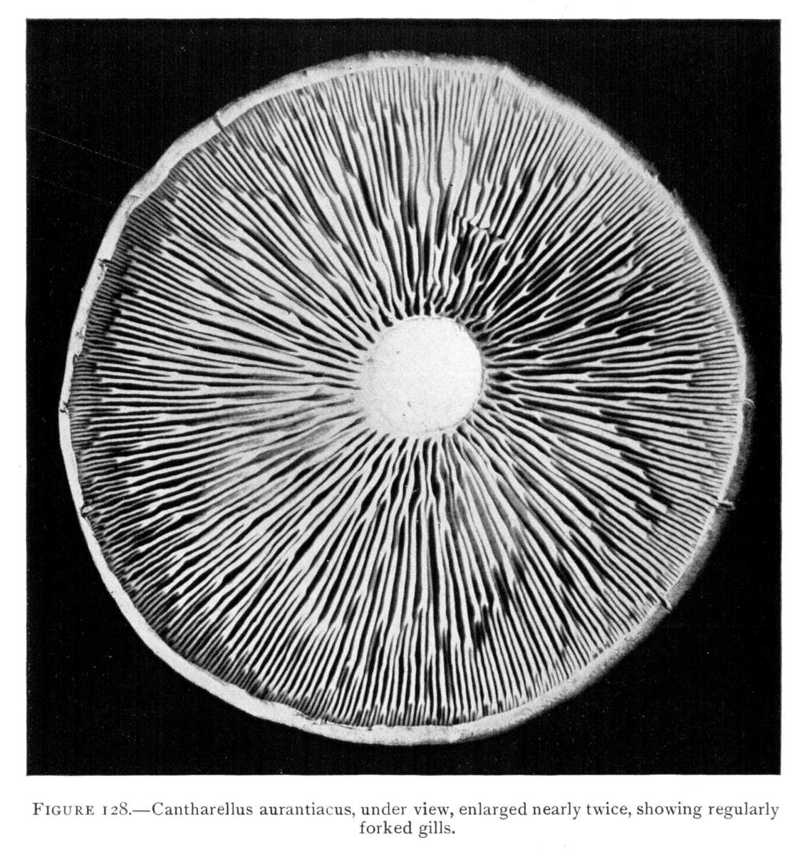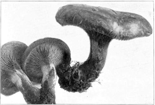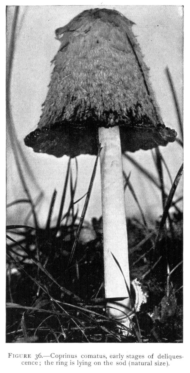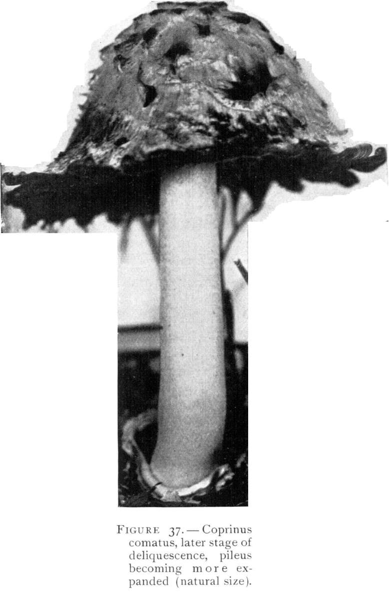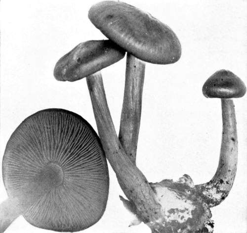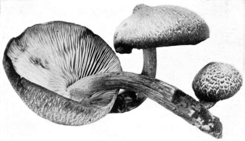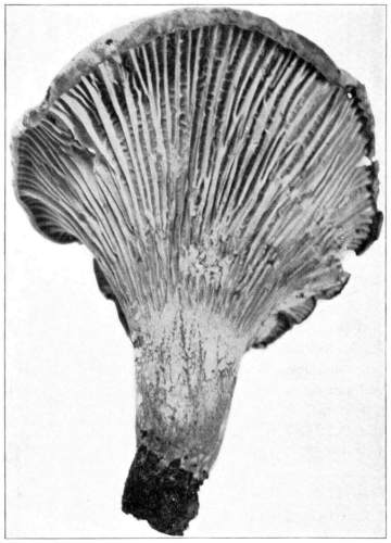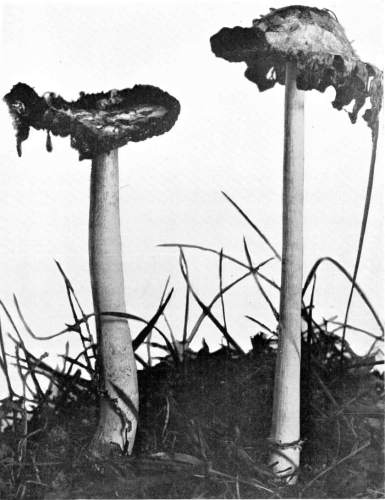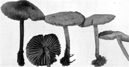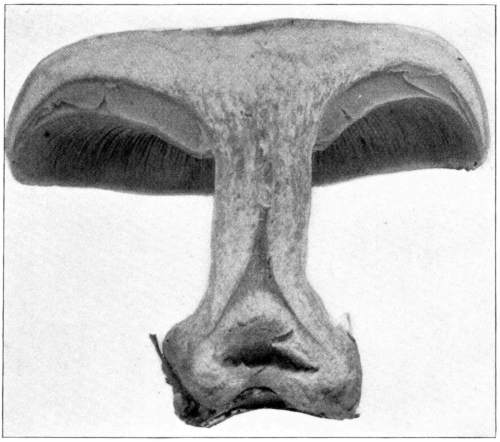 The gill bearing fungi are known under the family Agaricaceæ, or popularly the agarics. They are distinguished by the fruiting area being distributed over the surface of plate-like or knife-like extensions or folds, usually from the under surface of the cap. These are known as the gills, or lamellæ, and they usually radiate from a common point, as from or near the stem, when the stem is present; or from the point of attachment of the pileus when the stem is absent. The plants vary widely in form and consistency, some being very soft and soon decaying, others turning into an inky fluid, others being tough and leathery, and some more or less woody or corky. The spores when seen in mass possess certain colors, white, rosy, brown or purple brown, black or ochraceous. While a more natural division of the agarics can be made on the basis of structure and consistency, the treatment here followed is based on the color of the spores, the method in vogue with the older botanists. While this method is more artificial, it is believed to be better for the beginner, especially for a popular treatment. The sections will be treated in the following order: