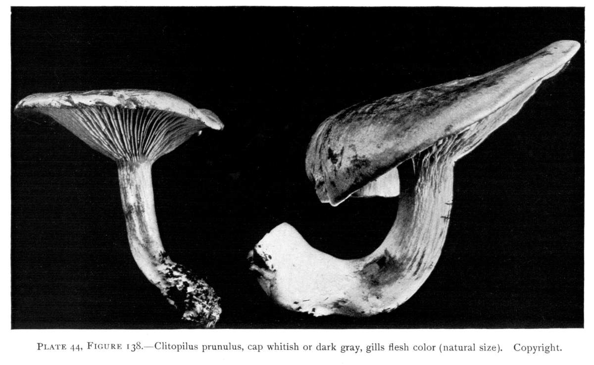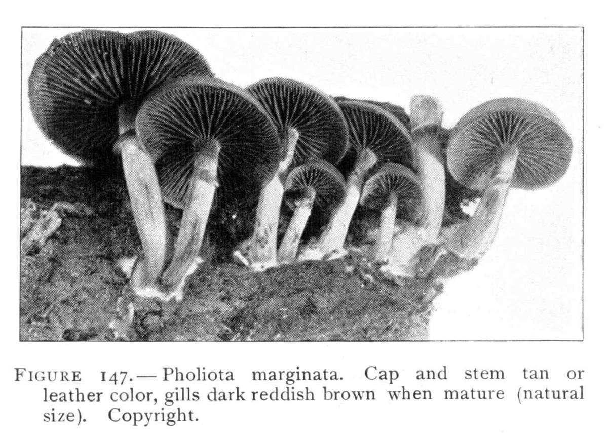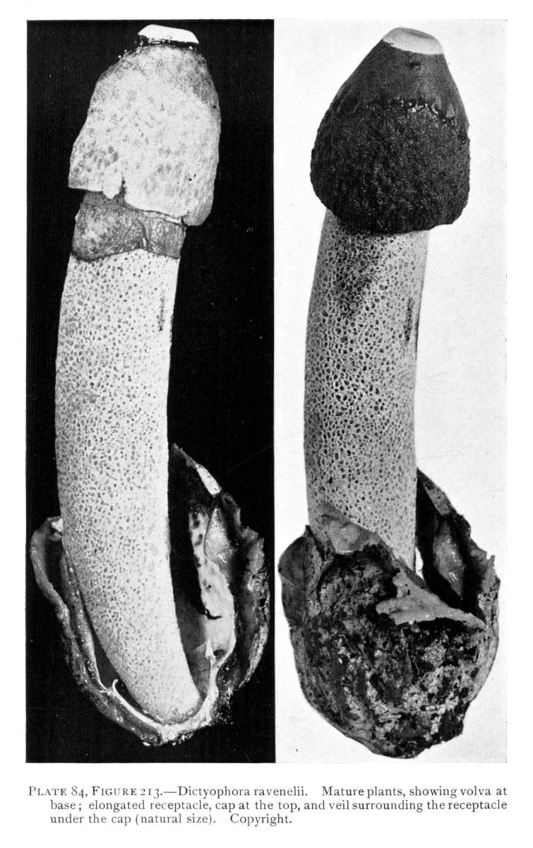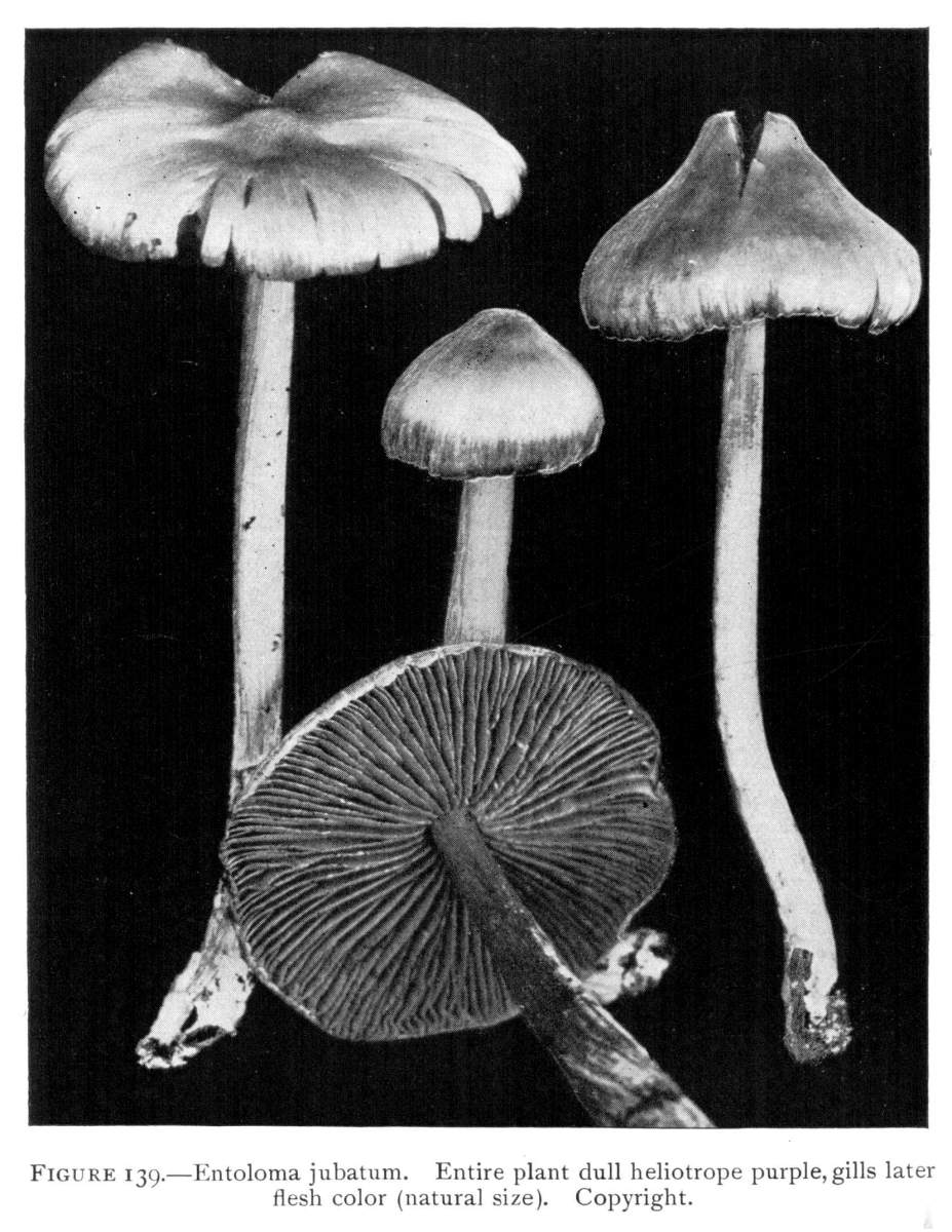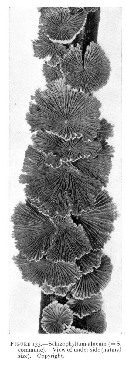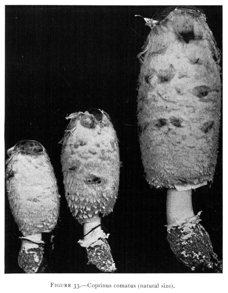 The gill bearing fungi are known under the family Agaricaceæ, or popularly the agarics. They are distinguished by the fruiting area being distributed over the surface of plate-like or knife-like extensions or folds, usually from the under surface of the cap. These are known as the gills, or lamellæ, and they usually radiate from a common point, as from or near the stem, when the stem is present; or from the point of attachment of the pileus when the stem is absent. The plants vary widely in form and consistency, some being very soft and soon decaying, others turning into an inky fluid, others being tough and leathery, and some more or less woody or corky. The spores when seen in mass possess certain colors, white, rosy, brown or purple brown, black or ochraceous. While a more natural division of the agarics can be made on the basis of structure and consistency, the treatment here followed is based on the color of the spores, the method in vogue with the older botanists. While this method is more artificial, it is believed to be better for the beginner, especially for a popular treatment. The sections will be treated in the following order: