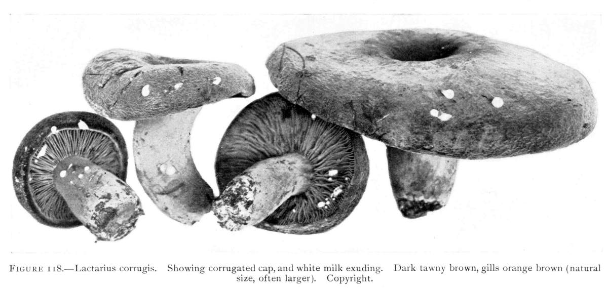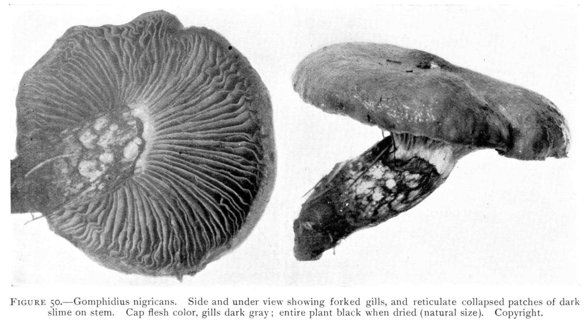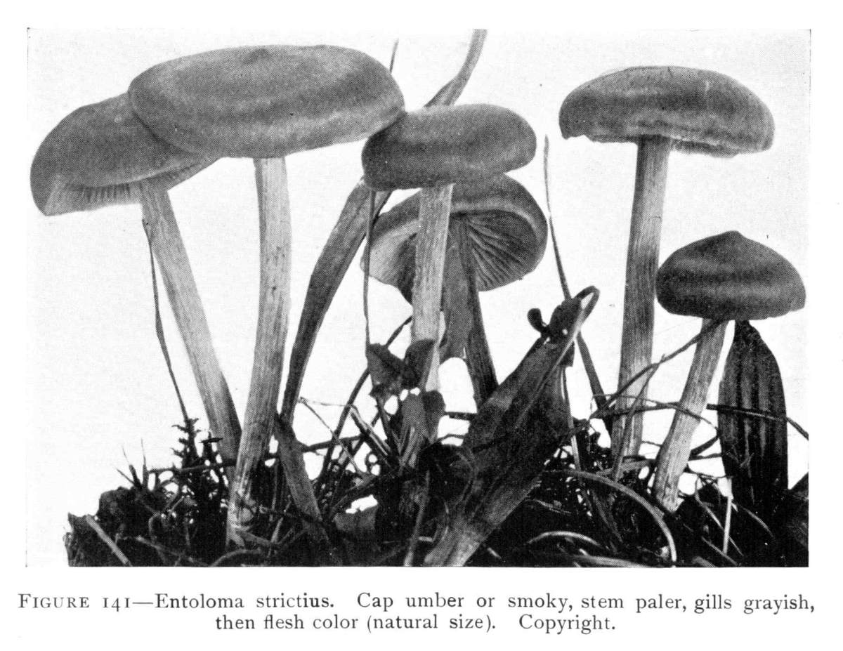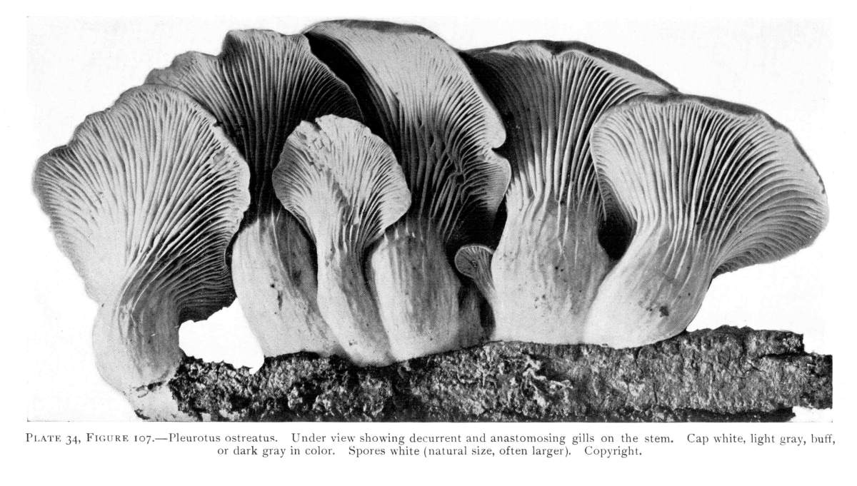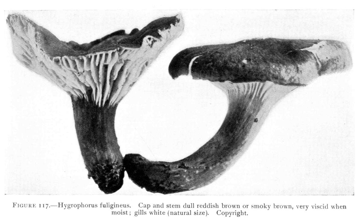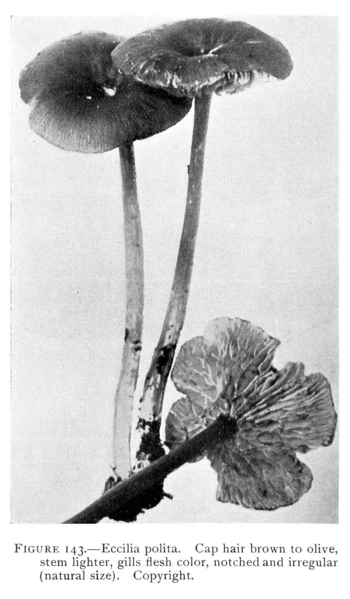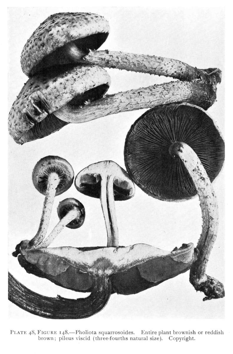The gill bearing fungi are known under the family Agaricaceæ, or popularly the agarics. They are distinguished by the fruiting area being distributed over the surface of plate-like or knife-like extensions or folds, usually from the under surface of the cap. These are known as the gills, or lamellæ, and they usually radiate from a common point, as from or near the stem, when the stem is present; or from the point of attachment of the pileus when the stem is absent. The plants vary widely in form and consistency, some being very soft and soon decaying, others turning into an inky fluid, others being tough and leathery, and some more or less woody or corky. The spores when seen in mass possess certain colors, white, rosy, brown or purple brown, black or ochraceous. While a more natural division of the agarics can be made on the basis of structure and consistency, the treatment here followed is based on the color of the spores, the method in vogue with the older botanists. While this method is more artificial, it is believed to be better for the beginner, especially for a popular treatment. The sections will be treated in the following order: