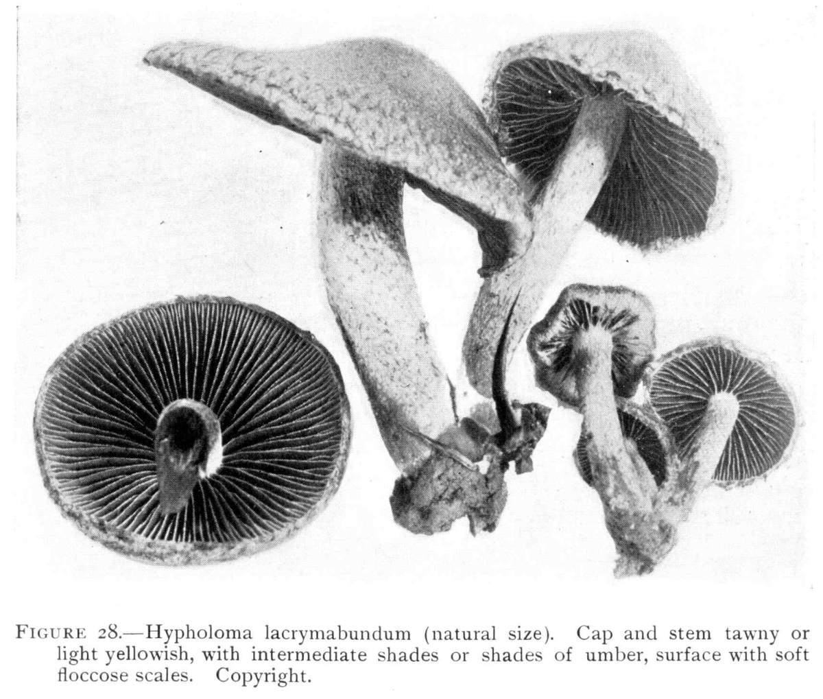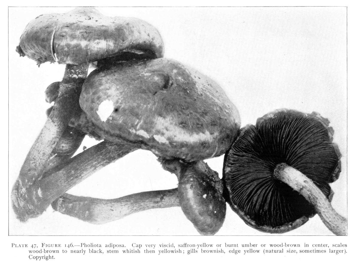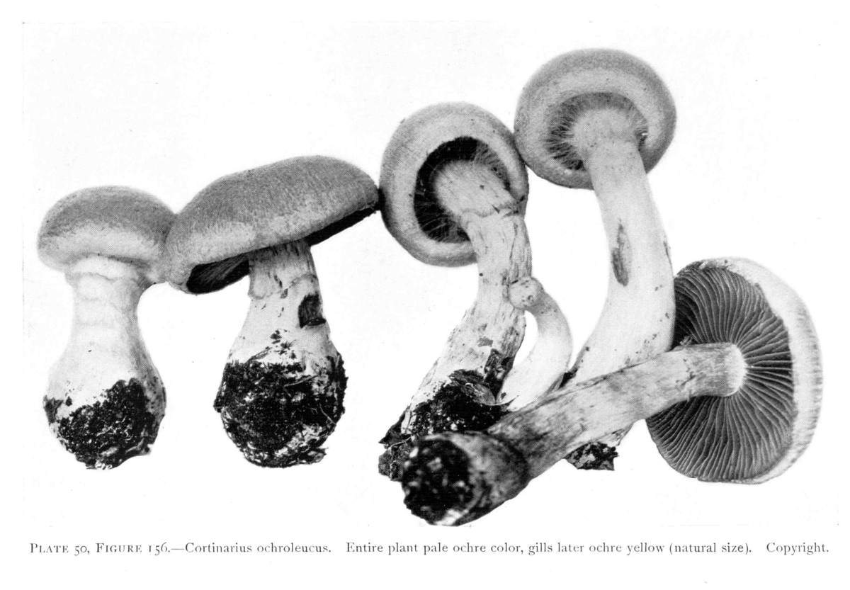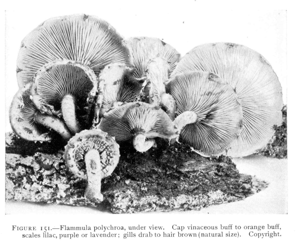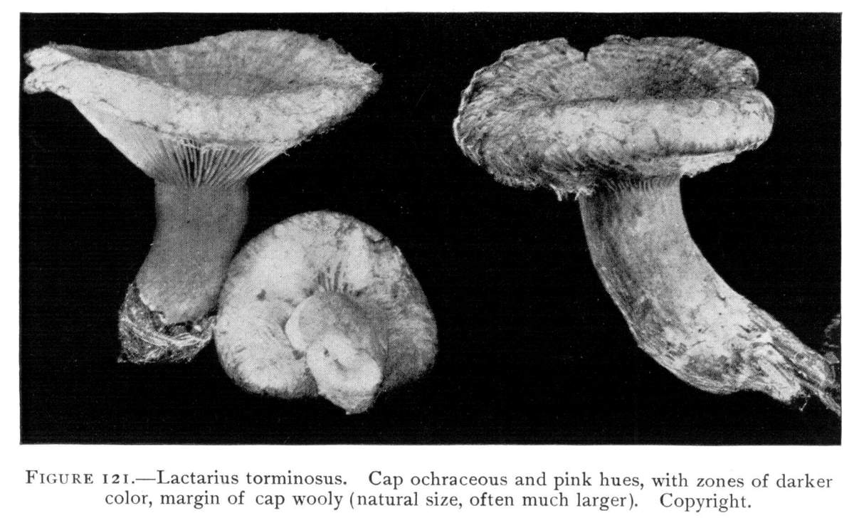 The gill bearing fungi are known under the family Agaricaceæ, or popularly the agarics. They are distinguished by the fruiting area being distributed over the surface of plate-like or knife-like extensions or folds, usually from the under surface of the cap. These are known as the gills, or lamellæ, and they usually radiate from a common point, as from or near the stem, when the stem is present; or from the point of attachment of the pileus when the stem is absent. The plants vary widely in form and consistency, some being very soft and soon decaying, others turning into an inky fluid, others being tough and leathery, and some more or less woody or corky. The spores when seen in mass possess certain colors, white, rosy, brown or purple brown, black or ochraceous. While a more natural division of the agarics can be made on the basis of structure and consistency, the treatment here followed is based on the color of the spores, the method in vogue with the older botanists. While this method is more artificial, it is believed to be better for the beginner, especially for a popular treatment. The sections will be treated in the following order: