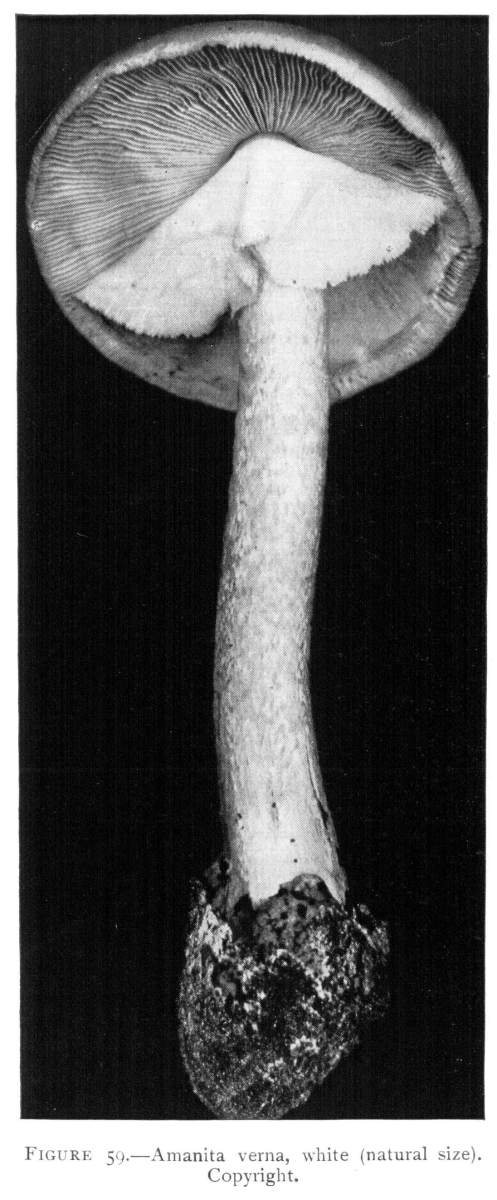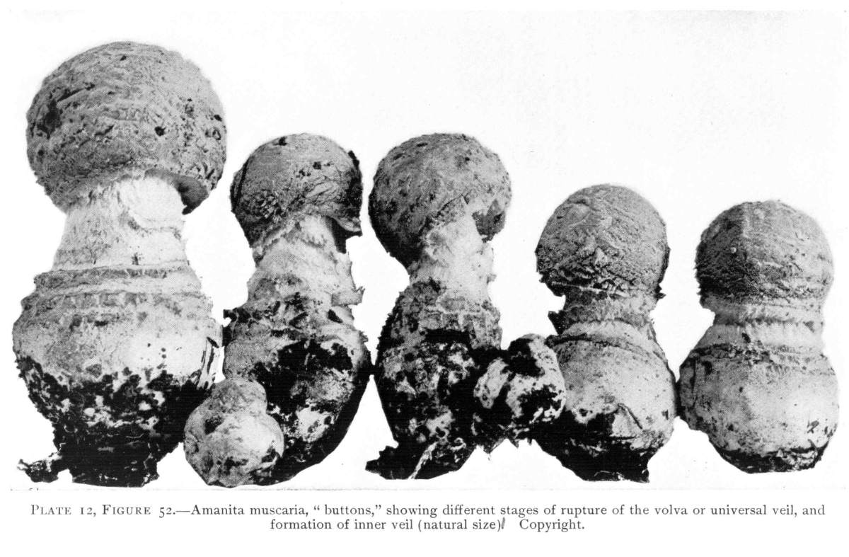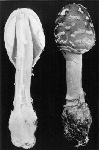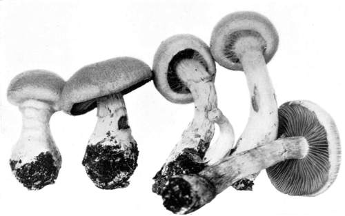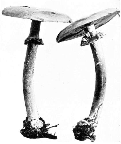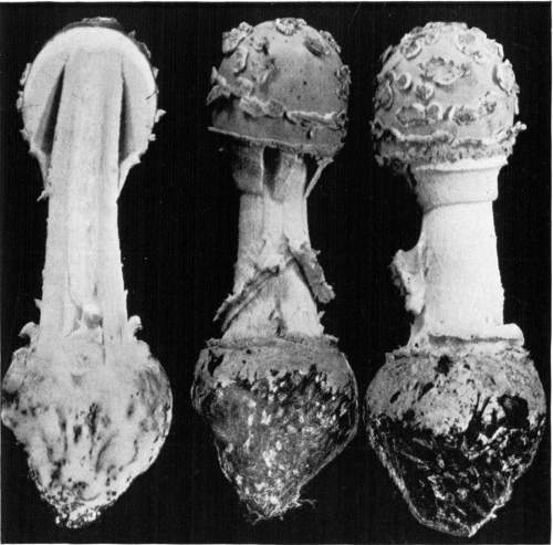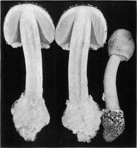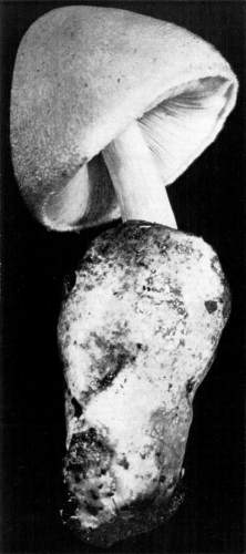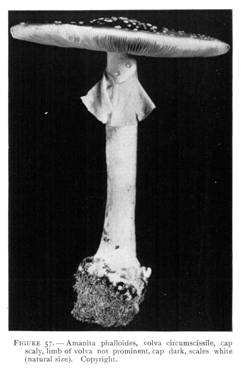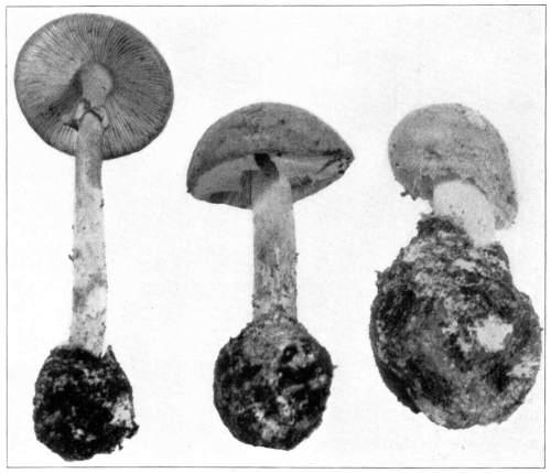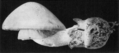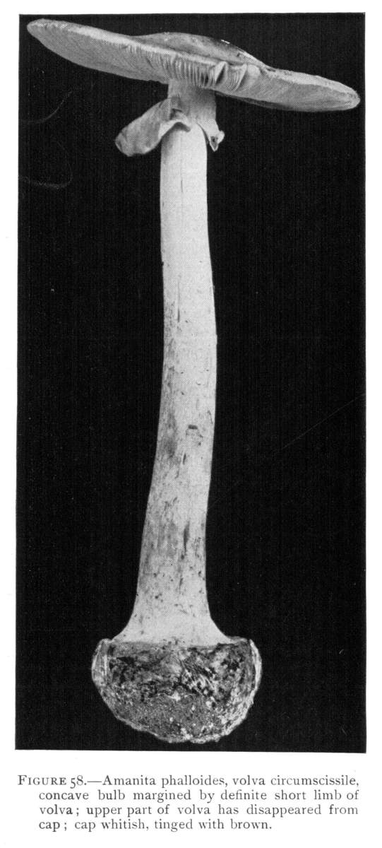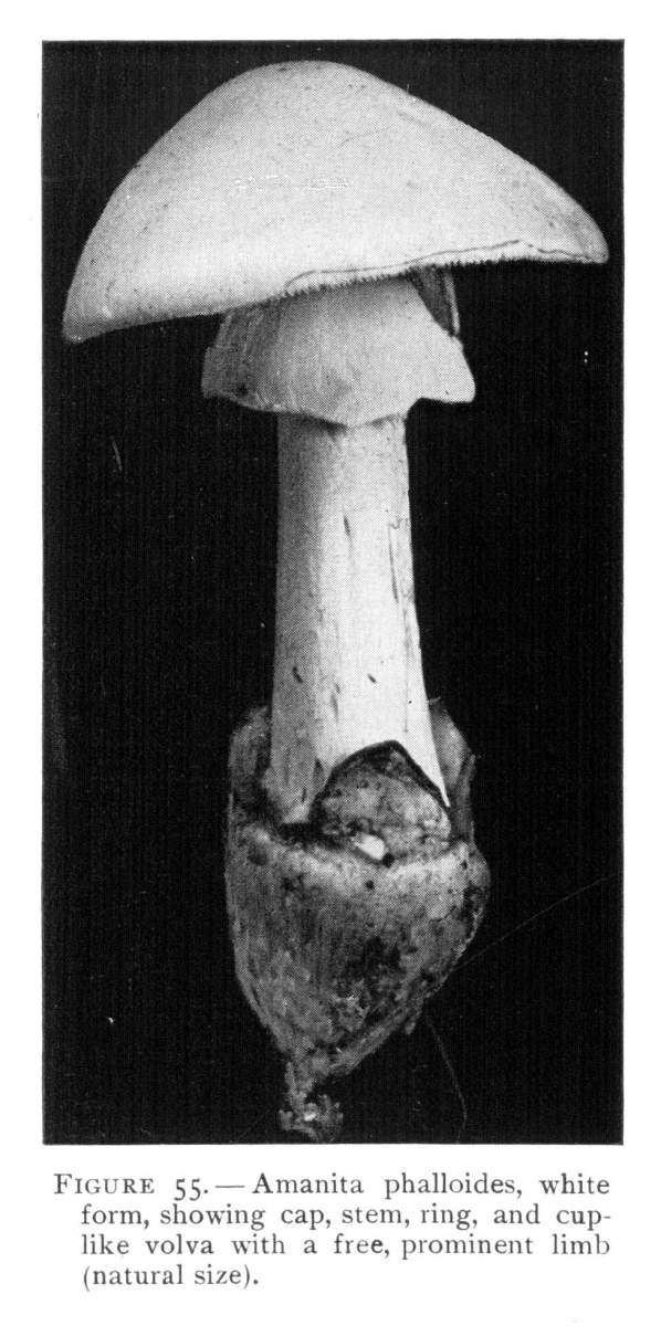 Parts Present in Other Mushrooms—The Volva.—Some other mushrooms, like the deadly Amanita (Amanita phalloides) and other species of the genus Amanita, have, in addition to the cap, gills, stem, and ring, a more or less well formed cup-like structure attached to the lower end of the stem, and from which the stem appears to spring. (Figs. 55, 72, etc.) This is the volva, sometimes popularly called the "death cup," or "poison cup." This structure is a very important one to observe, though its presence by no means indicates in all cases that the plant is poisonous. It will be described more in detail in treating of the genus Amanita, where the illustrations should also be consulted.