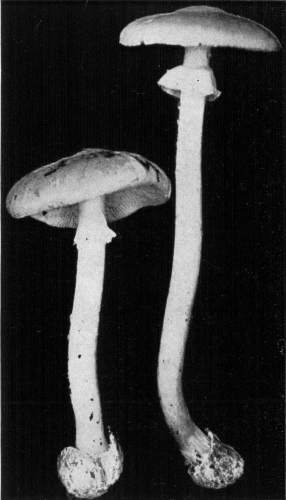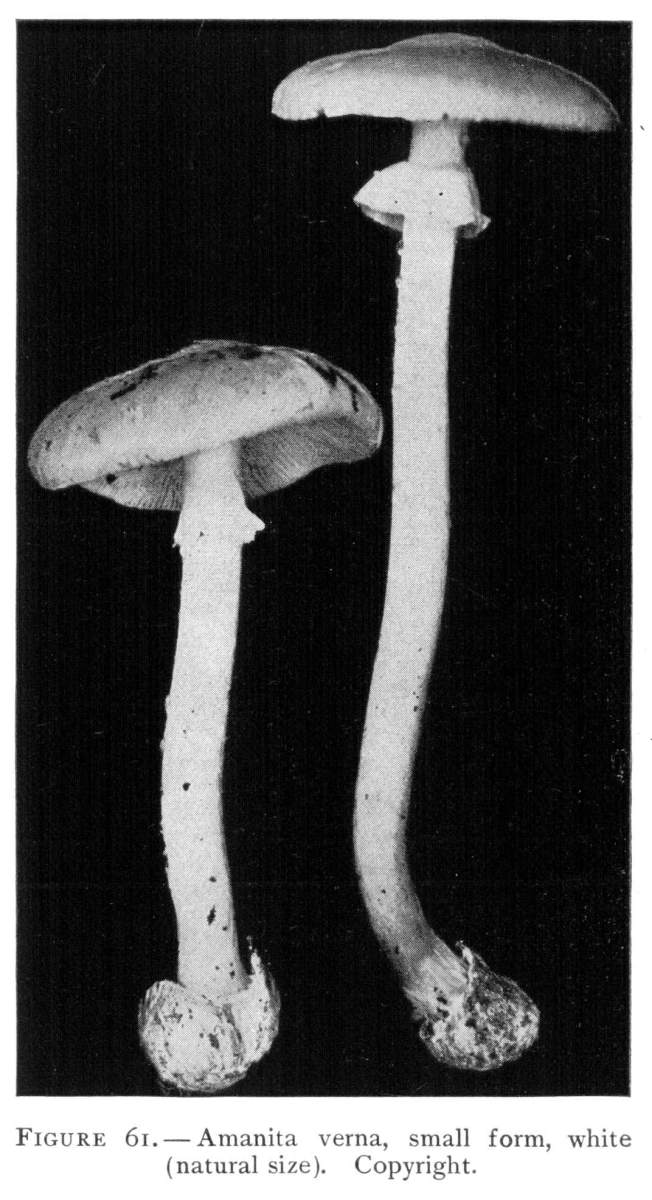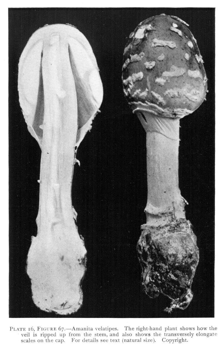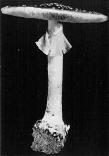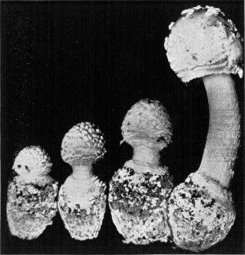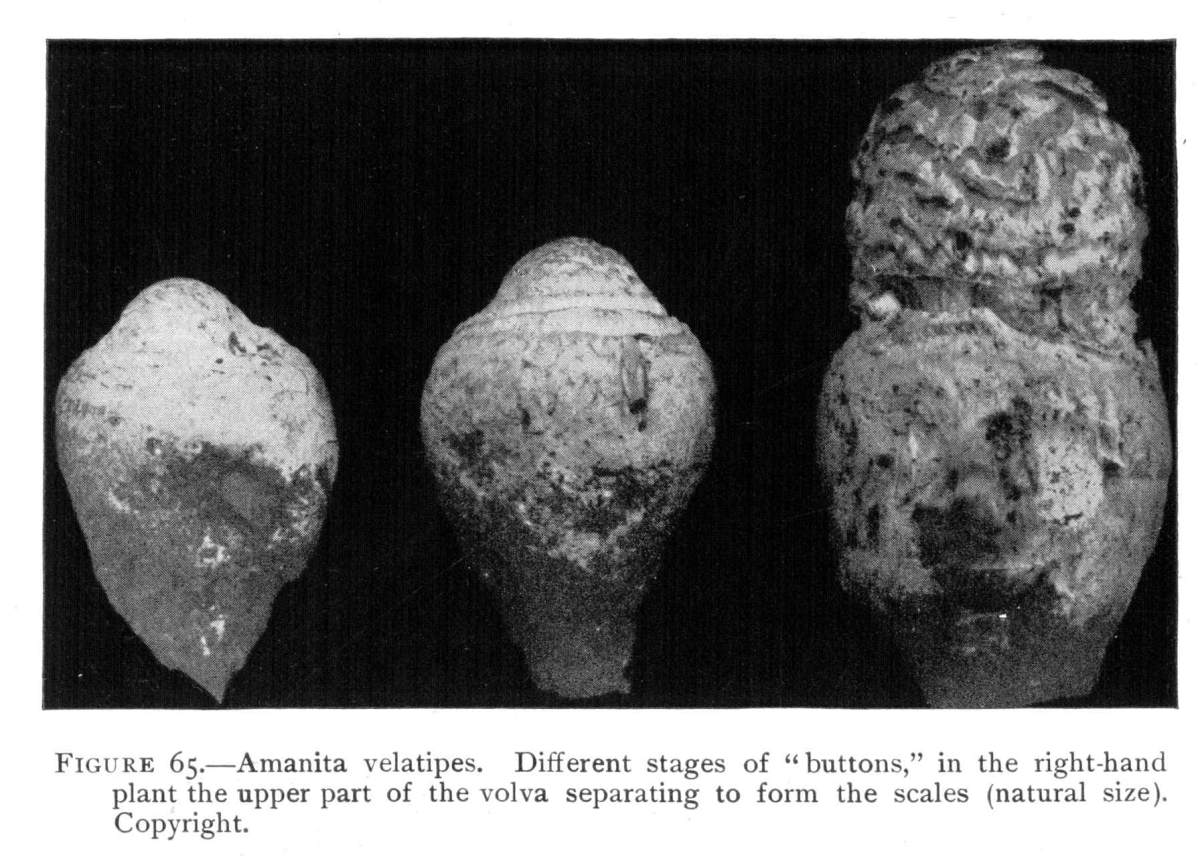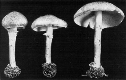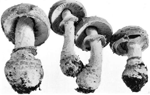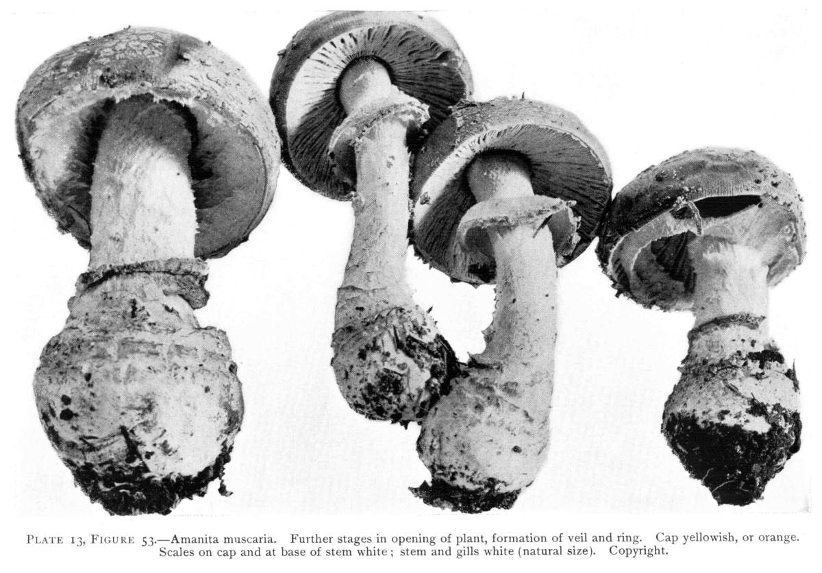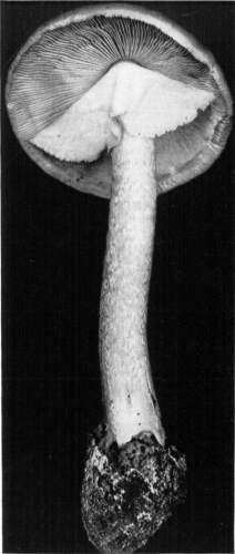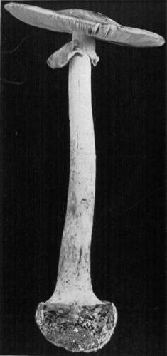 Parts Present in Other Mushrooms—The Volva.—Some other mushrooms, like the deadly Amanita (Amanita phalloides) and other species of the genus Amanita, have, in addition to the cap, gills, stem, and ring, a more or less well formed cup-like structure attached to the lower end of the stem, and from which the stem appears to spring. (Figs. 55, 72, etc.) This is the volva, sometimes popularly called the "death cup," or "poison cup." This structure is a very important one to observe, though its presence by no means indicates in all cases that the plant is poisonous. It will be described more in detail in treating of the genus Amanita, where the illustrations should also be consulted.