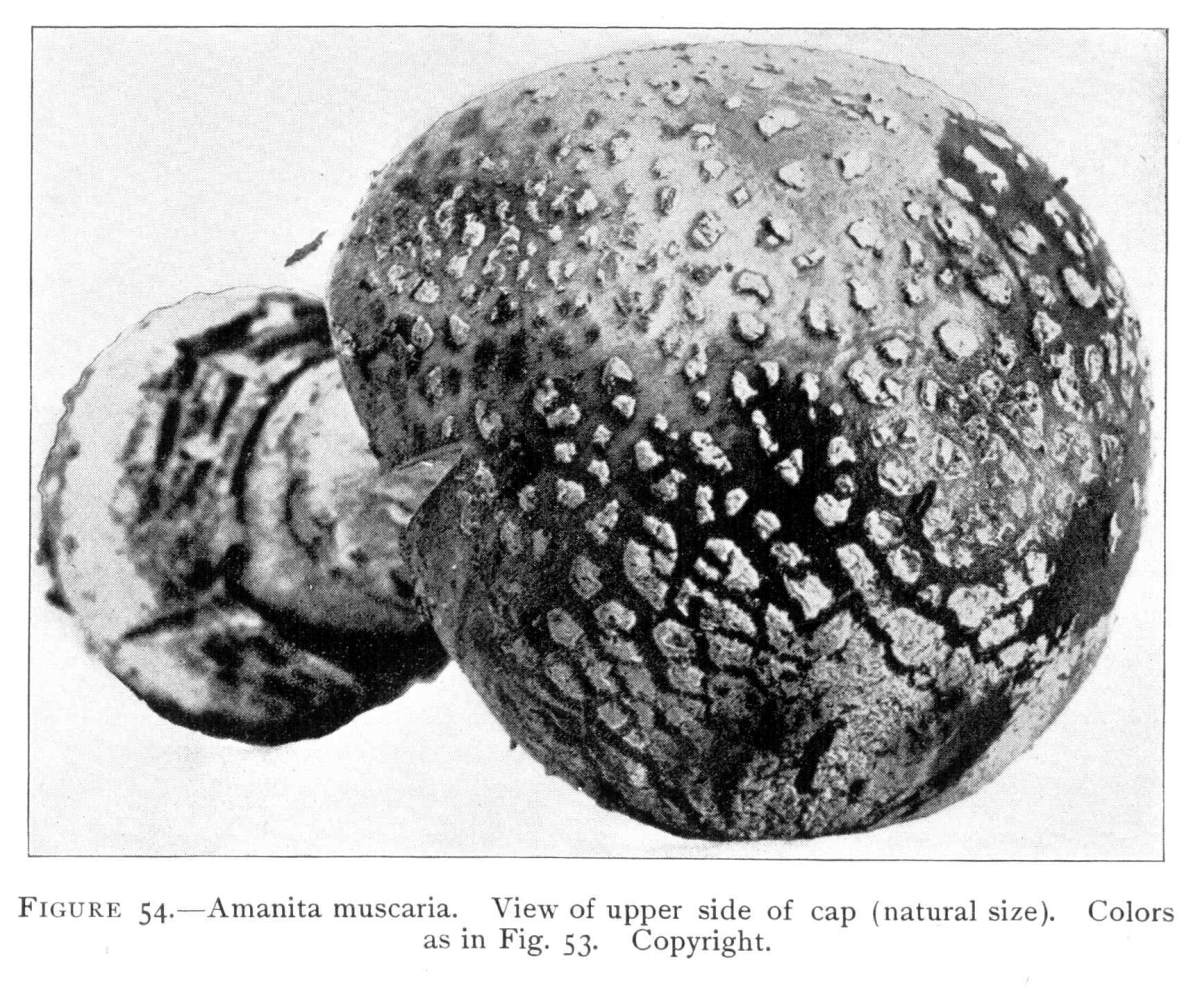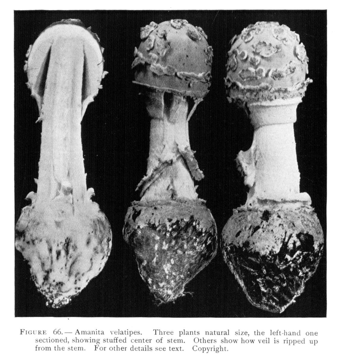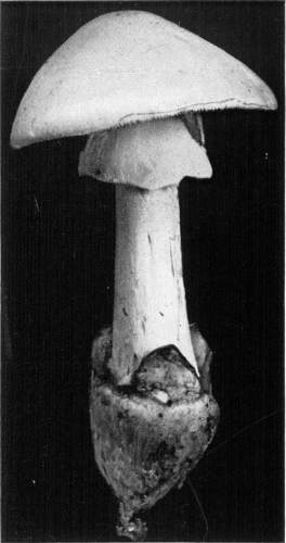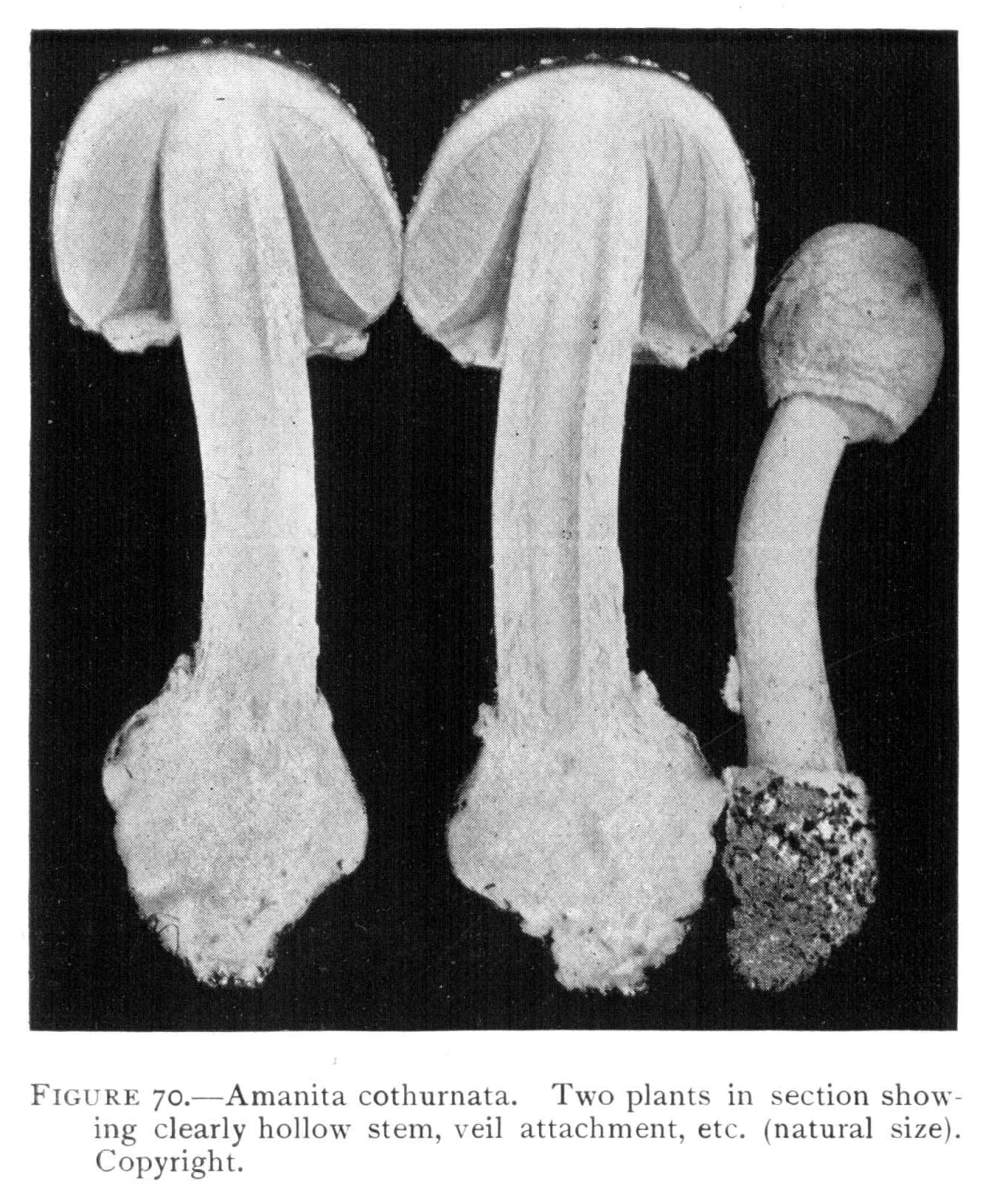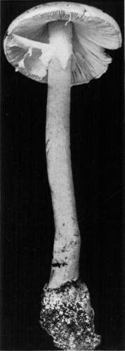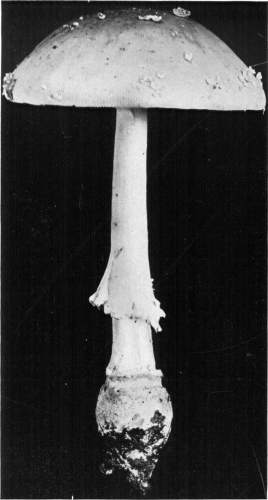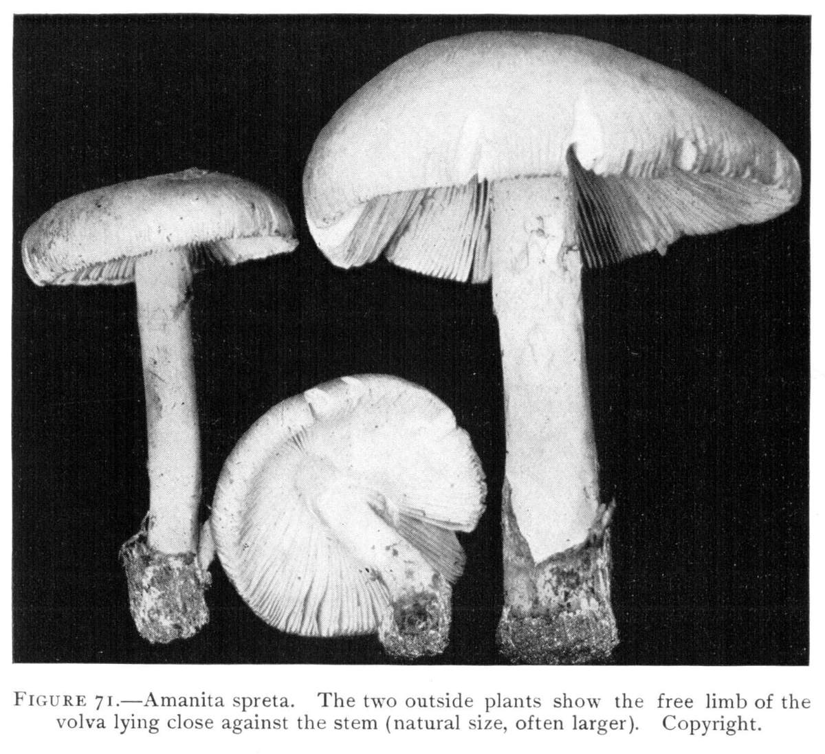 Parts Present in Other Mushrooms—The Volva.—Some other mushrooms, like the deadly Amanita (Amanita phalloides) and other species of the genus Amanita, have, in addition to the cap, gills, stem, and ring, a more or less well formed cup-like structure attached to the lower end of the stem, and from which the stem appears to spring. (Figs. 55, 72, etc.) This is the volva, sometimes popularly called the "death cup," or "poison cup." This structure is a very important one to observe, though its presence by no means indicates in all cases that the plant is poisonous. It will be described more in detail in treating of the genus Amanita, where the illustrations should also be consulted.