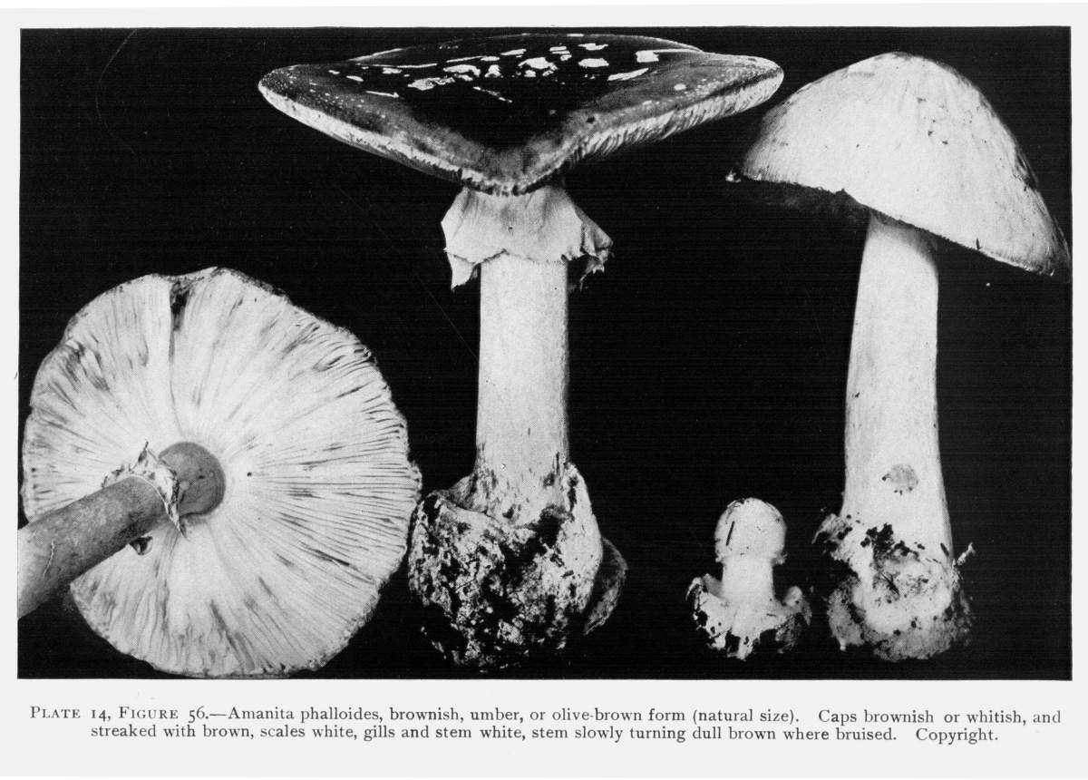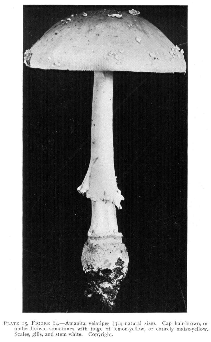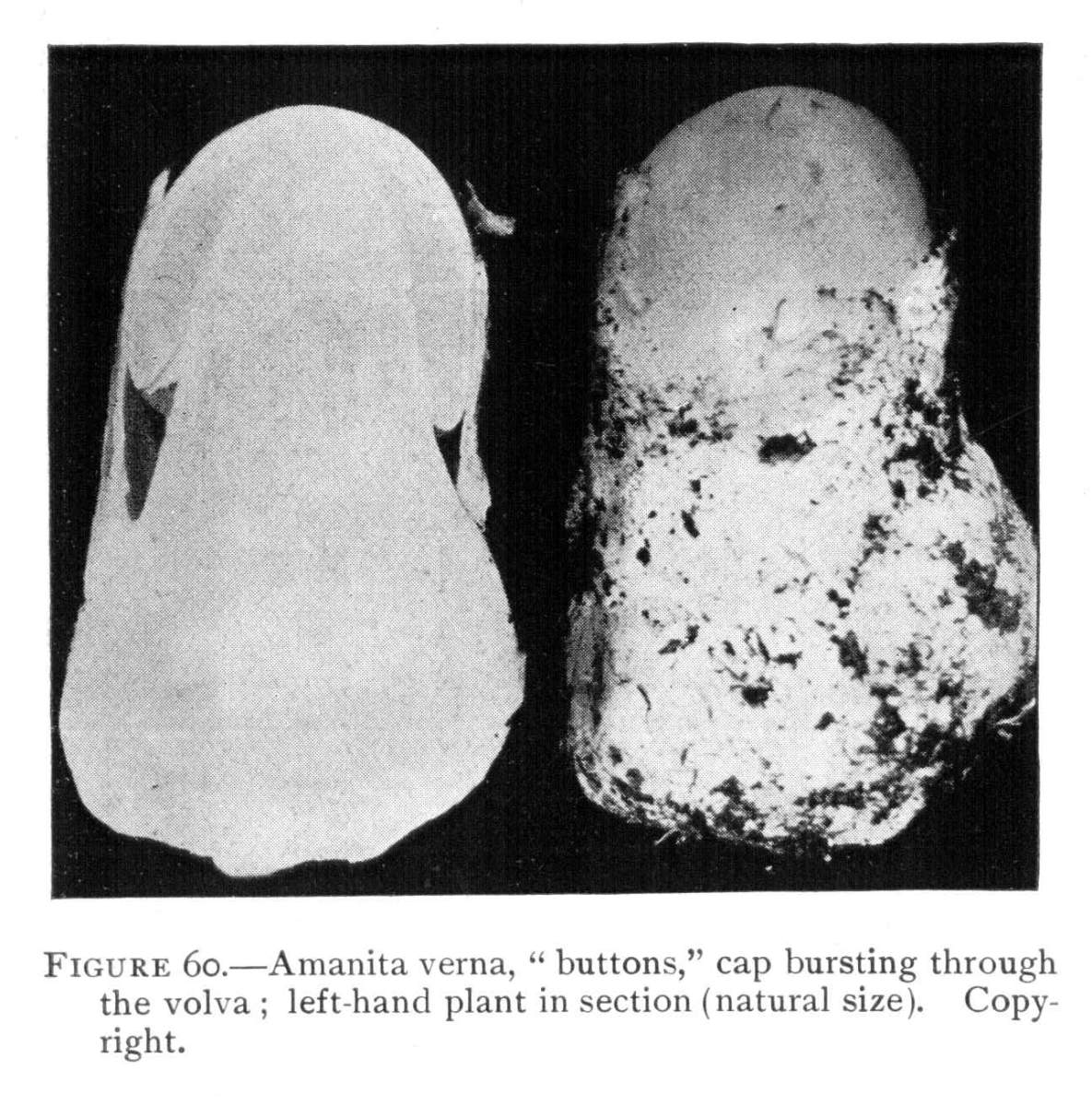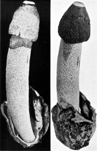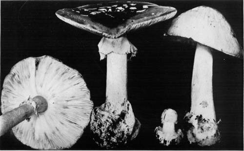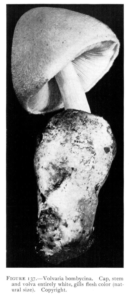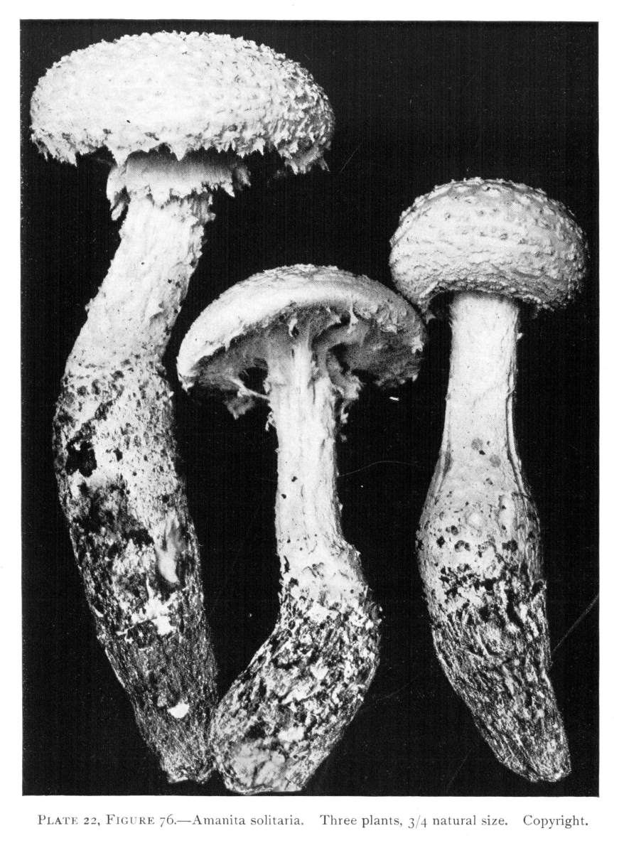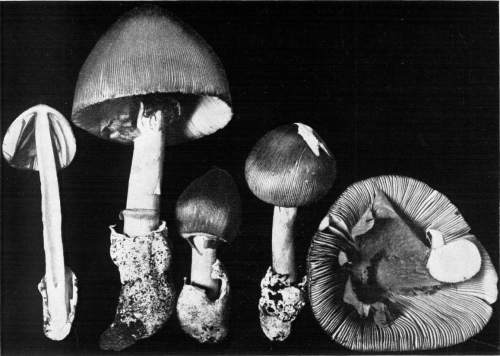 Parts Present in Other Mushrooms—The Volva.—Some other mushrooms, like the deadly Amanita (Amanita phalloides) and other species of the genus Amanita, have, in addition to the cap, gills, stem, and ring, a more or less well formed cup-like structure attached to the lower end of the stem, and from which the stem appears to spring. (Figs. 55, 72, etc.) This is the volva, sometimes popularly called the "death cup," or "poison cup." This structure is a very important one to observe, though its presence by no means indicates in all cases that the plant is poisonous. It will be described more in detail in treating of the genus Amanita, where the illustrations should also be consulted.
