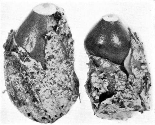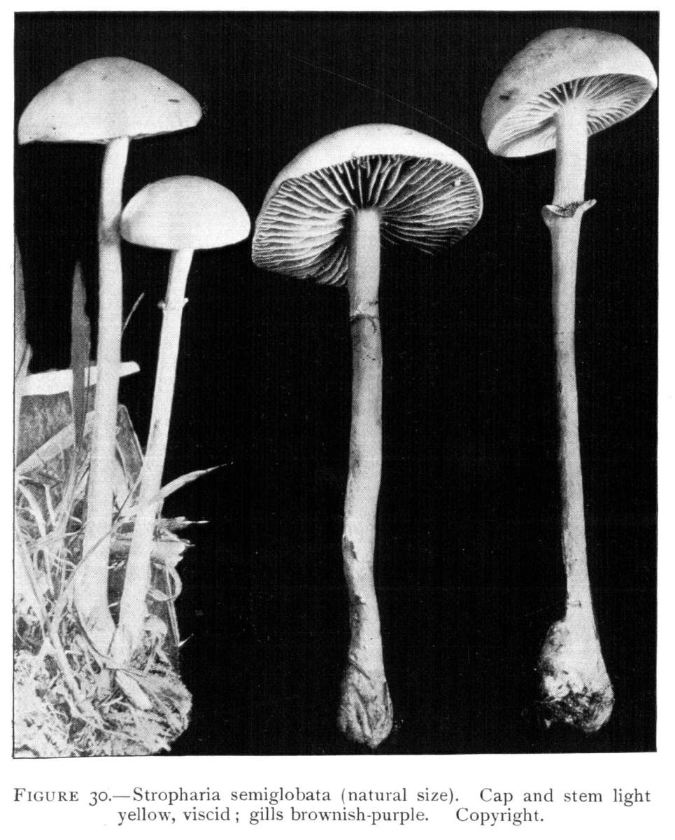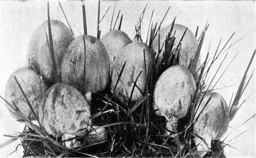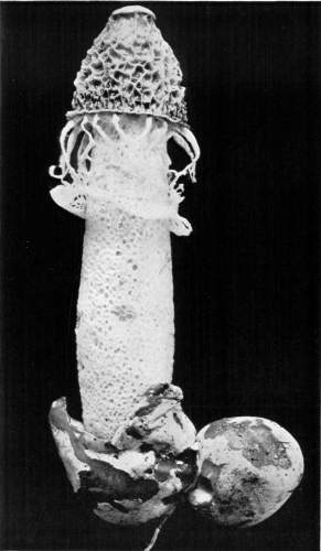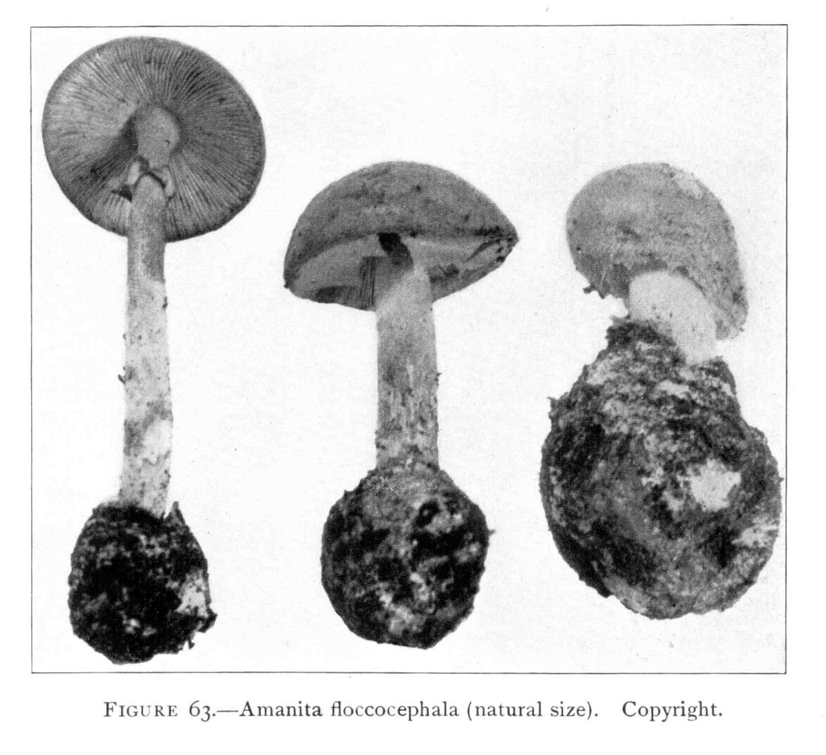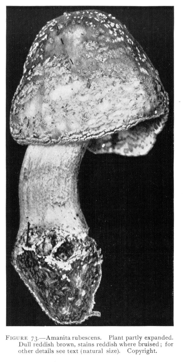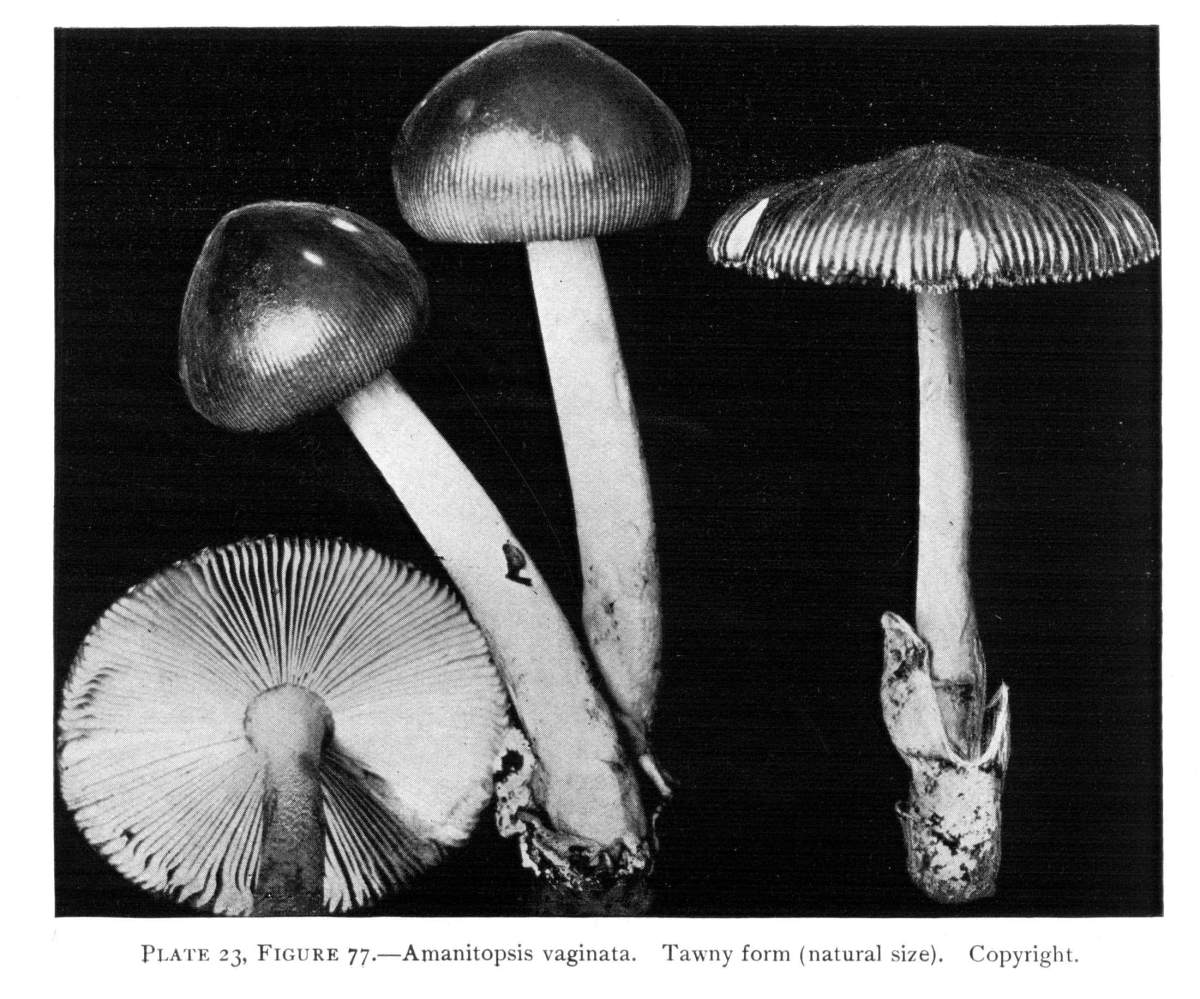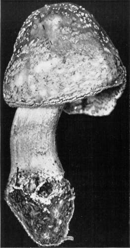 Parts Present in Other Mushrooms—The Volva.—Some other mushrooms, like the deadly Amanita (Amanita phalloides) and other species of the genus Amanita, have, in addition to the cap, gills, stem, and ring, a more or less well formed cup-like structure attached to the lower end of the stem, and from which the stem appears to spring. (Figs. 55, 72, etc.) This is the volva, sometimes popularly called the "death cup," or "poison cup." This structure is a very important one to observe, though its presence by no means indicates in all cases that the plant is poisonous. It will be described more in detail in treating of the genus Amanita, where the illustrations should also be consulted.