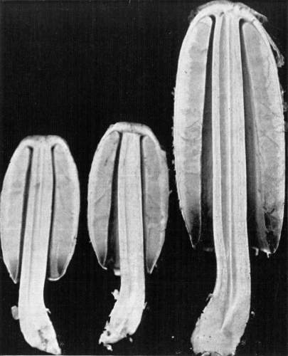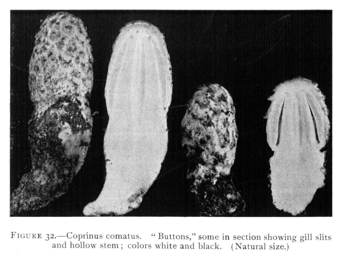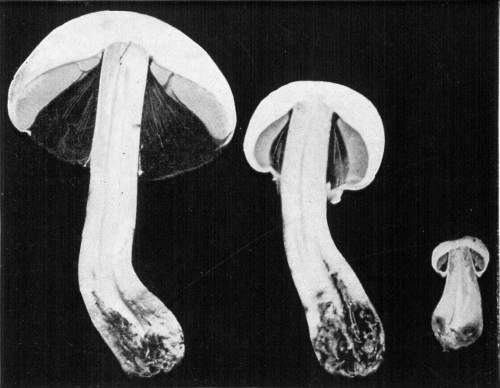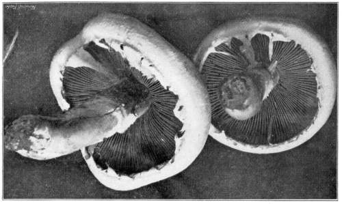 The Color of the Gills.—The color of the gills of the common mushroom varies in different stages of development. When very young the gills are white. But very soon the gills become pink in color, and during the button stage if the veil is broken this pink color is usually present unless the button is very small. The pink color soon changes to dark brown after the veil becomes ruptured, and when the plants are quite old they are nearly black. This dark color of the gills is due to the dark color of the spores, which are formed in such great numbers on the surface of the gills.
