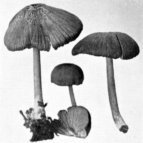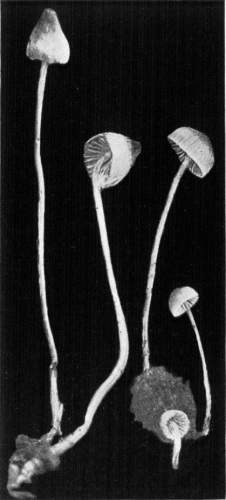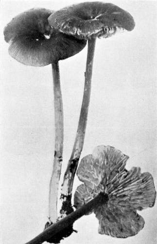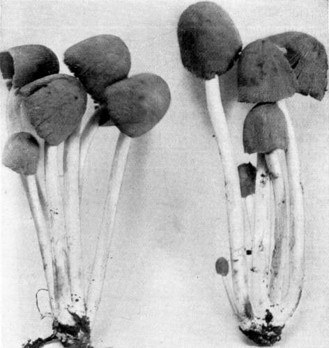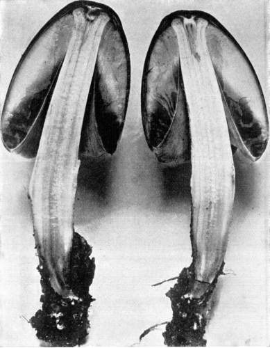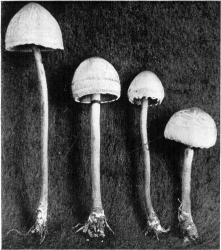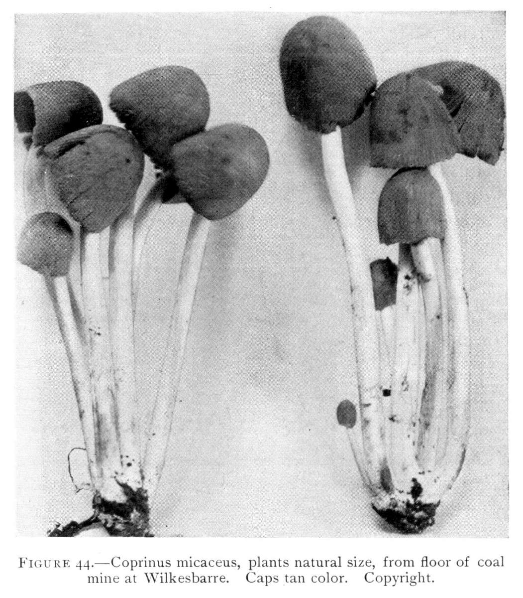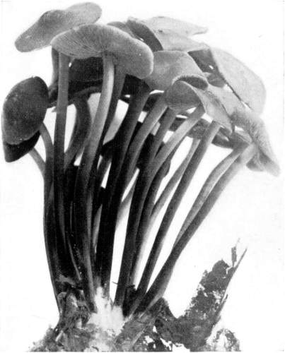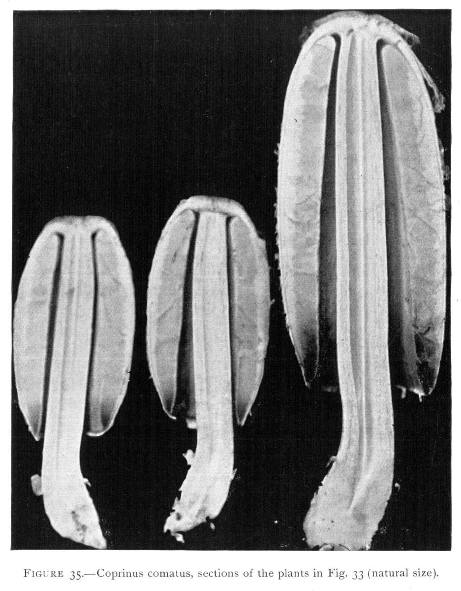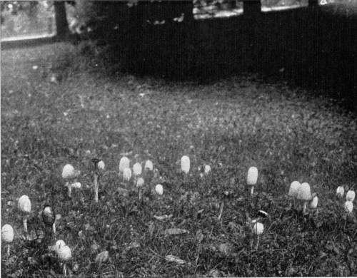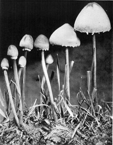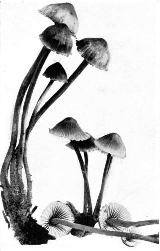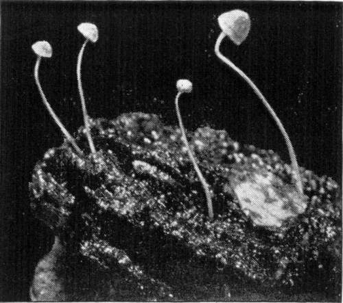 Interesting examples of the operation of this law are sometimes met with in abandoned coal mines, or more frequently in the woods. In abandoned mines the mushrooms sometimes grow from the mycelium which spreads out on the rock roof overhead. The rock roof prevents the plant from growing upright, and in growing laterally the weight of the plant together with the slight hold it can obtain on the solid rock causes it to hang downward. The end of the stem then curves upward so that the pileus is brought in a horizontal position. I have seen this in the case of Coprinus micaceus several times.