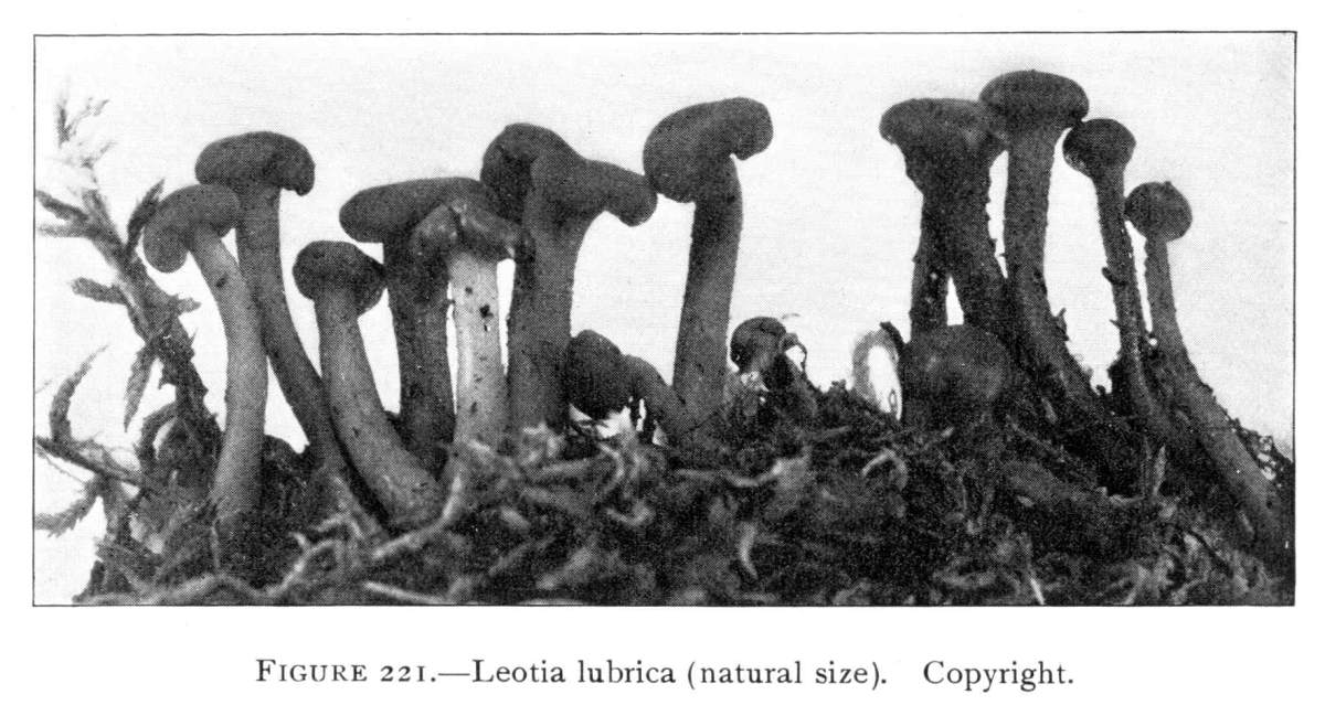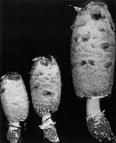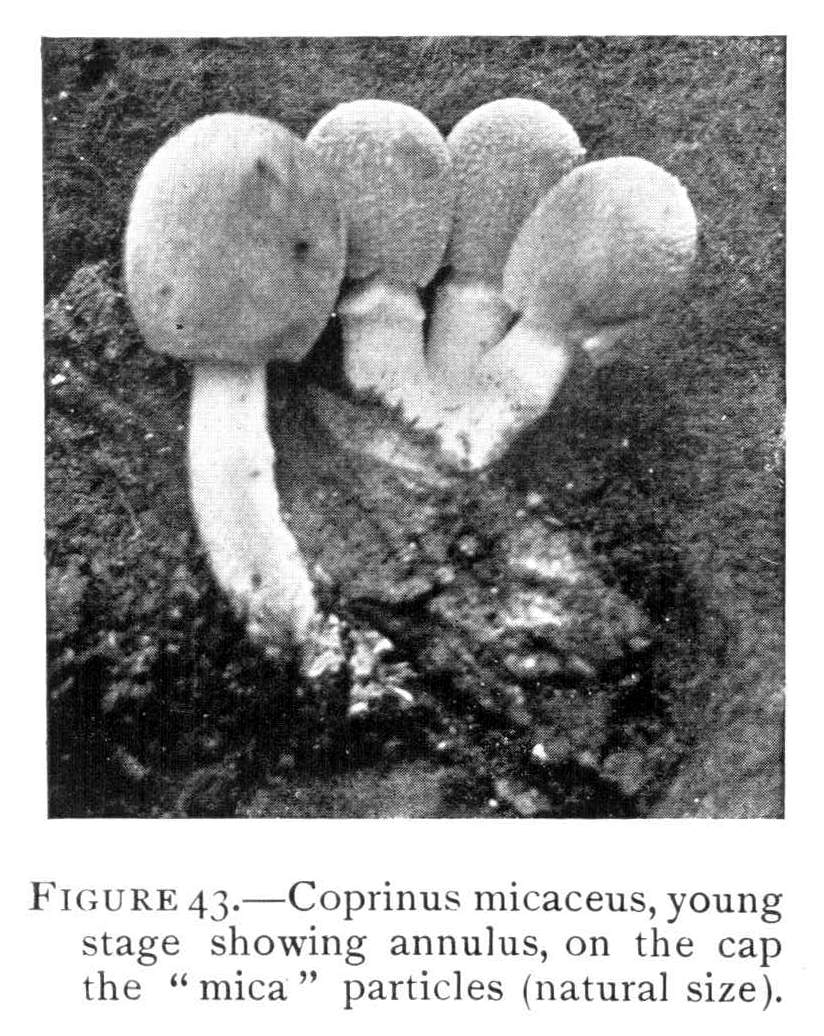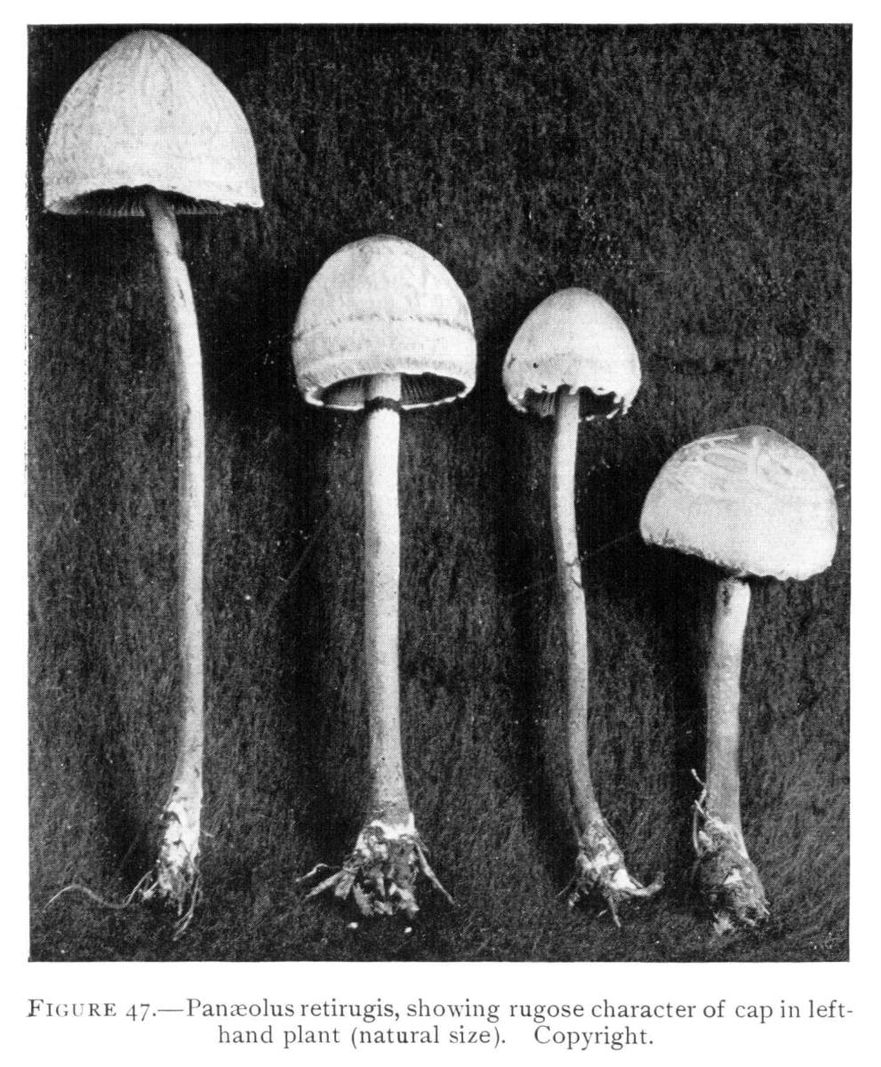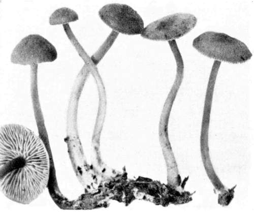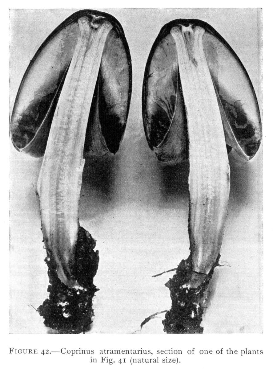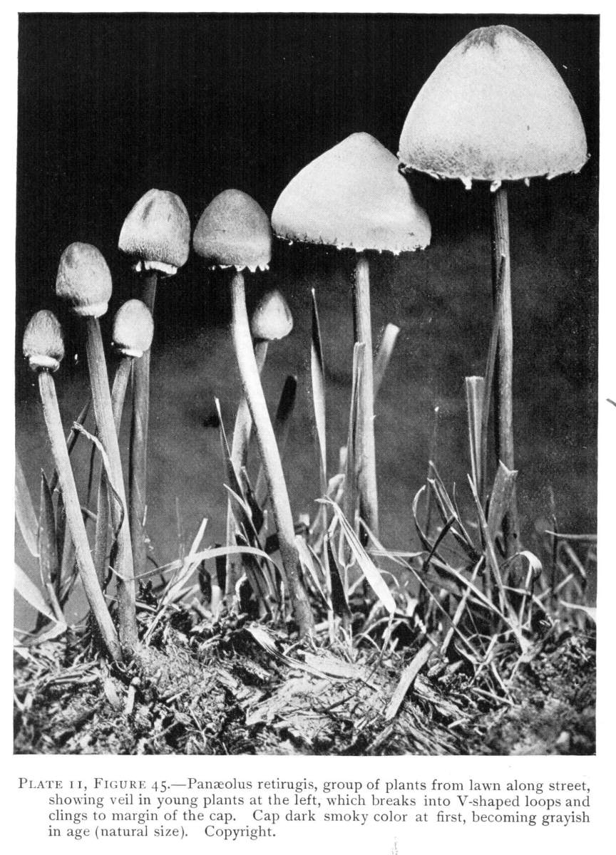 Interesting examples of the operation of this law are sometimes met with in abandoned coal mines, or more frequently in the woods. In abandoned mines the mushrooms sometimes grow from the mycelium which spreads out on the rock roof overhead. The rock roof prevents the plant from growing upright, and in growing laterally the weight of the plant together with the slight hold it can obtain on the solid rock causes it to hang downward. The end of the stem then curves upward so that the pileus is brought in a horizontal position. I have seen this in the case of Coprinus micaceus several times.