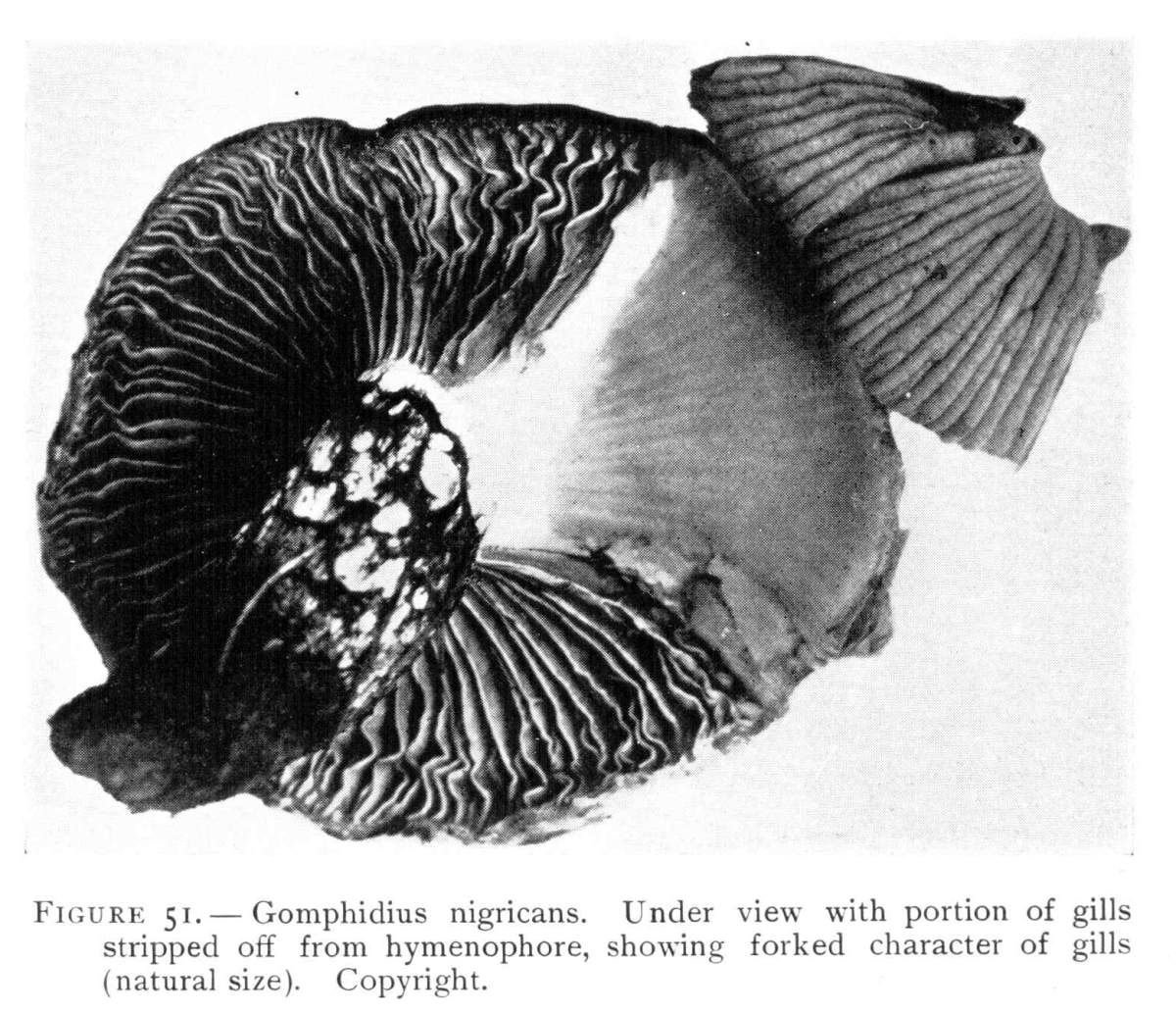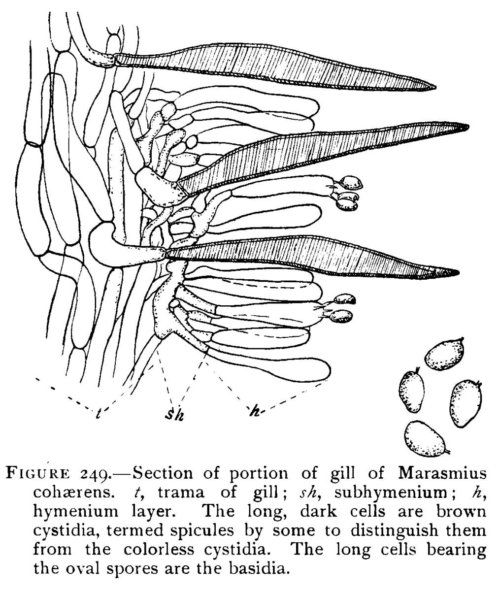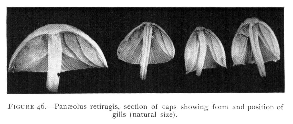 The Gills.—On the under side of the pileus are radiating plates, the gills, or lamellæ (sing. lamella). These in shape resemble somewhat a knife blade. They are very thin and delicate. When young they are pink in color, but in age change to a dark purple brown, or nearly black color, due to the immense number of spores that are borne on their surfaces. The gills do not quite reach the stem, but are rounded at this end and so curve up to the cap. The triangular spaces between the longer ones are occupied by successively shorter gills, so that the combined surface of all the gills is very great.