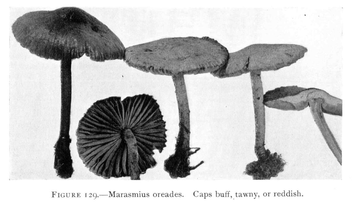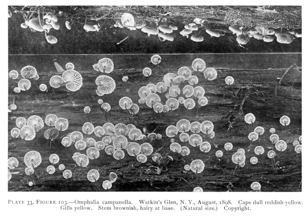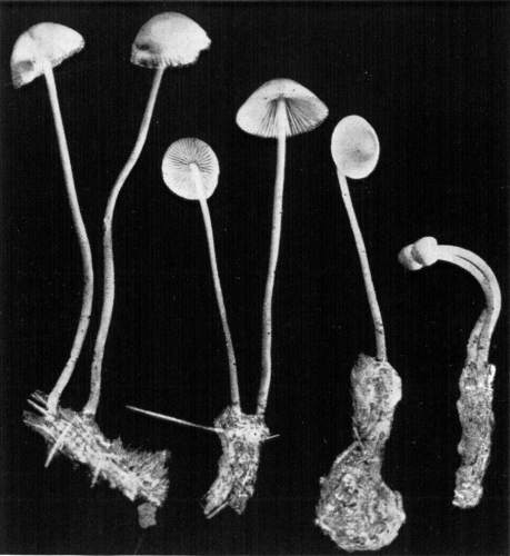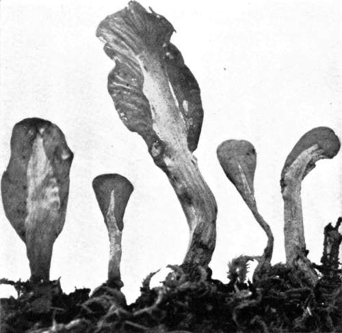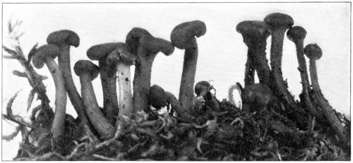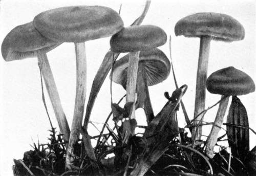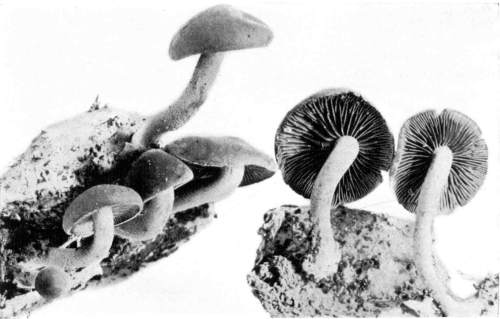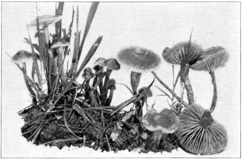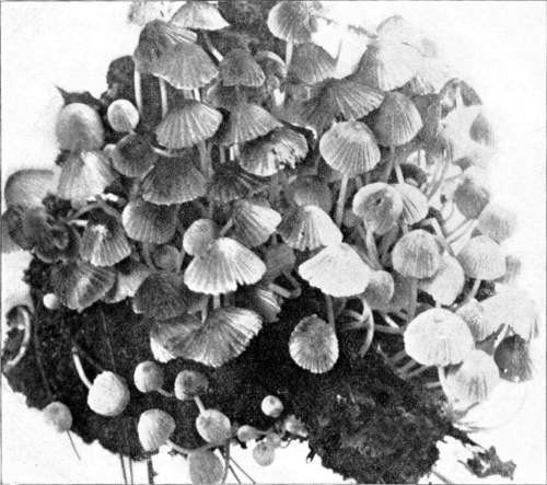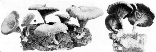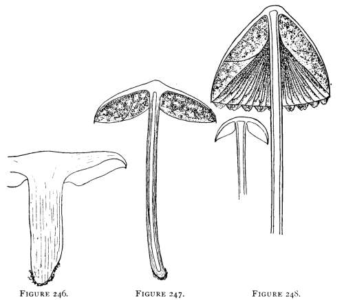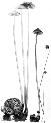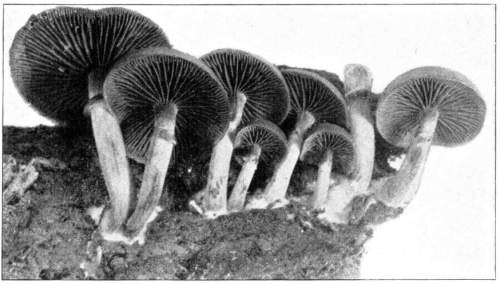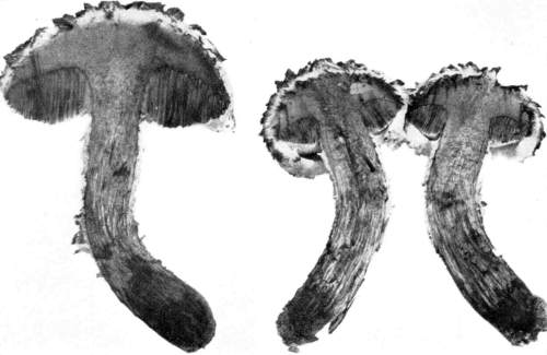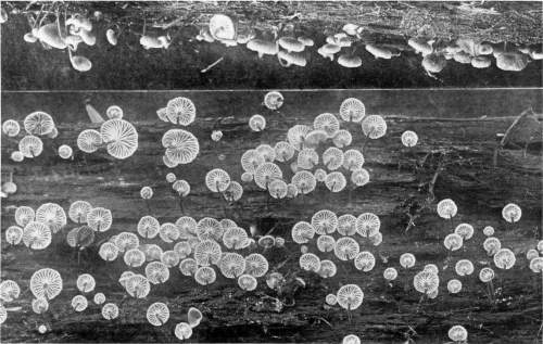 Direction in Growth of Mushrooms.—The direction of growth which these fungi take forms an interesting question for study. The common mushroom, the Agaricus, the amanitas, and other central stemmed species grow usually in an upright fashion; that is, the stem is erect. The cap then, when it expands, stands so that it is parallel with the surface of the earth. Where the cap does not fully expand, as in the campanulate forms, the pileus is still oriented horizontally, that is, with the gills downward. Even in such species, where the stems are ascending, the upper end of the stem curves so that the cap occupies the usual position with reference to the surface of the earth. This is beautifully shown in the case of those plants which grow on the side of trunks or stumps, where the stems could not well grow directly upward without hugging close to the side of the trunk, and then there would not be room for the expansion of the cap. This is well shown in a number of species of Mycena.