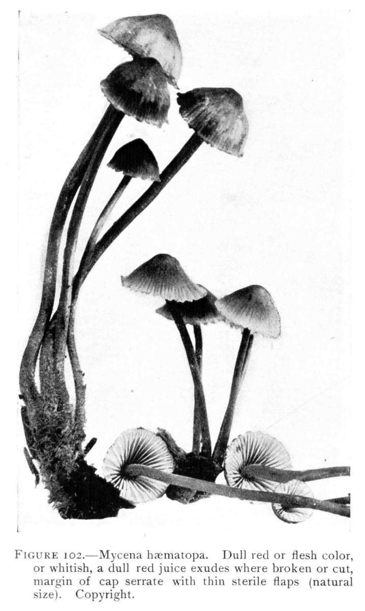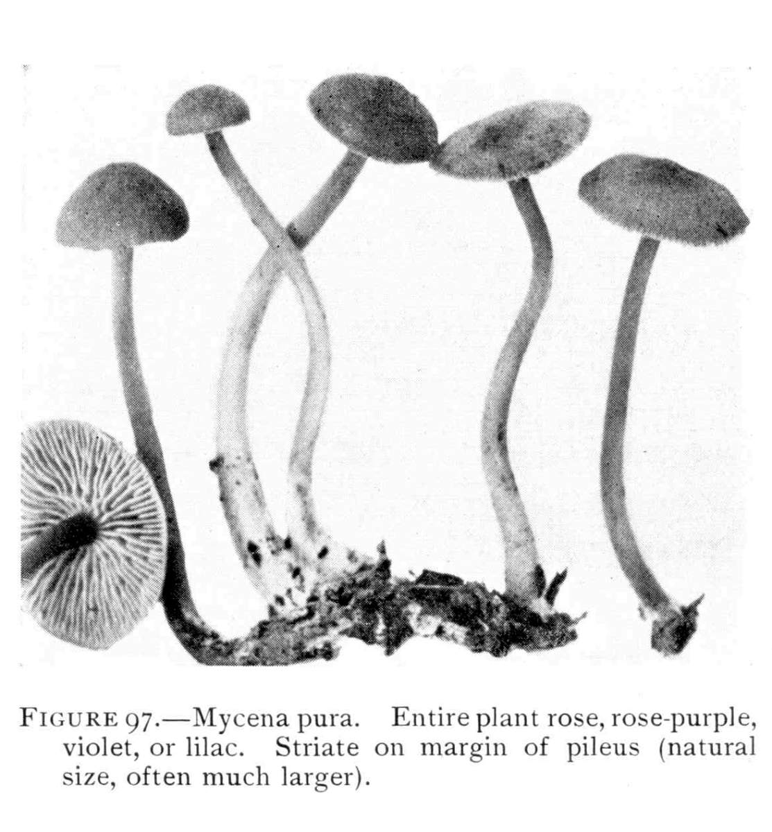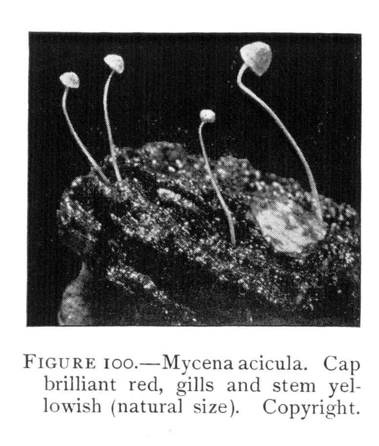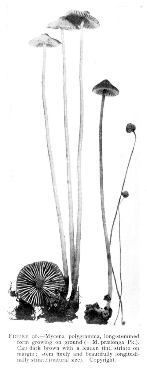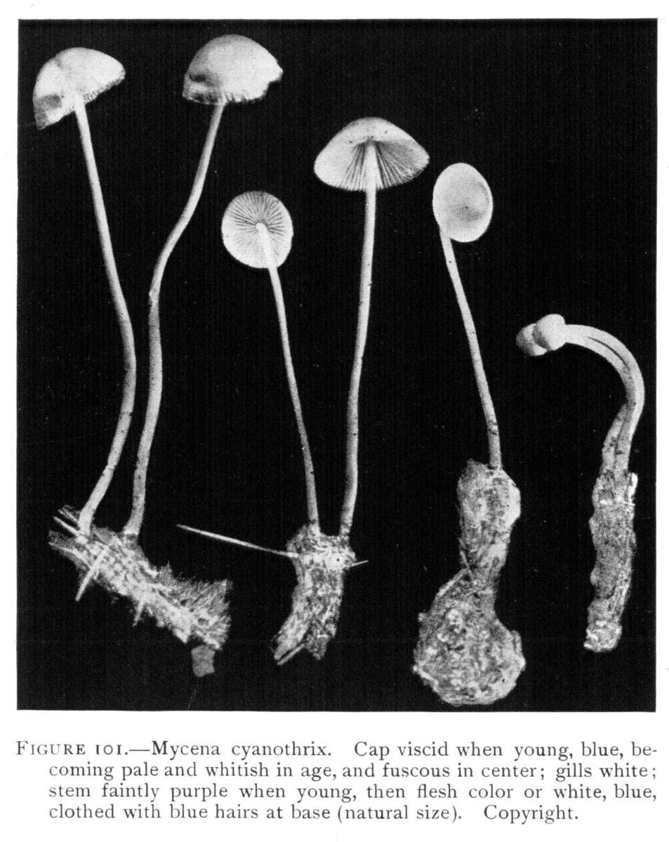 Direction in Growth of Mushrooms.—The direction of growth which these fungi take forms an interesting question for study. The common mushroom, the Agaricus, the amanitas, and other central stemmed species grow usually in an upright fashion; that is, the stem is erect. The cap then, when it expands, stands so that it is parallel with the surface of the earth. Where the cap does not fully expand, as in the campanulate forms, the pileus is still oriented horizontally, that is, with the gills downward. Even in such species, where the stems are ascending, the upper end of the stem curves so that the cap occupies the usual position with reference to the surface of the earth. This is beautifully shown in the case of those plants which grow on the side of trunks or stumps, where the stems could not well grow directly upward without hugging close to the side of the trunk, and then there would not be room for the expansion of the cap. This is well shown in a number of species of Mycena.