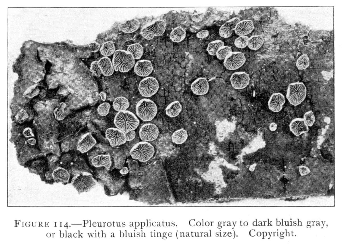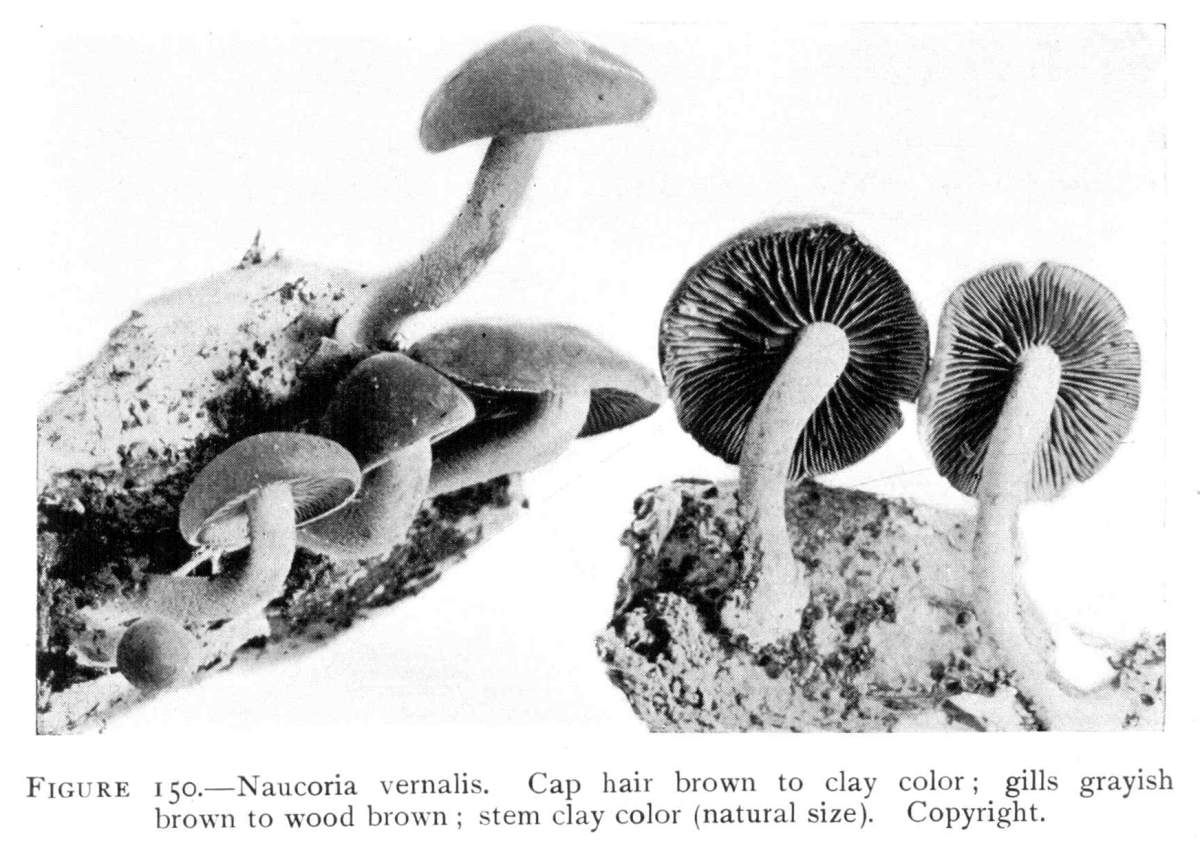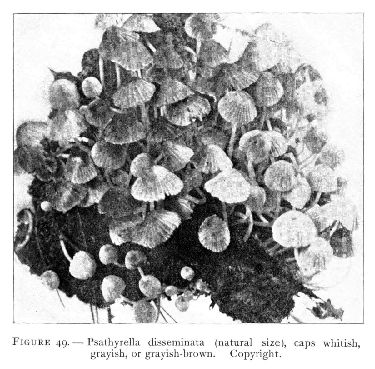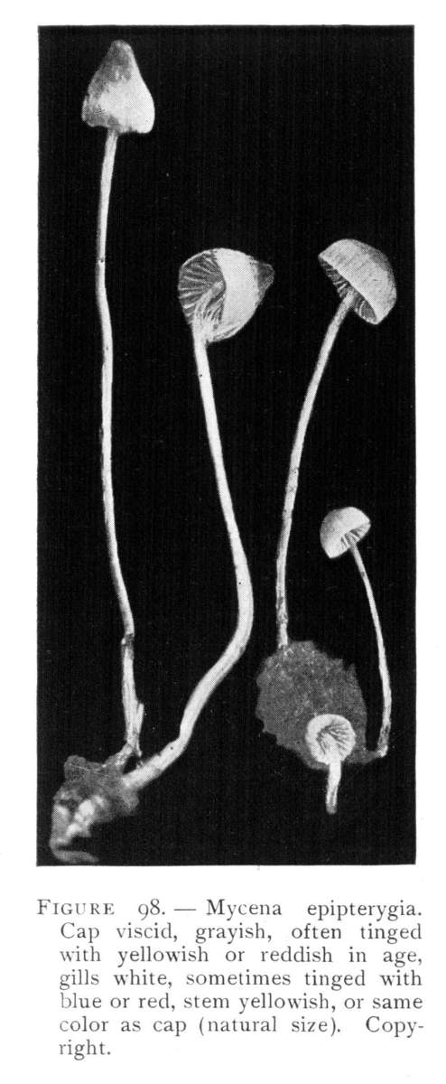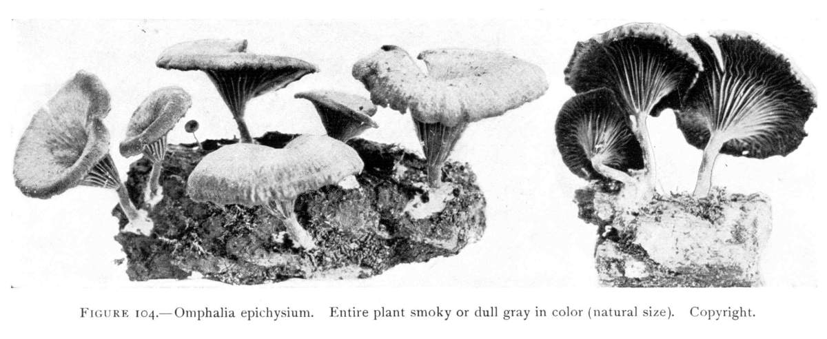 Direction in Growth of Mushrooms.—The direction of growth which these fungi take forms an interesting question for study. The common mushroom, the Agaricus, the amanitas, and other central stemmed species grow usually in an upright fashion; that is, the stem is erect. The cap then, when it expands, stands so that it is parallel with the surface of the earth. Where the cap does not fully expand, as in the campanulate forms, the pileus is still oriented horizontally, that is, with the gills downward. Even in such species, where the stems are ascending, the upper end of the stem curves so that the cap occupies the usual position with reference to the surface of the earth. This is beautifully shown in the case of those plants which grow on the side of trunks or stumps, where the stems could not well grow directly upward without hugging close to the side of the trunk, and then there would not be room for the expansion of the cap. This is well shown in a number of species of Mycena.