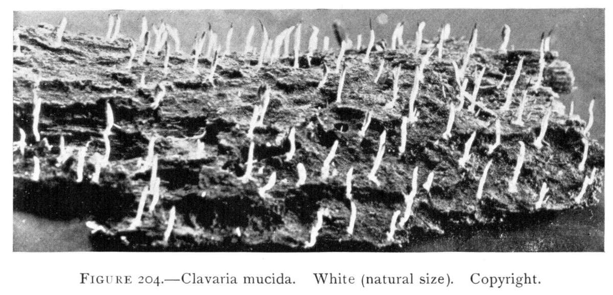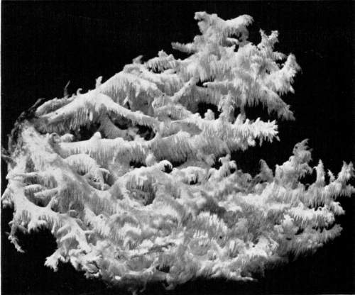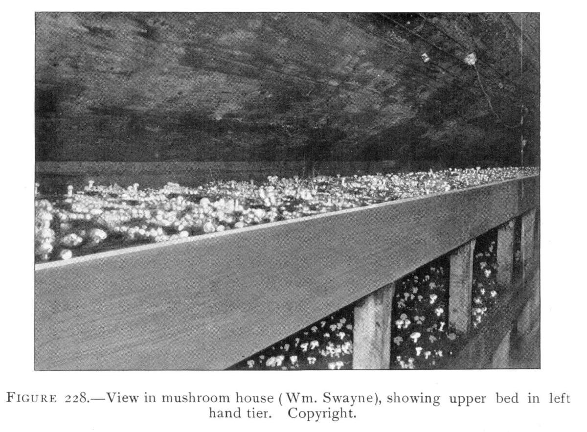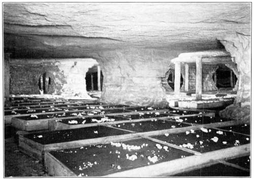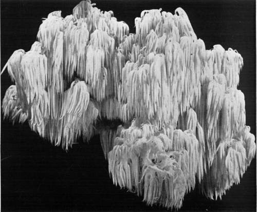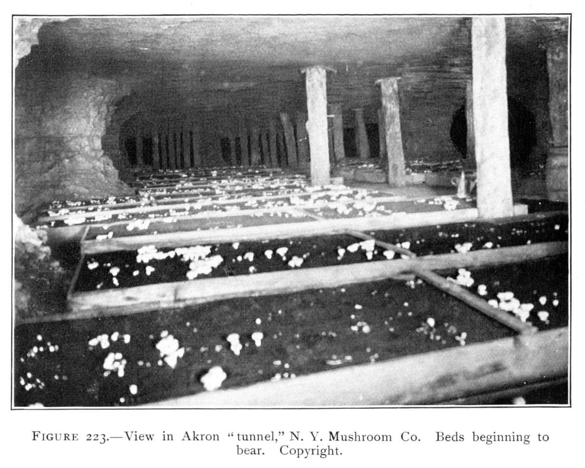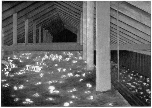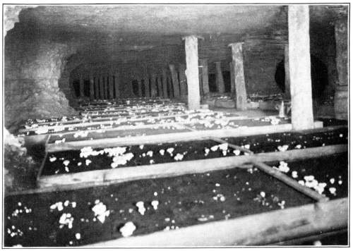 On the posts or wood props used to support the rock roof above, the mycelium grows in great profusion also, often covering them with a thick white mantle, or draping them with a fabric of elegant texture. From the upper ends of the props it spreads out over the rock roof above for several feet in circumference, and beautiful white pendulous tassels remind one of stalactites.